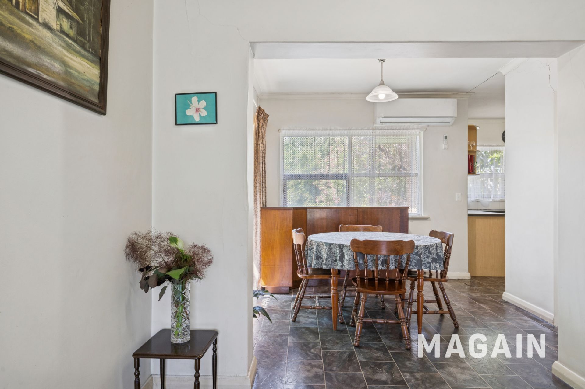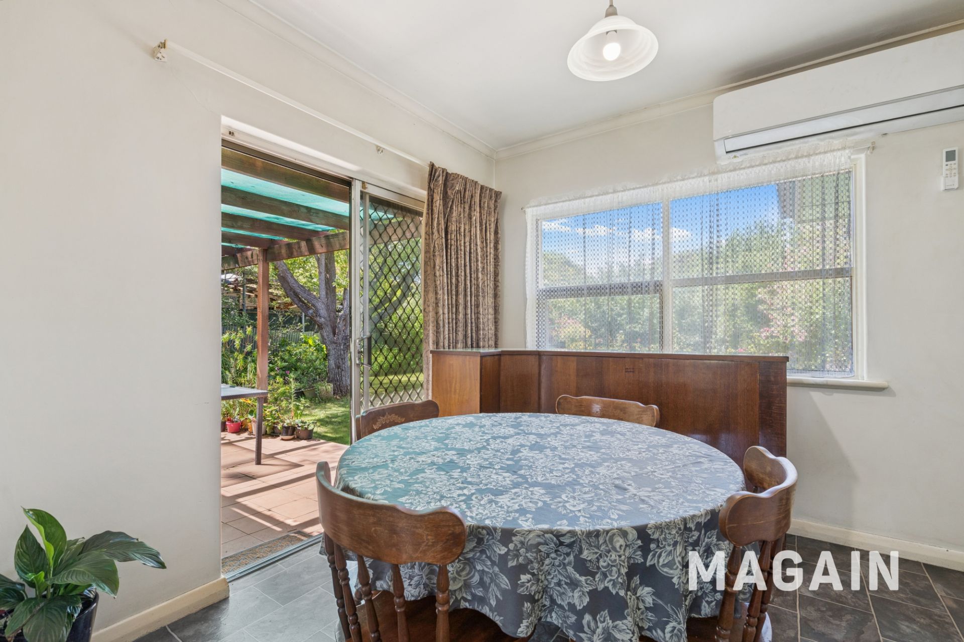 Continuing through the home, you'll discover the open living and dining area, which connects effortlessly to both the kitchen and the outdoor verandah, an ideal layout for entertaining. The dining space easily accommodates the whole family for shared meals, while a split-system air conditioner provides year-round comfort.