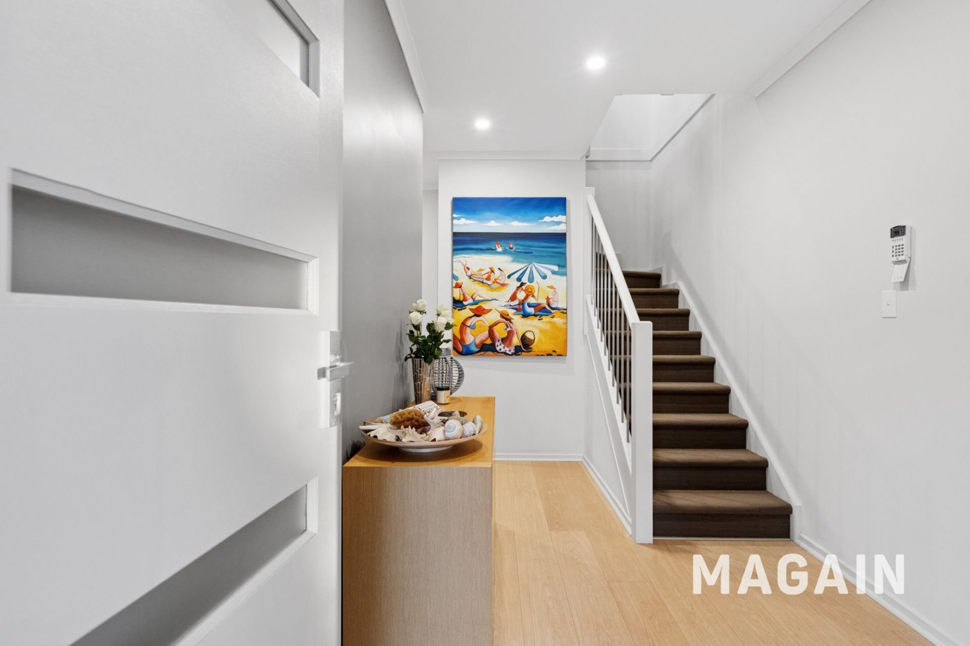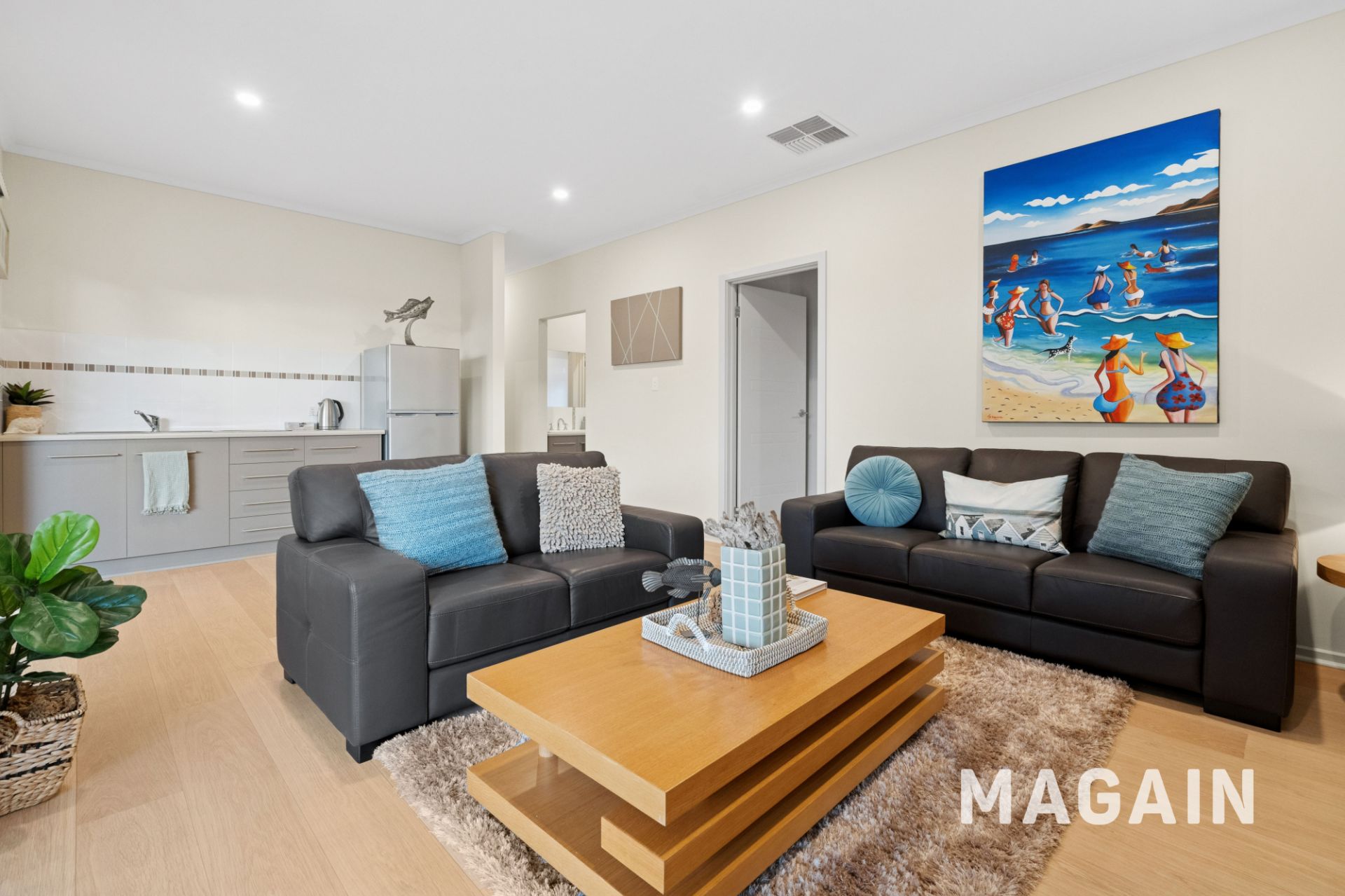 Downstairs, three additional bedrooms provide flexible accommodation options, serviced by a family bathroom and a convenient kitchenette, perfect for guests, teenagers, or extended family. A large laundry/mudroom adds further practicality, ideal for rinsing off sandy feet after a day at the beach, and the home features a ducted vacuuming system for effortless cleaning throughout.