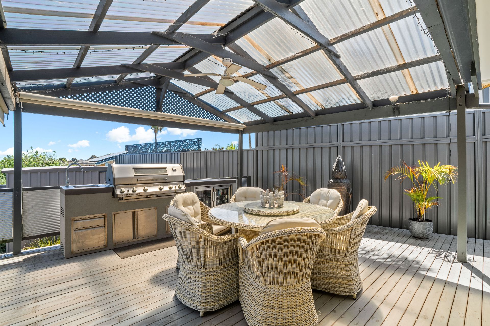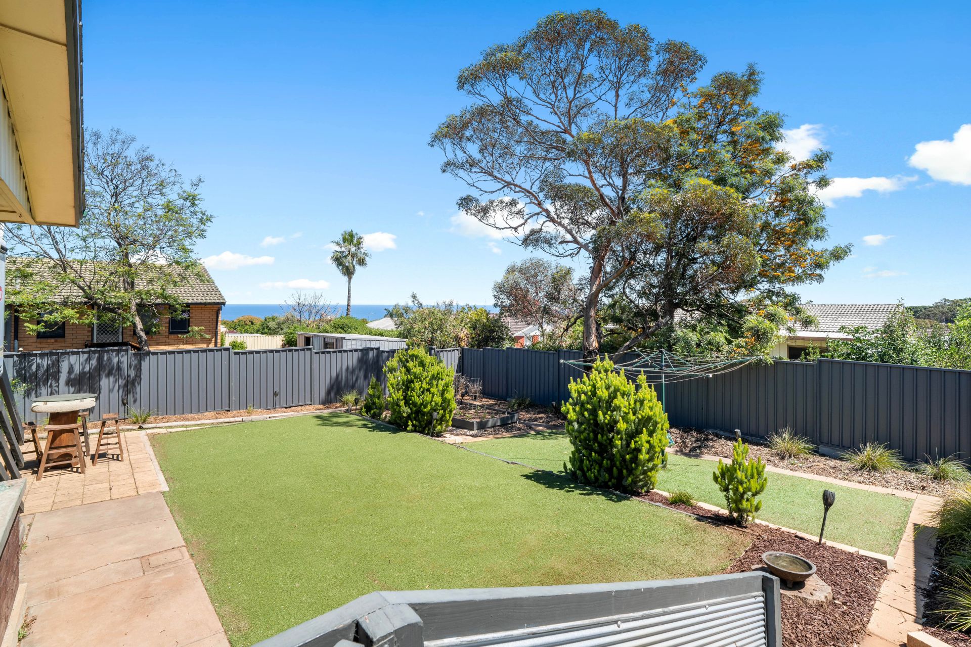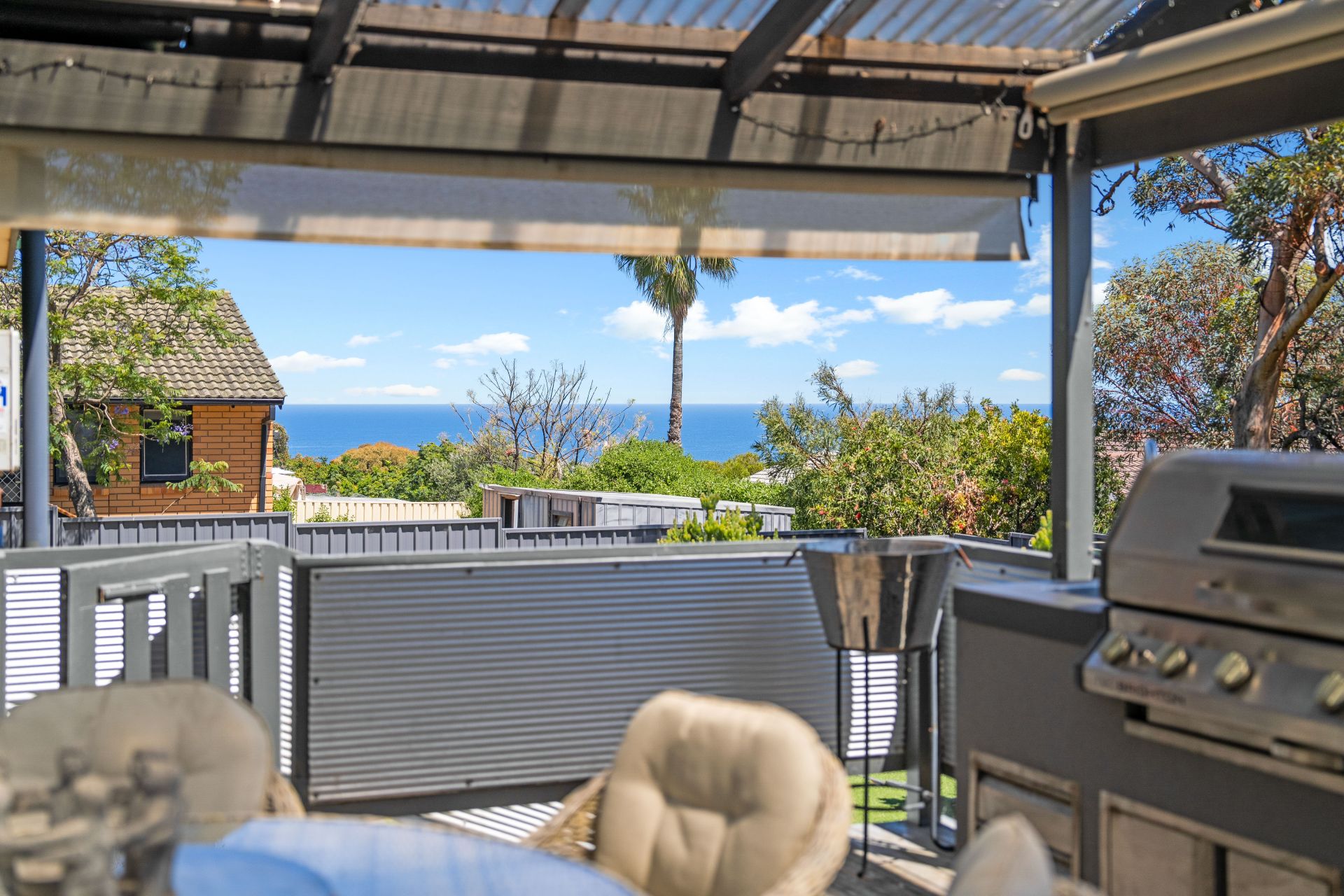 Glass sliding doors from the formal dining area invite you to the rear yard, where an entertainer's paradise awaits. A spacious decked entertaining area with an outdoor kitchen, raised over the yard, and sheltered by a pitched roof pergola, provides the perfect setting for year-round gatherings, while the spectacular ocean views provide an exquisite background. The good-sized rear yard with low maintenance artificial lawn, offers ample space for kids and pets to play, with a well-sized shed with concrete floor awaiting the handyman of the family.