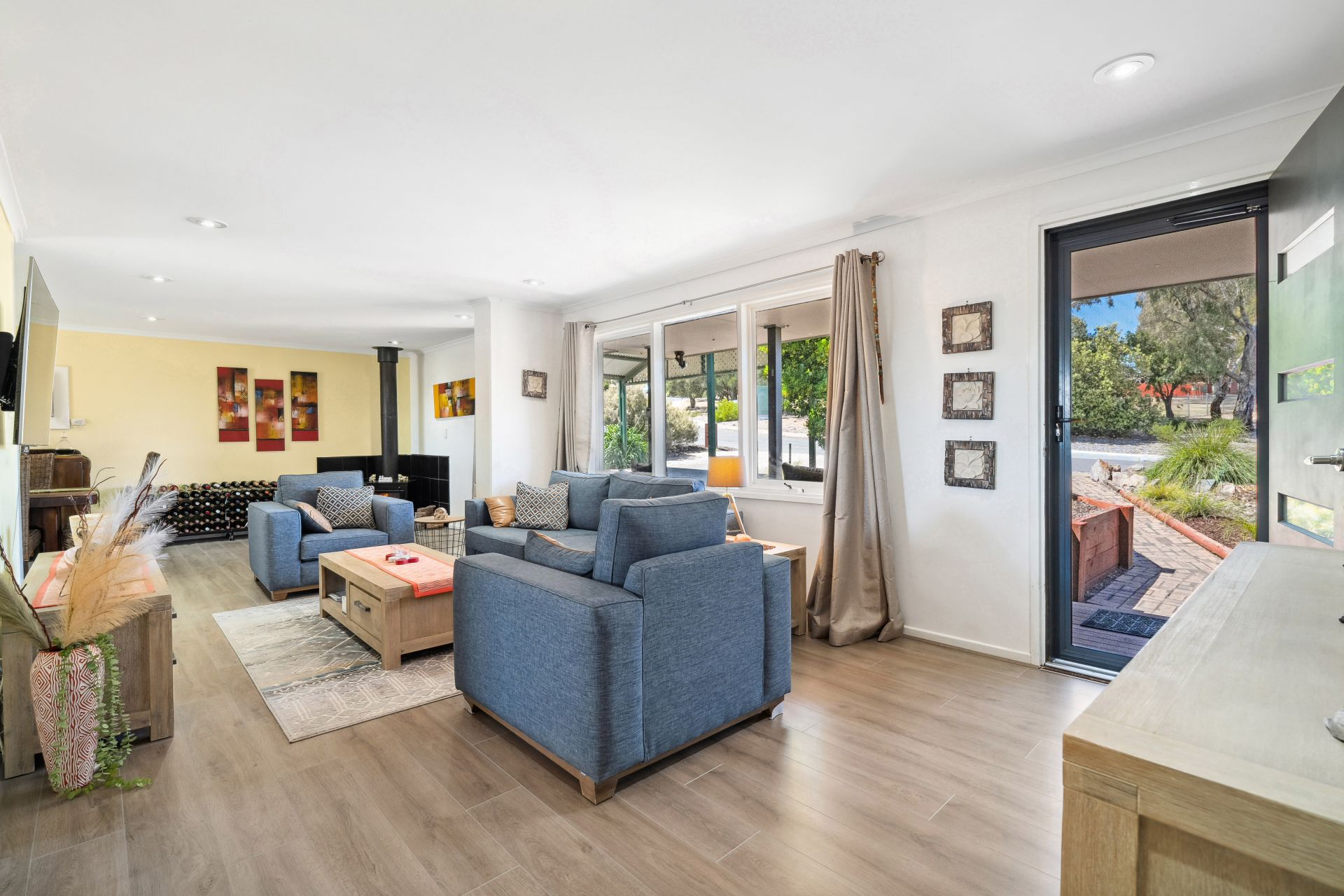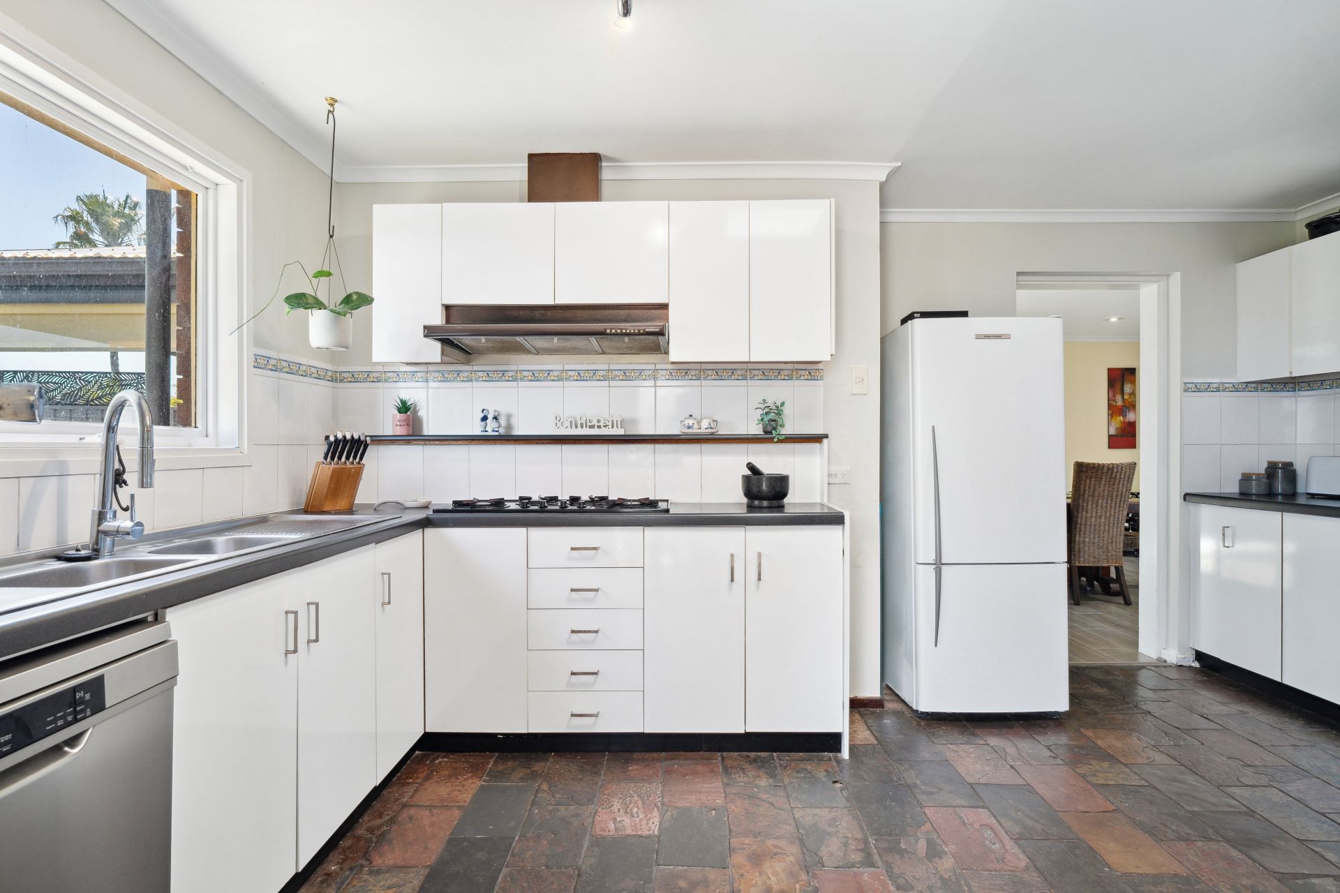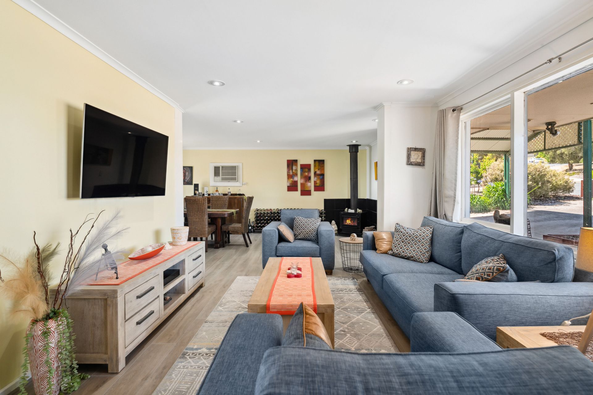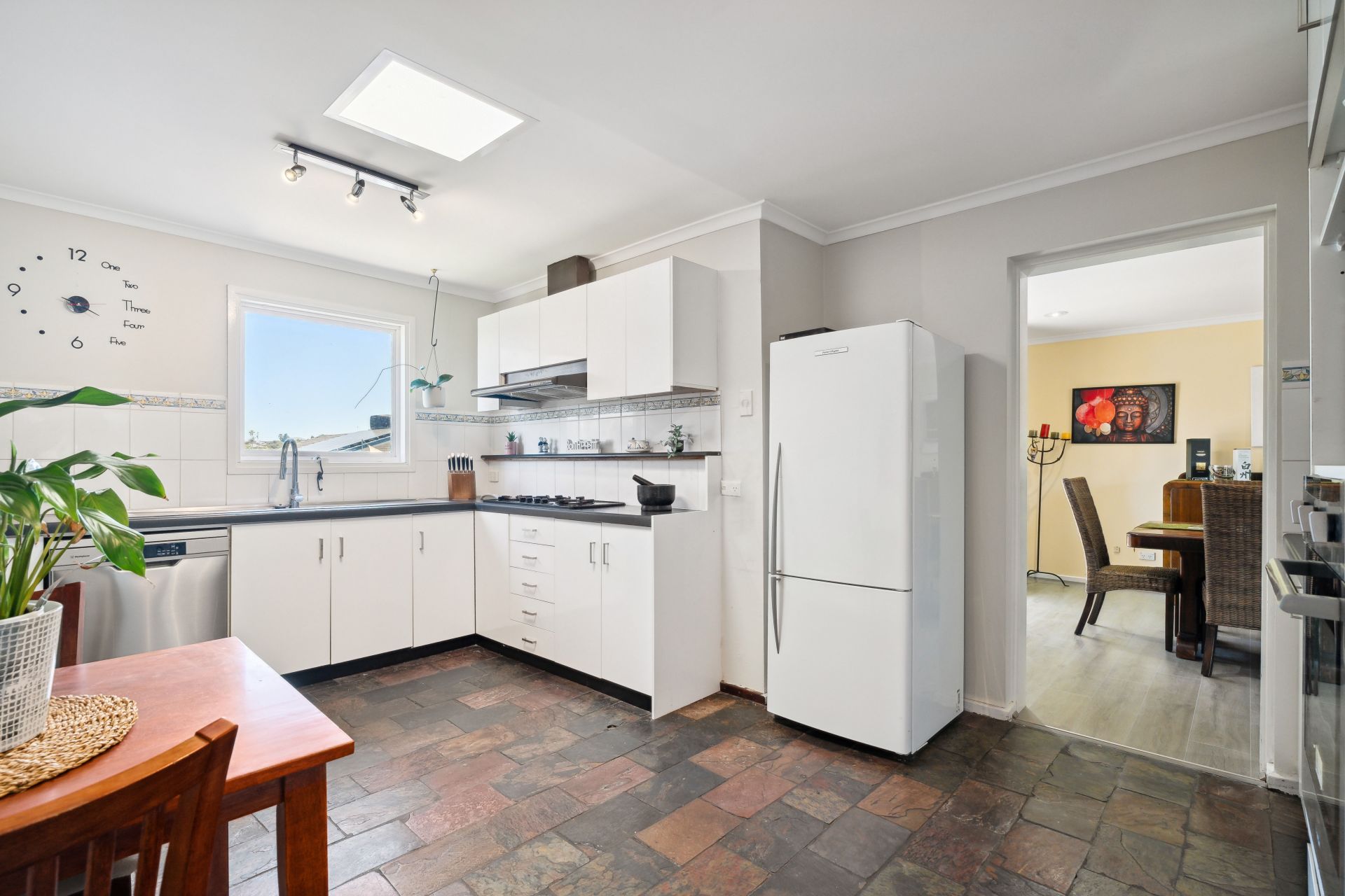 The entrance guides you straight into the heart of the home, where an L-shaped living and dining area with a cozy combustion heater, seamlessly integrates with the kitchen with combined casual meals. This culinary haven boasts quality appliances, including a gas cooktop and dishwasher, and features a skylight bathing the space in natural light.