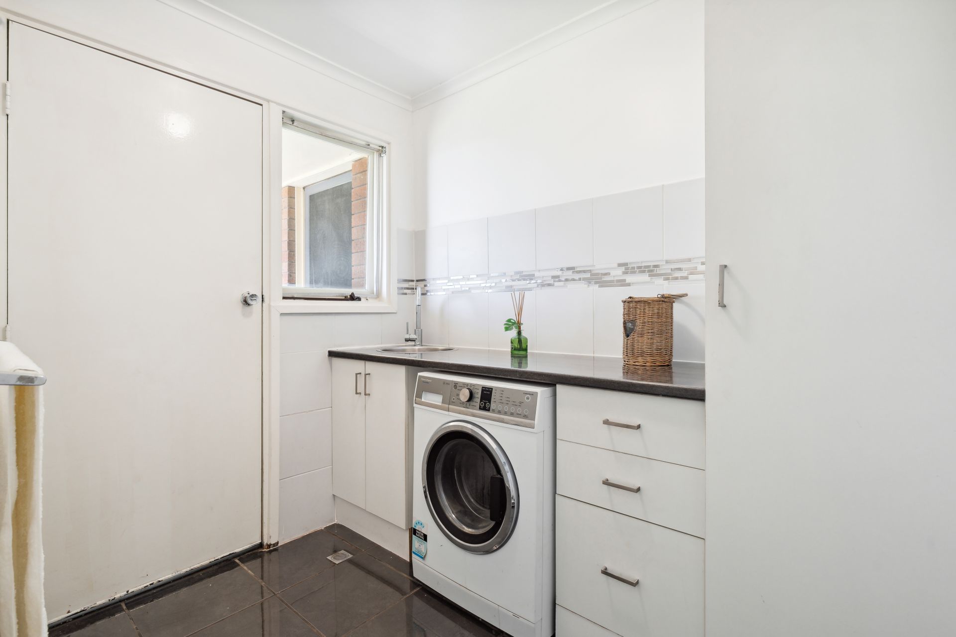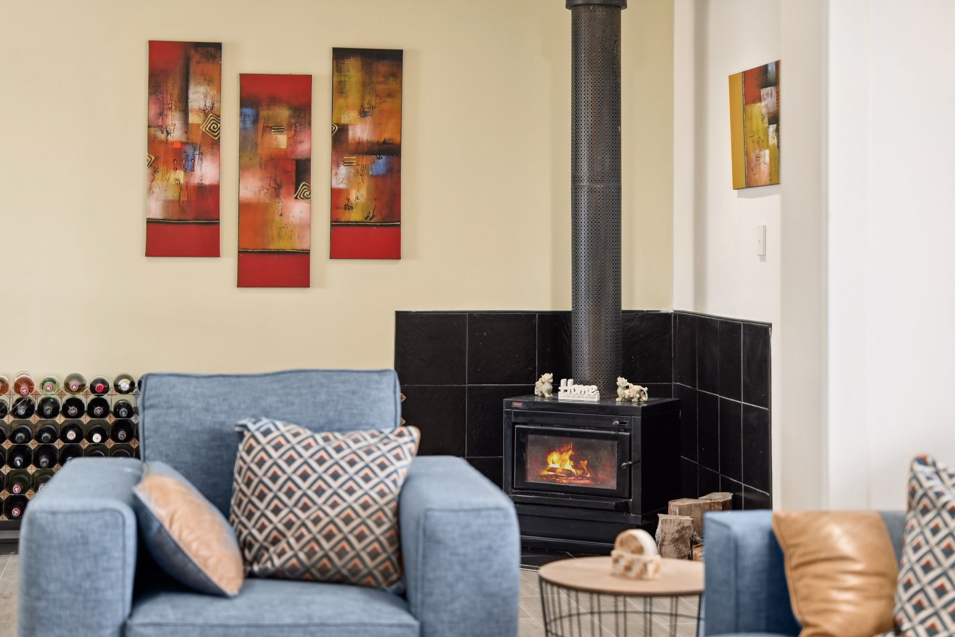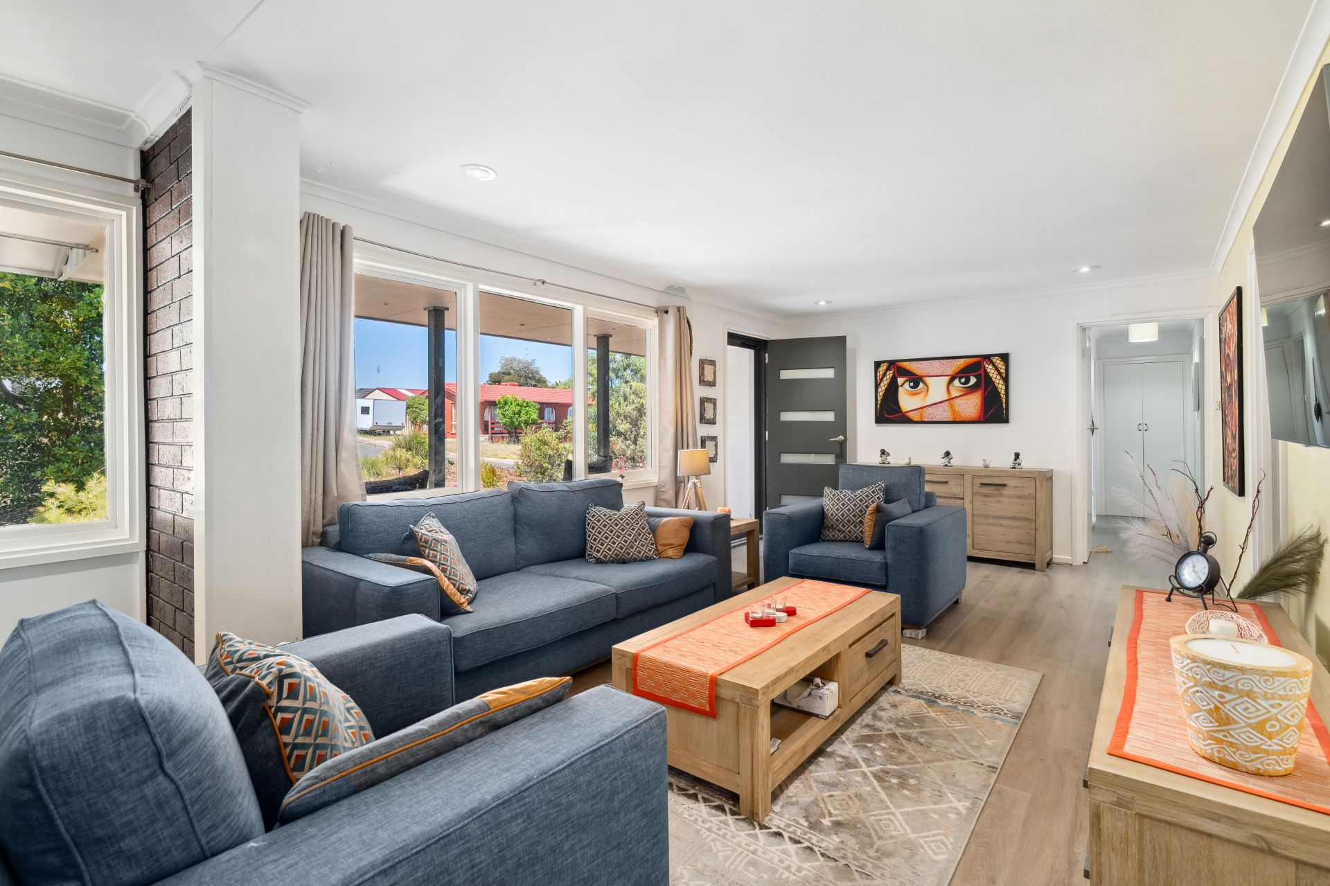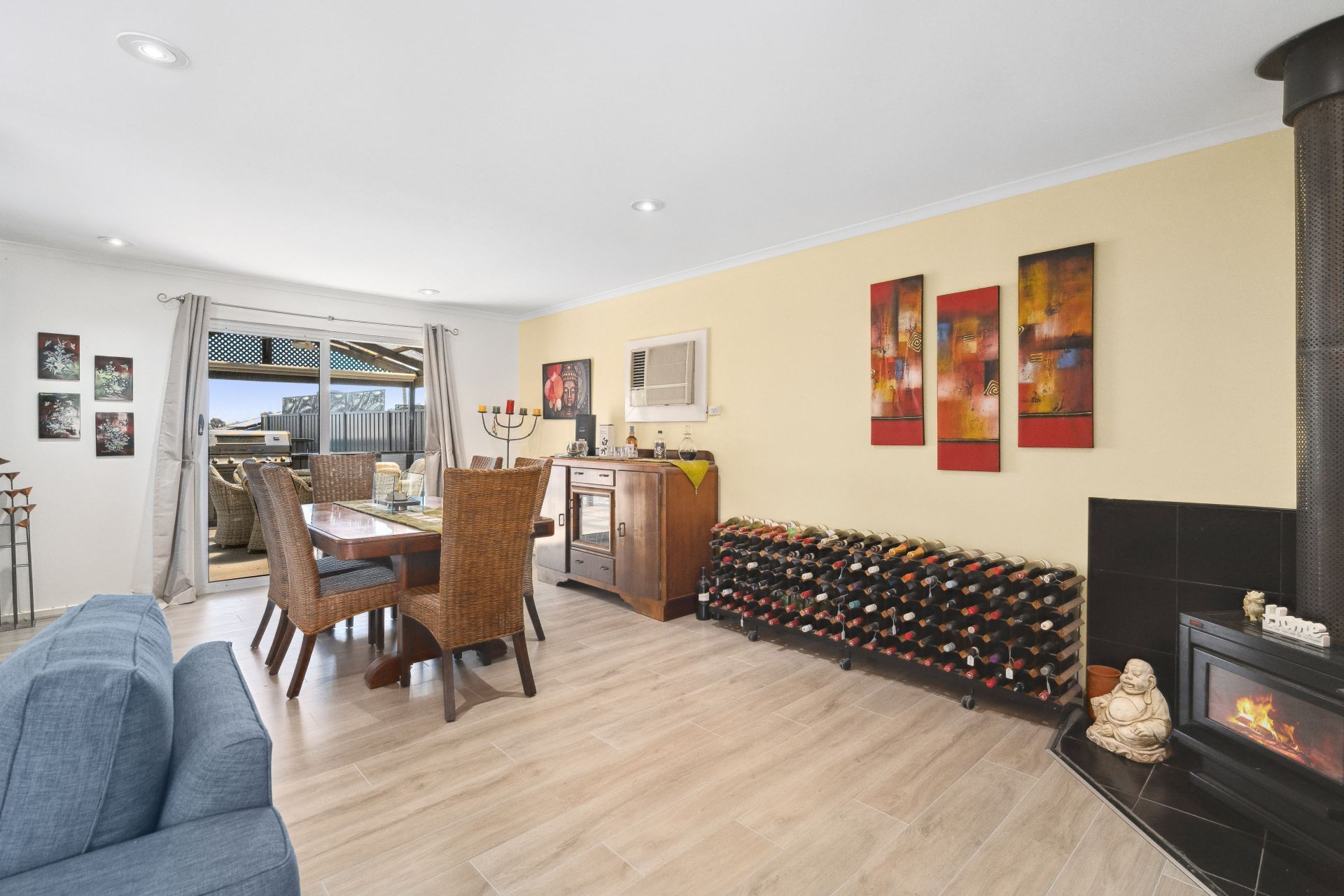 The entrance guides you straight into the heart of the home, where an L-shaped living and dining area with a cozy combustion heater, seamlessly integrates with the kitchen with combined casual meals. This culinary haven boasts quality appliances, including a gas cooktop and dishwasher, and features a skylight bathing the space in natural light.