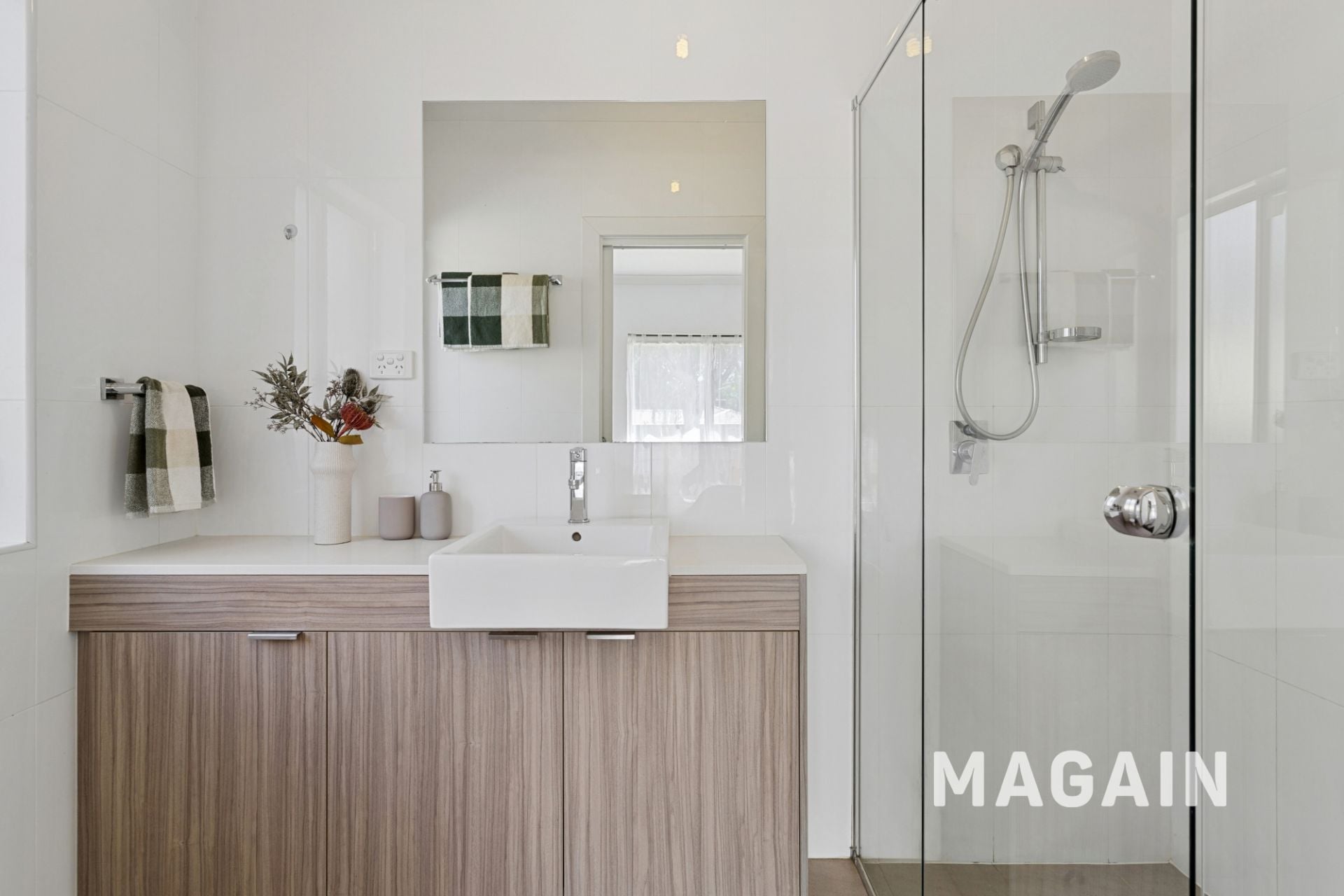 Accommodation includes two well-sized bedrooms, both fitted with built-in robes. The spacious main bedroom is positioned toward the front of the home and benefits from its own private ensuite, while bedroom two sits nearby and has easy access to the central bathroom. The main bathroom includes a bath, shower, toilet and vanity. Adjacent is the laundry, complete with a built-in cupboard for additional storage.
