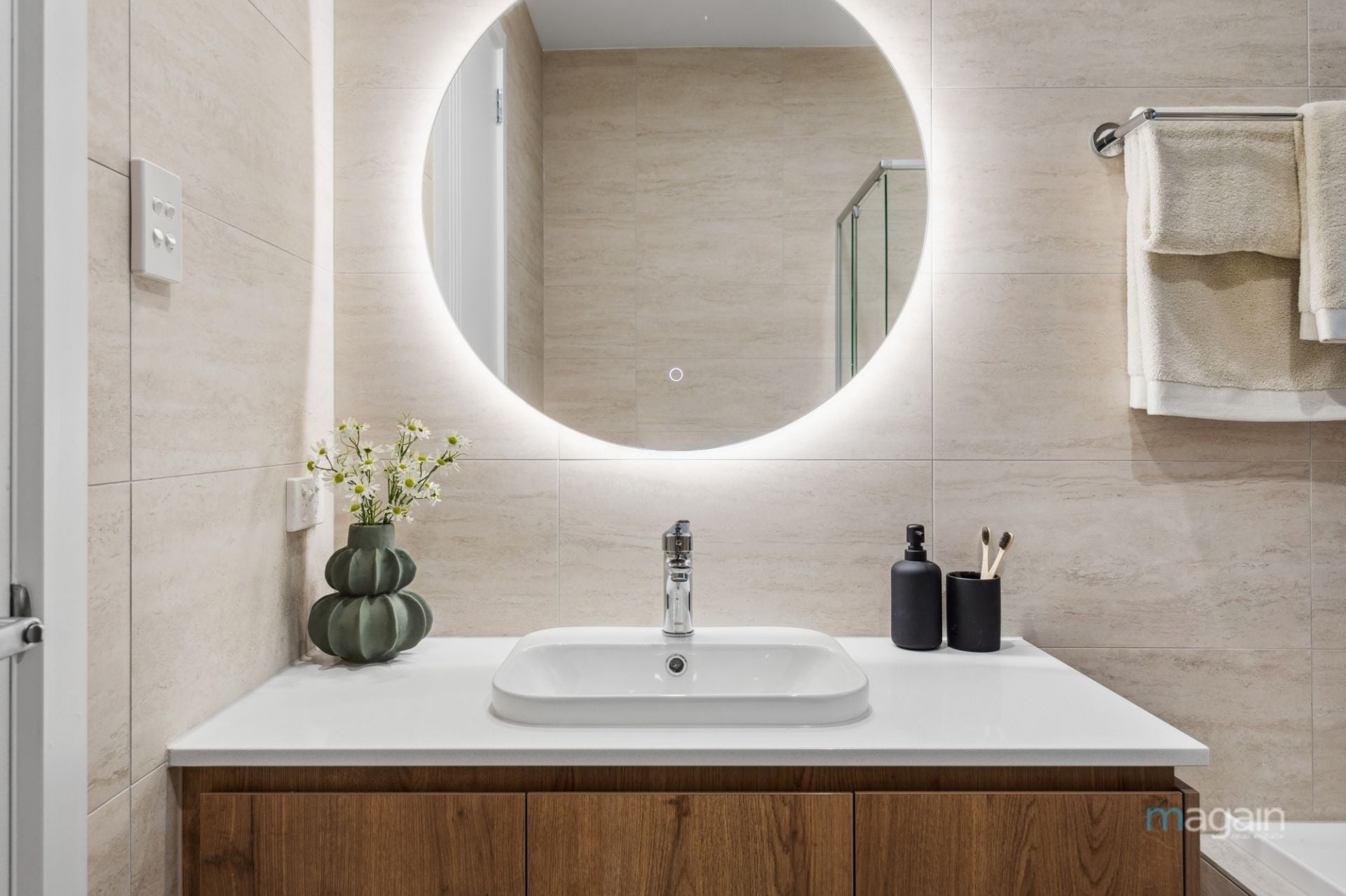 The floorplan has been thoughtfully designed for everyday comfort and convenience, with bedrooms 2 & 3 adjacent to the main bathroom while the master is serviced by an ensuite. Both bathrooms are elegantly appointed with floor-to-ceiling tiles, a walk-in shower with built-in niches, stone vanity, and a chic backlit mirror. The main bathroom also has a relaxing bathtub, ideal for unwinding at the end of the day.