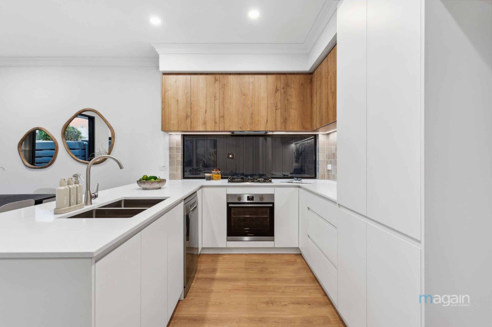 The kitchen is both stylish and practical, boasting sleek white cabinetry, elegant stone benchtops, and quality stainless steel appliances, including a 4-burner gas cooktop with rangehood, oven, and dishwasher. A double sink, dedicated fridge space, spacious pantry, and breakfast bar complete the setup, perfect for casual dining or social gatherings.