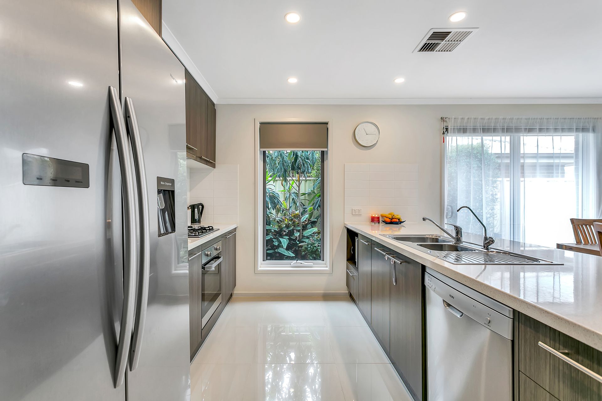 The modern kitchen boasts an abundance of bench, cupboard and storage. Complete with gas cook top, oven, dishwasher, rangehood and pantry it's sure to impress the chef of the home. The kitchen over looks the dining and lounge area and the abundance of natural light bounces off of the porcelain tiles.
