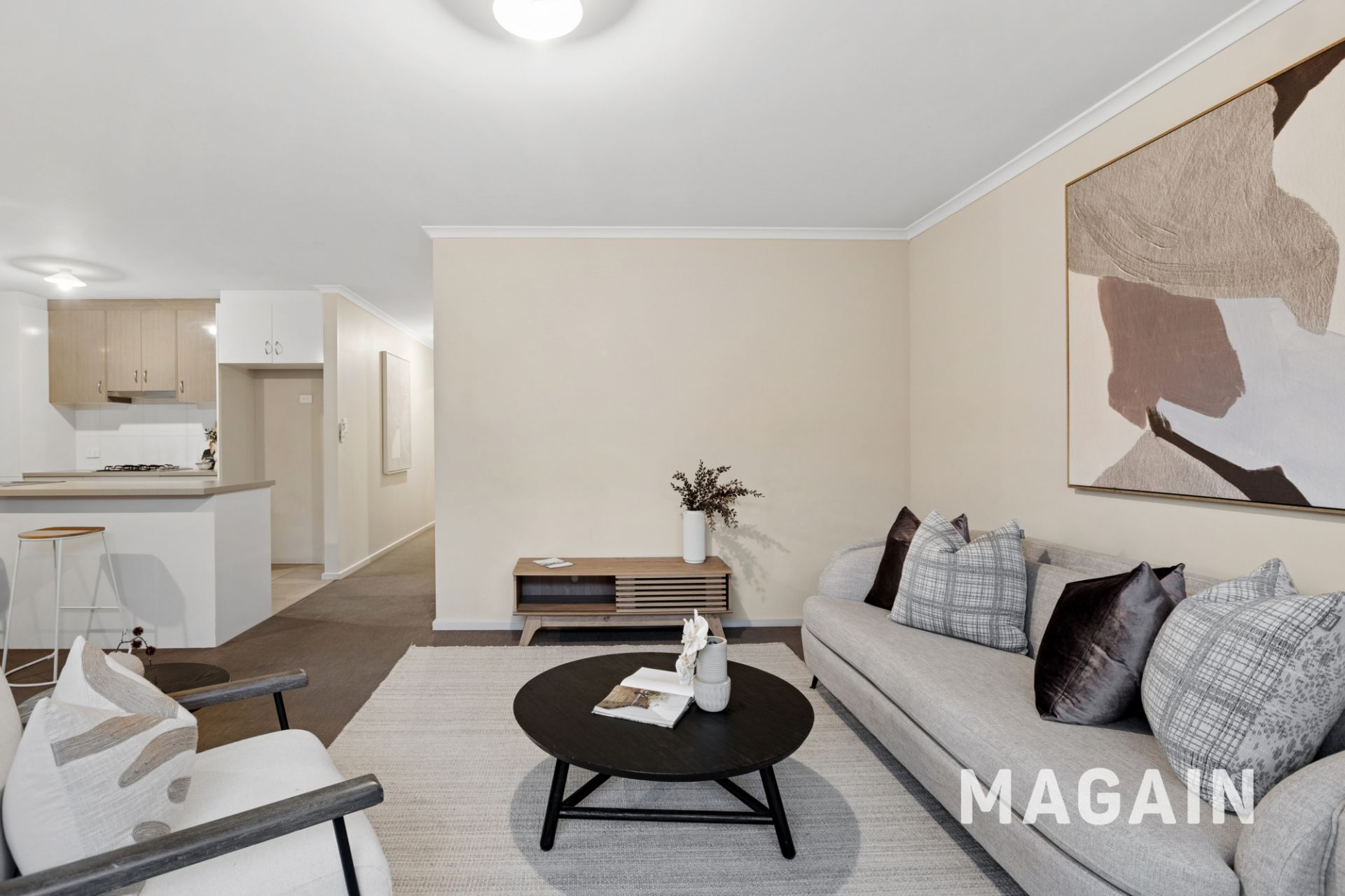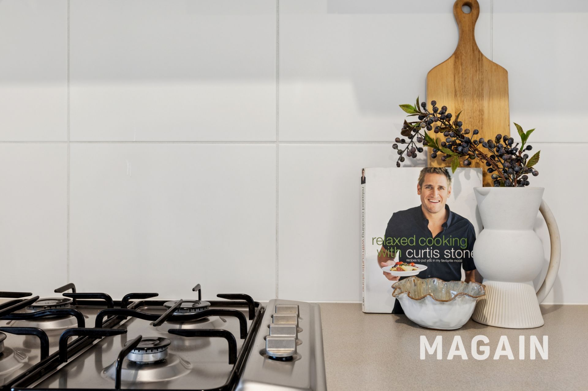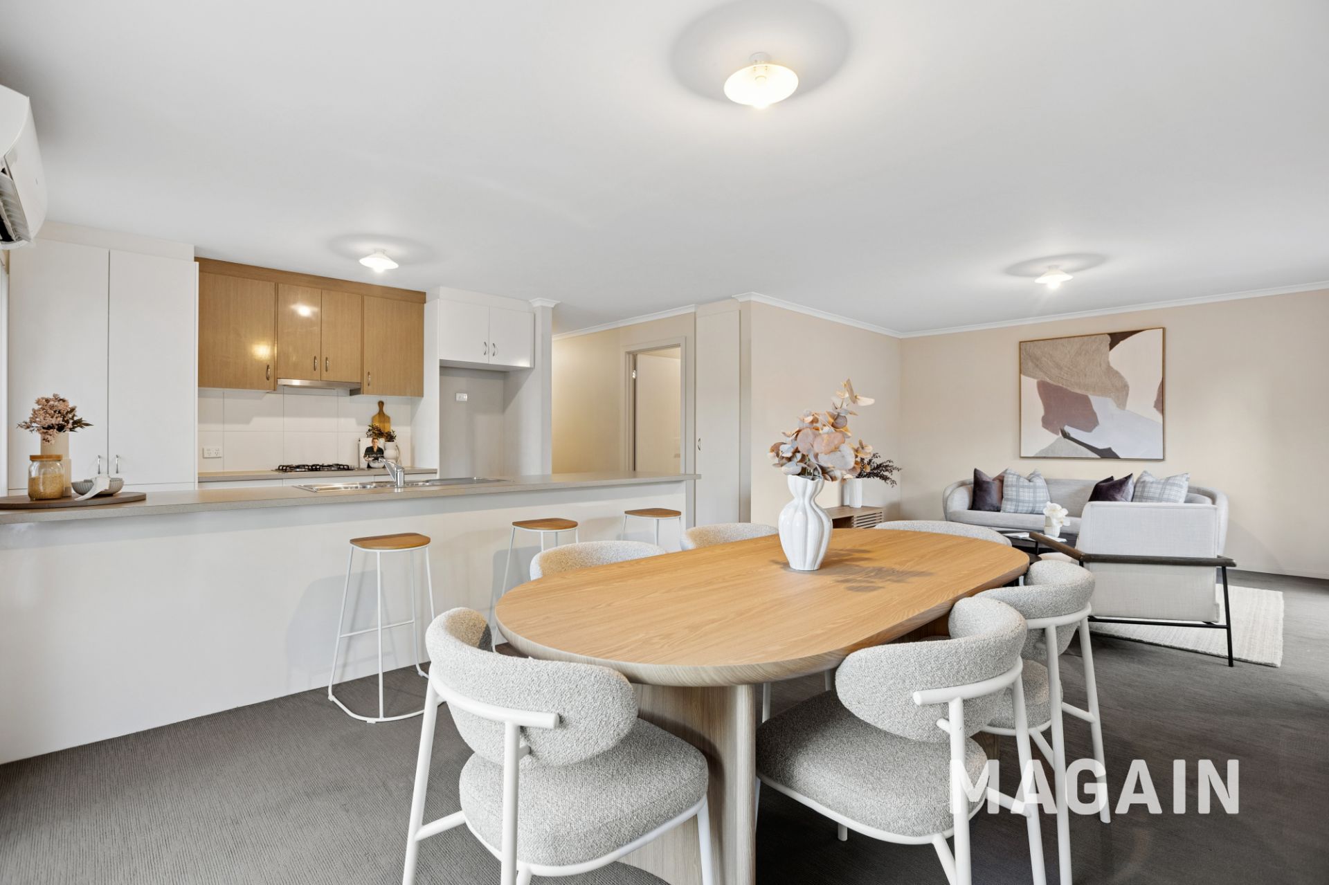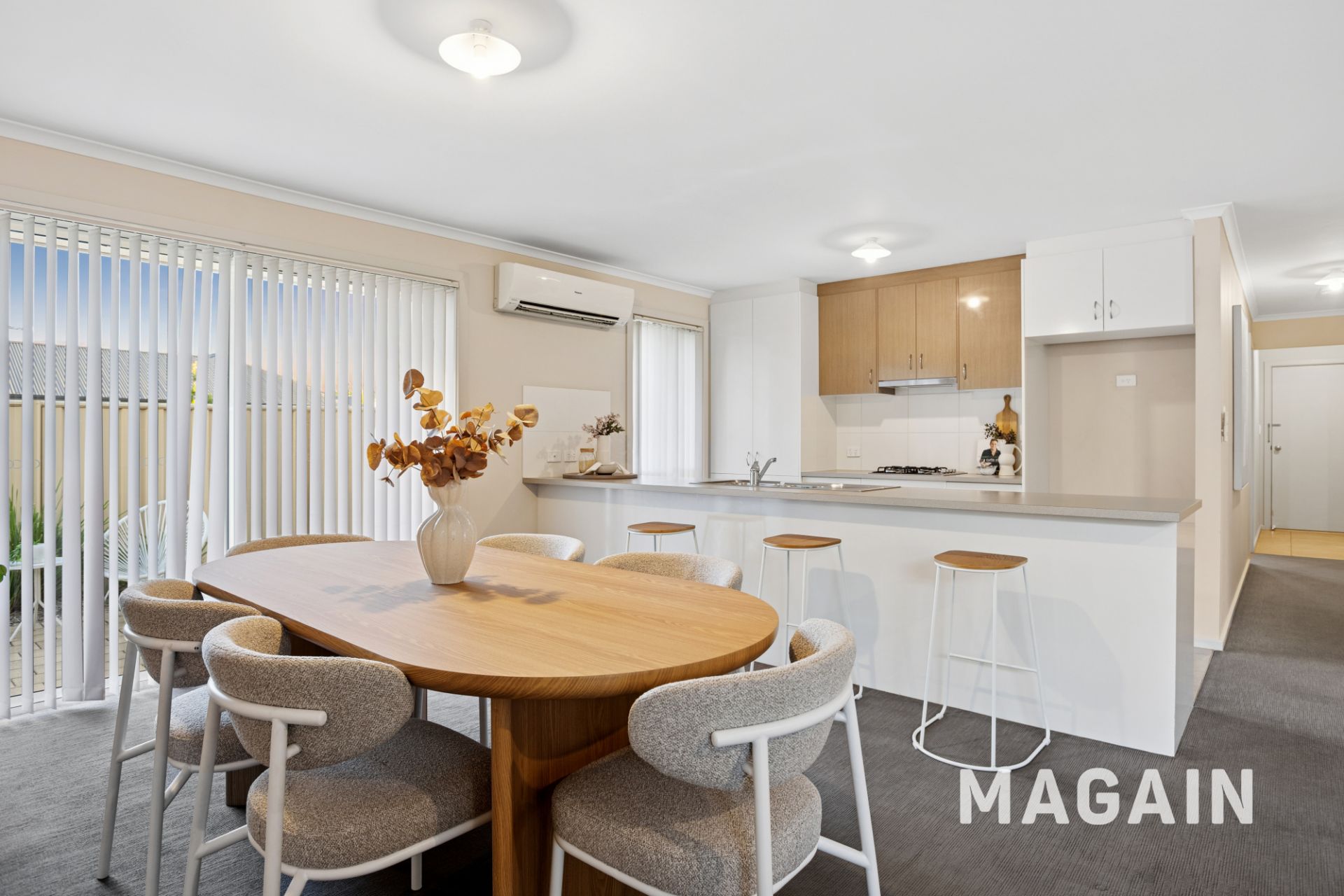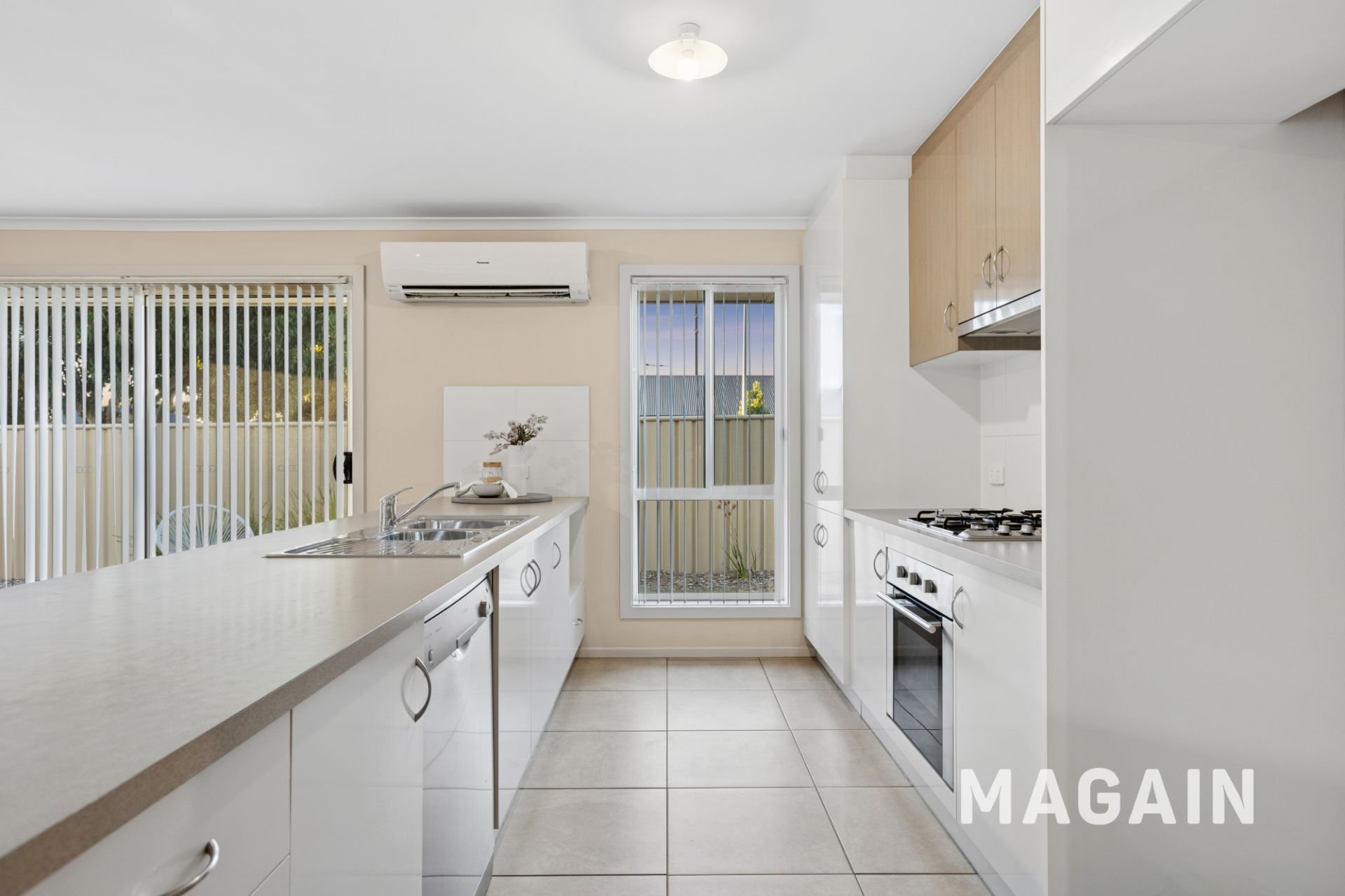 At the rear of the home, the generous open-plan kitchen, dining and living area forms the heart of the residence. The galley-style kitchen is well equipped with a gas cooktop, stainless steel double sink, dishwasher and ample cupboard and drawer space, while a reverse-cycle wall split system ensures year-round comfort.