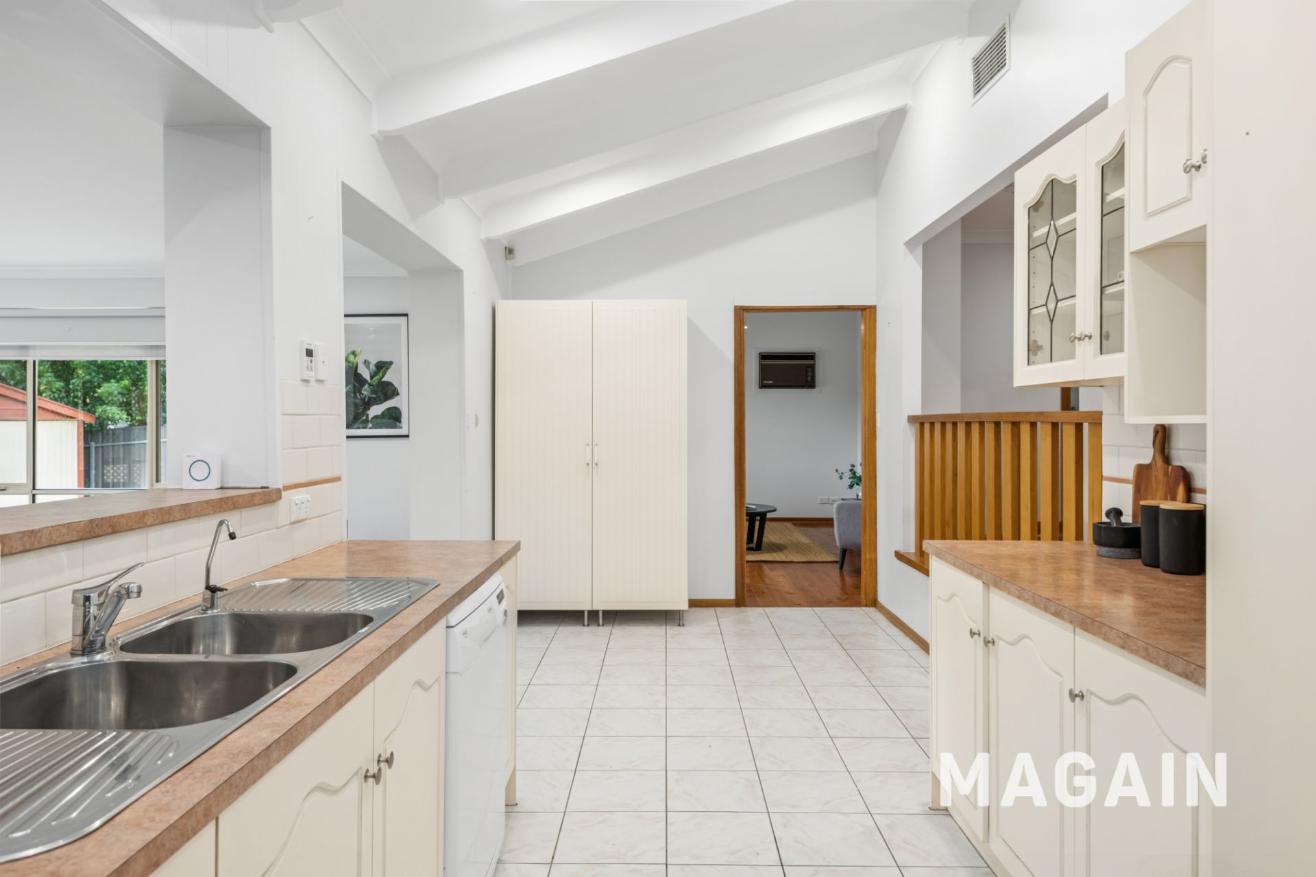 The central kitchen is well-designed with excellent storage, a dishwasher, a freestanding oven, and easy interaction with the family through a wide serving window. Overlooking the spacious living/dining zone, this main hub also includes a handy study nook, perfect for working from home or supervising homework.