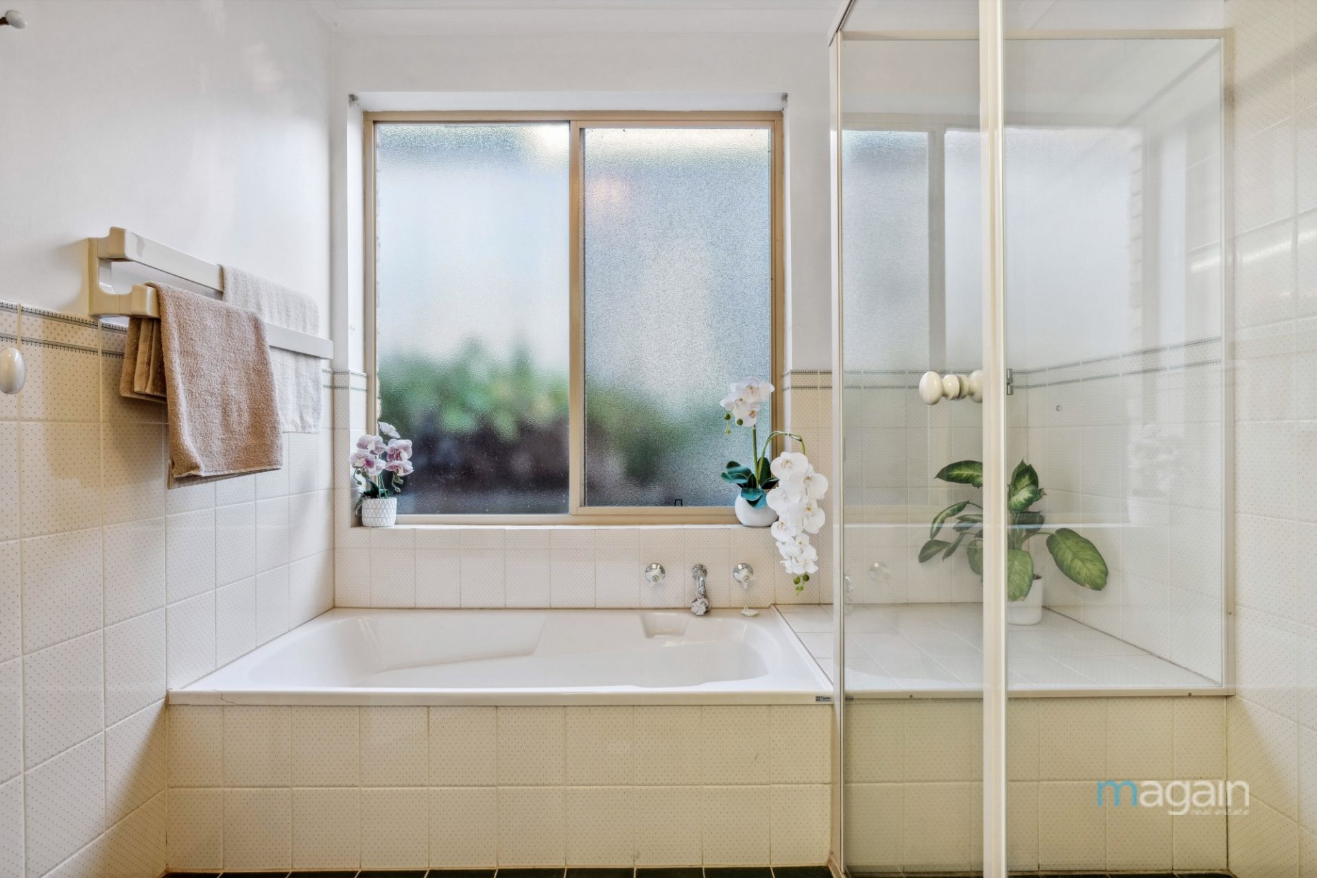 The main bedroom sits at the front of the home and includes 2 built-in robes, a ceiling fan, and ensuite-style bathroom access. The second bedroom also has built-in robes and a window overlooking the side and rear yard. A functional three-way bathroom includes a separate toilet, shower, and vanity, with direct ensuite-style access from the main bedroom.