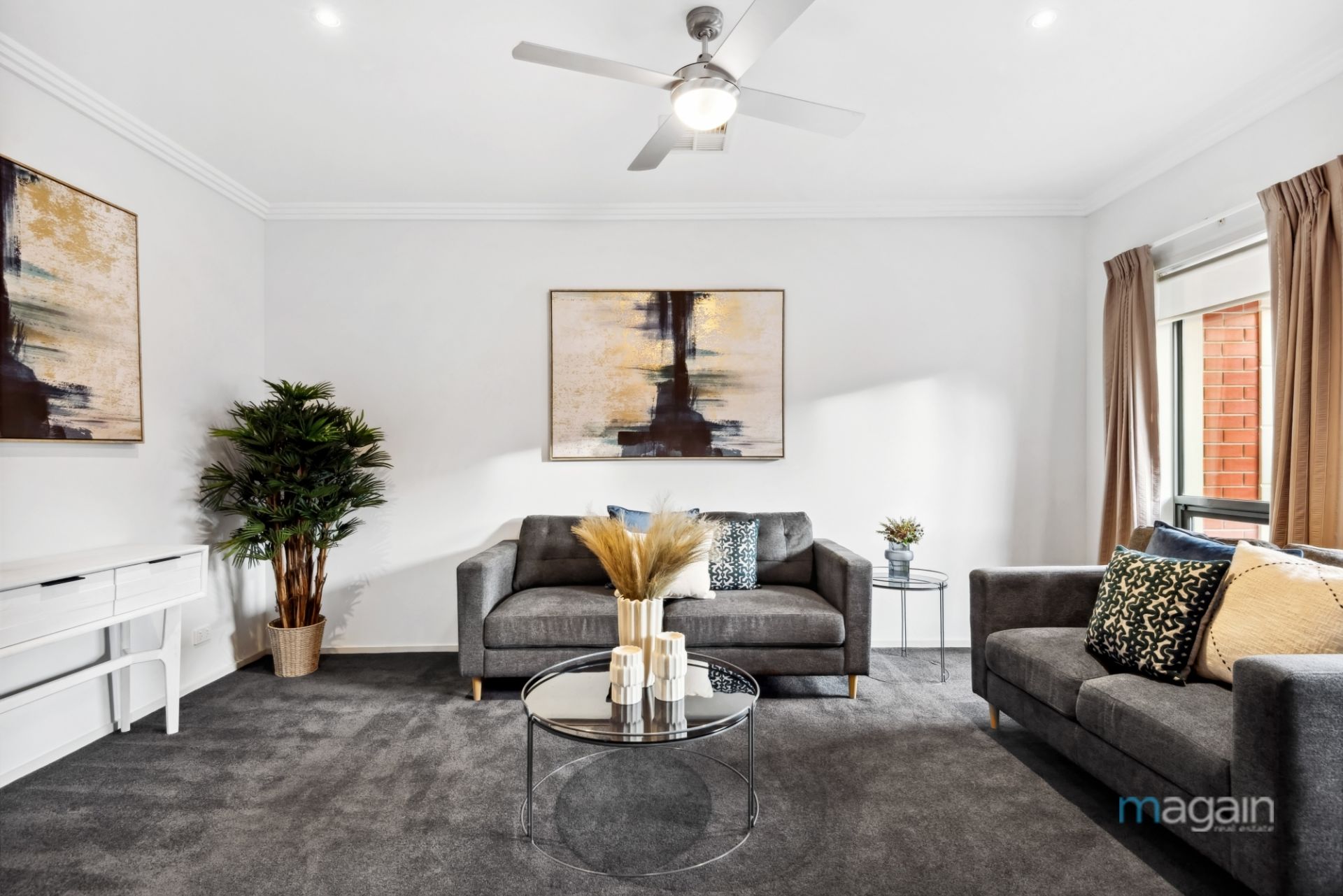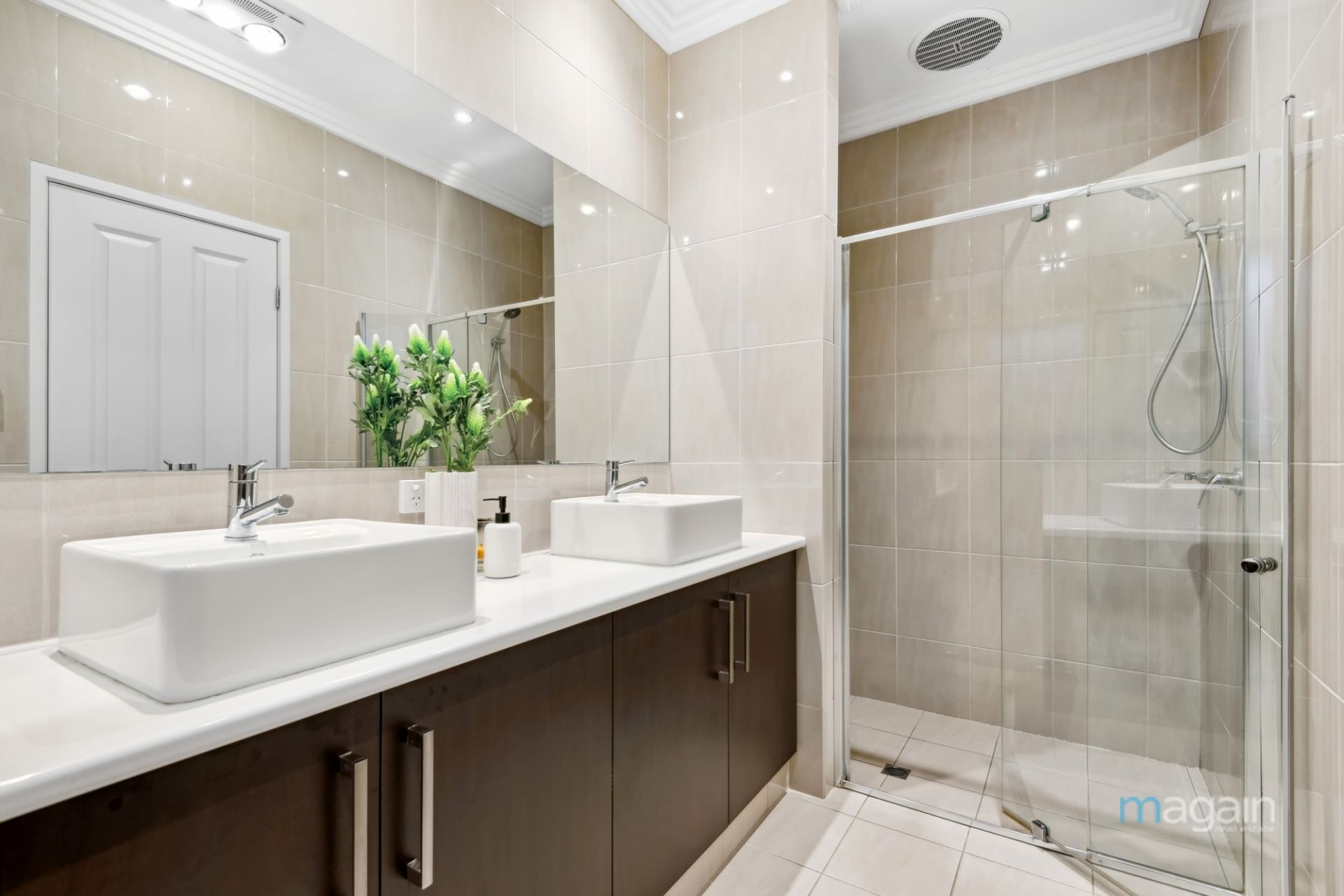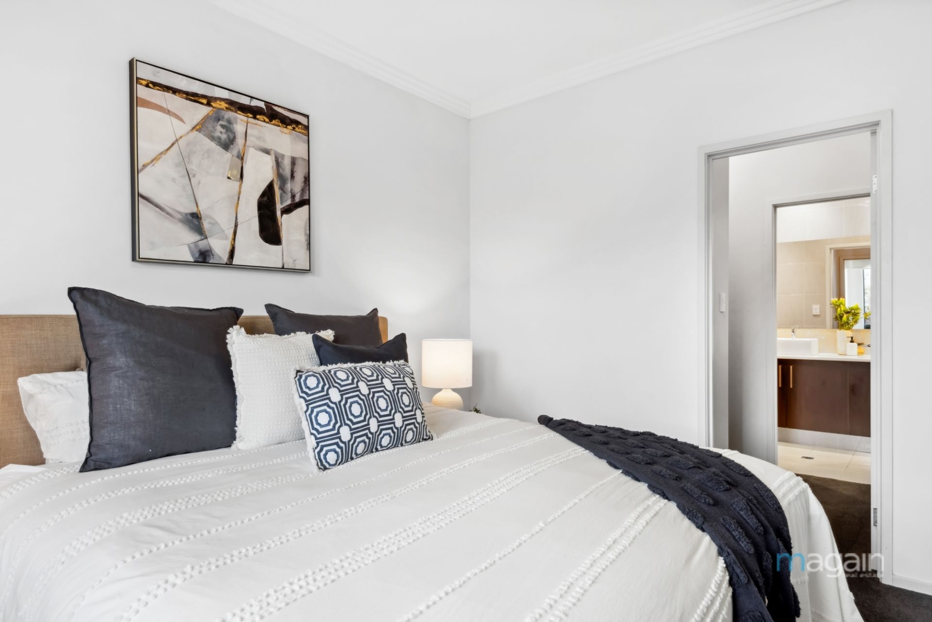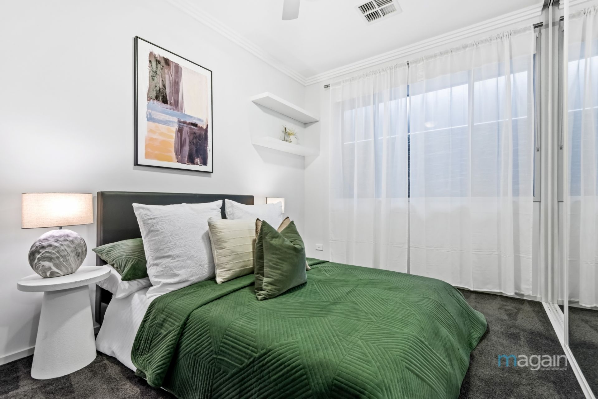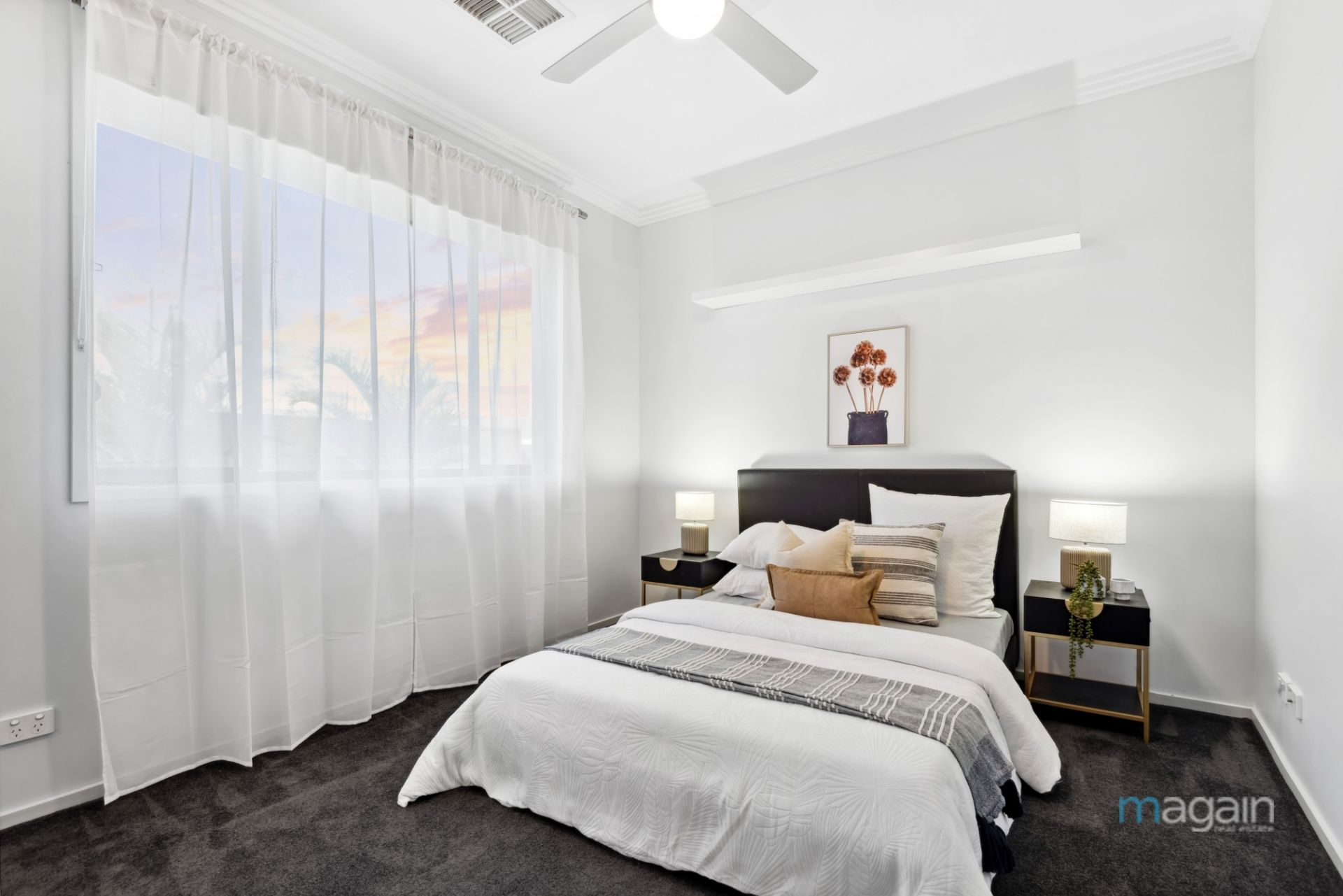 A retreat awaits-the master bedroom, nestled at the front the home, with a bay window, offering an oasis of serenity. A ceiling fan gently stirs the air, while a spacious 'his and hers' walk-in robe leads to an ensuite of unparalleled indulgence. Here, an extra large shower awaits alongside dual vanities.