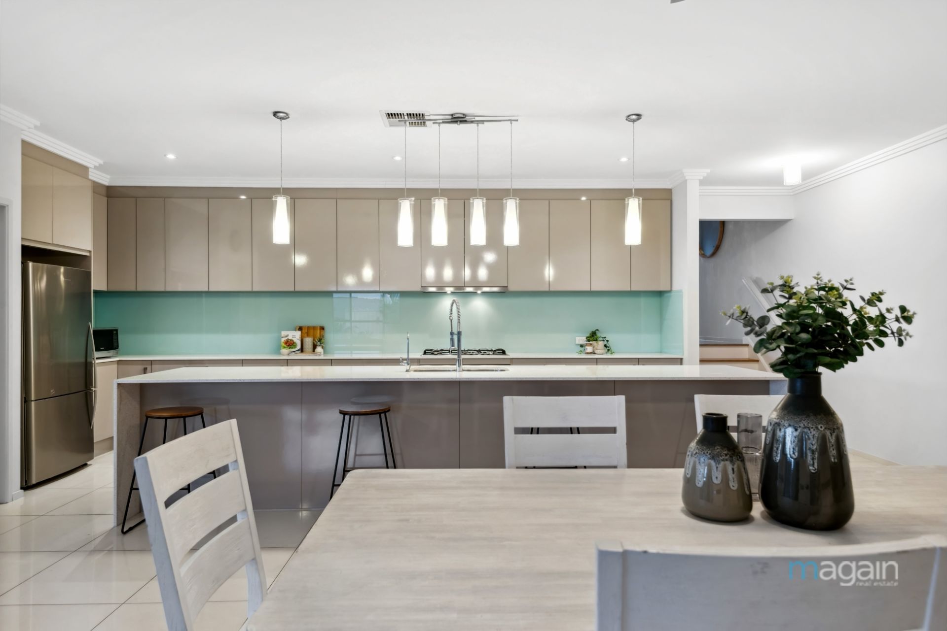The gourmet kitchen is a showcase of sophistication, boasting an expansive layout, huge walk-in pantry, and stone countertops. High-end appliances, including a conventional oven, gas cooktop, and dishwasher, grace the space. The central island bench serves as a focal point, blending style with functionality, perfect for casual dining or a gathering spot when entertaining.