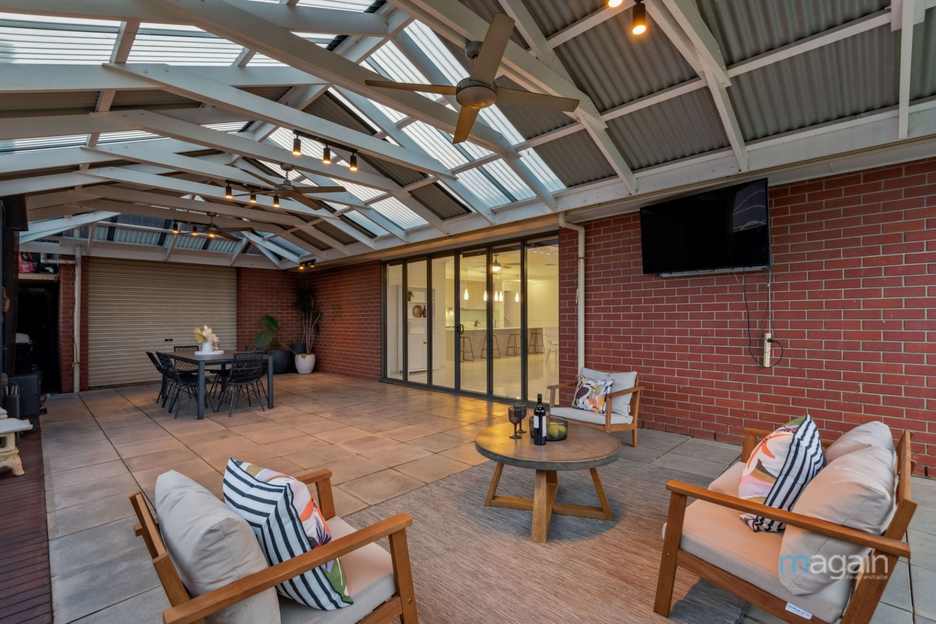 Transitioning to the outdoor oasis, glass double stacker doors unveil an entertainer's paradise. A sprawling paved entertaining area, sheltered beneath a pitched roof pergola,, and featuring a combustion fireplace, creating a harmonious space for gatherings, ideal for relaxation while overseeing the kids and pets playing on the spacious lawn surrounded by neat garden beds.