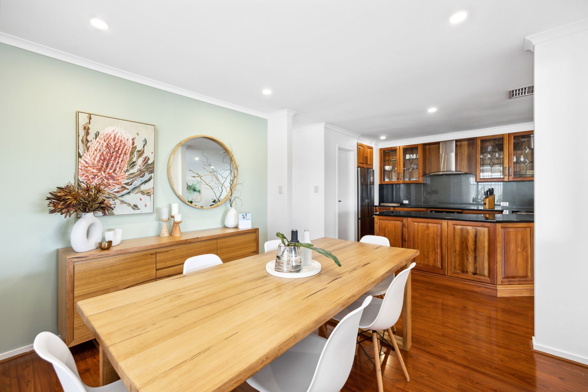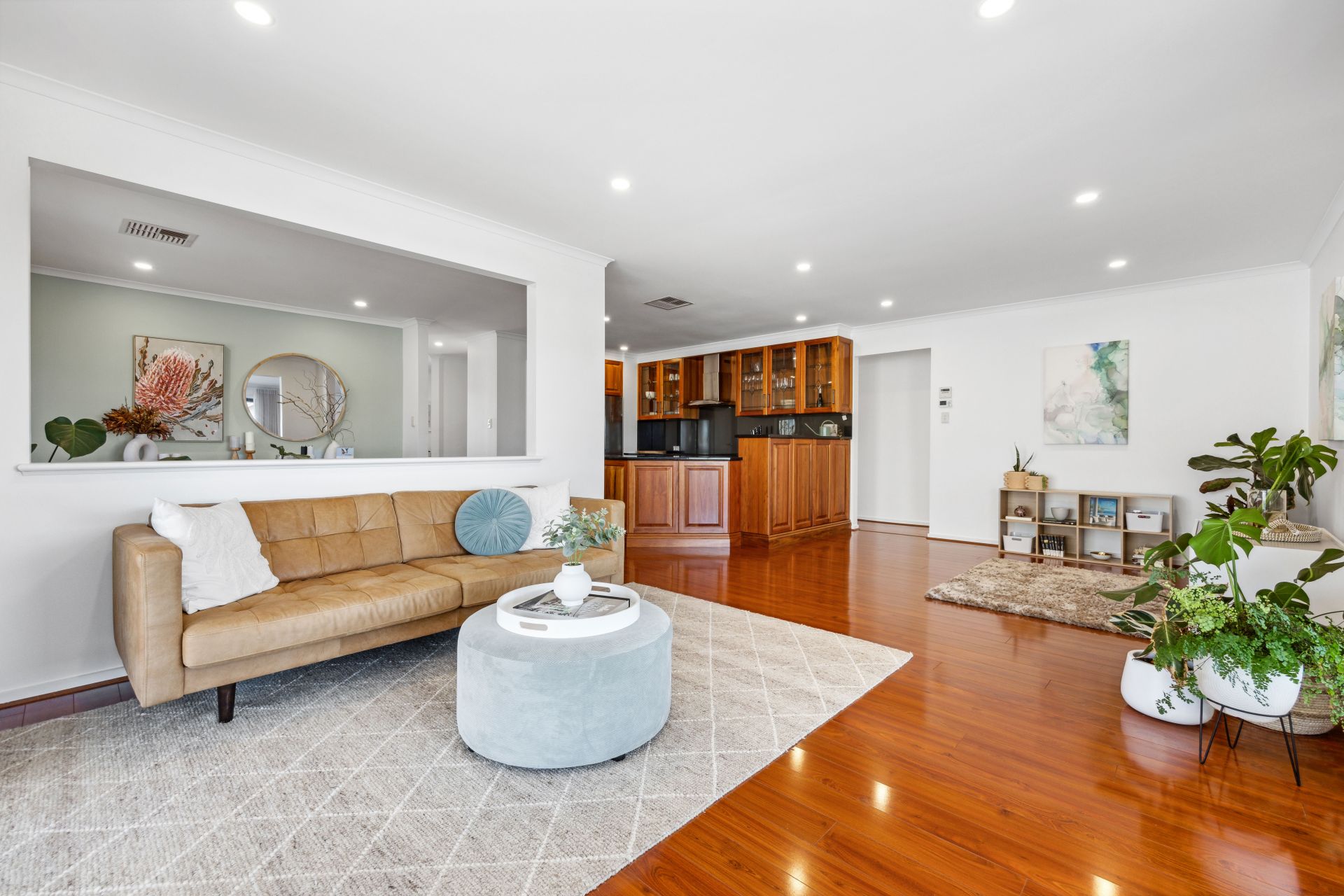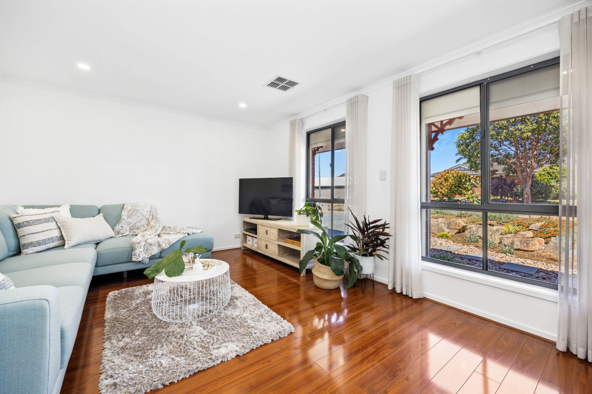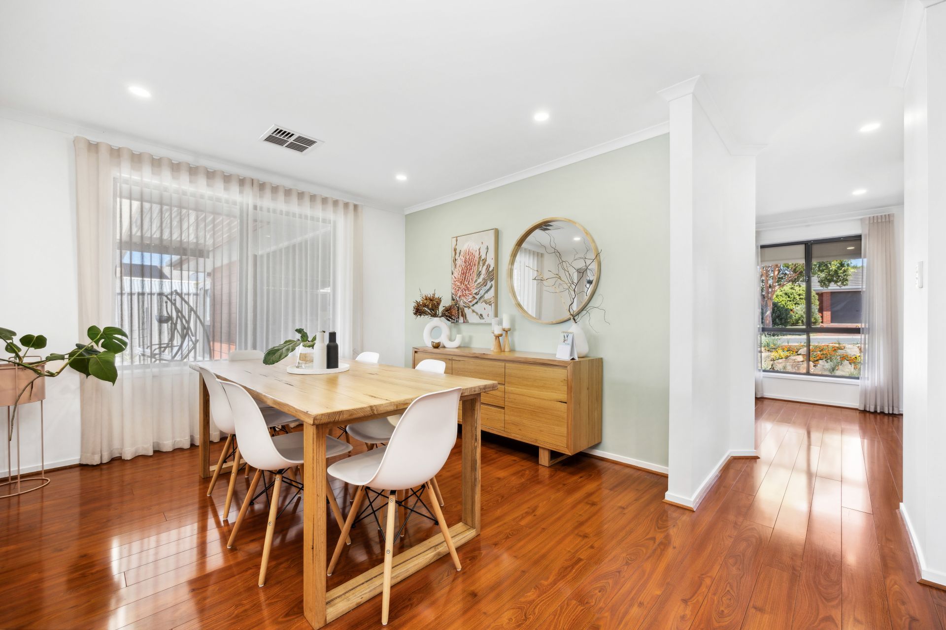 Upon entering, sophistication welcomes you, commencing with the formal lounge designed for unwinding, laden with modern timber flooring, and windows framing the picturesque native front garden.