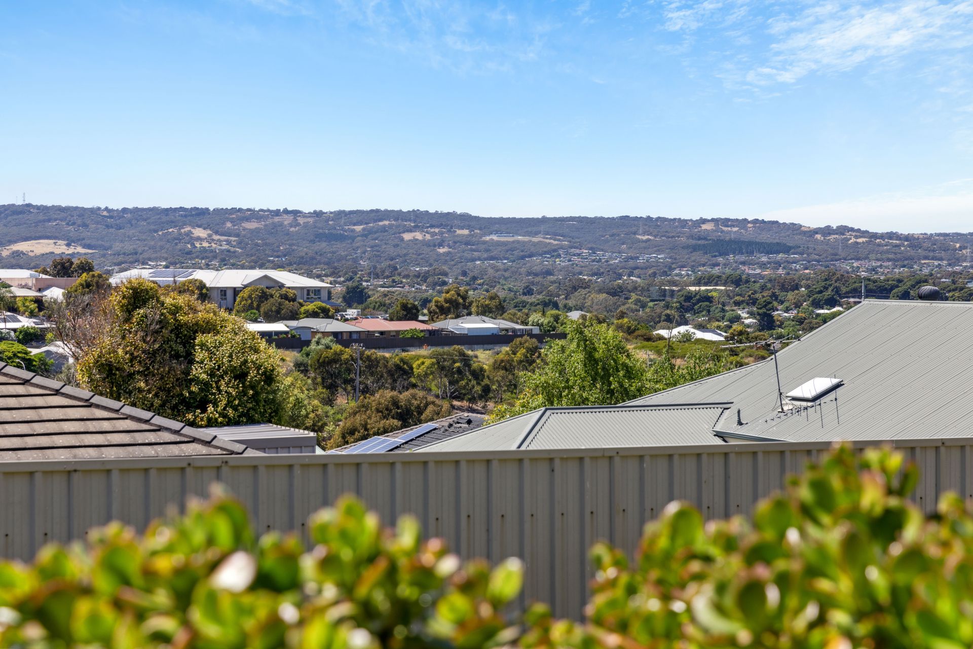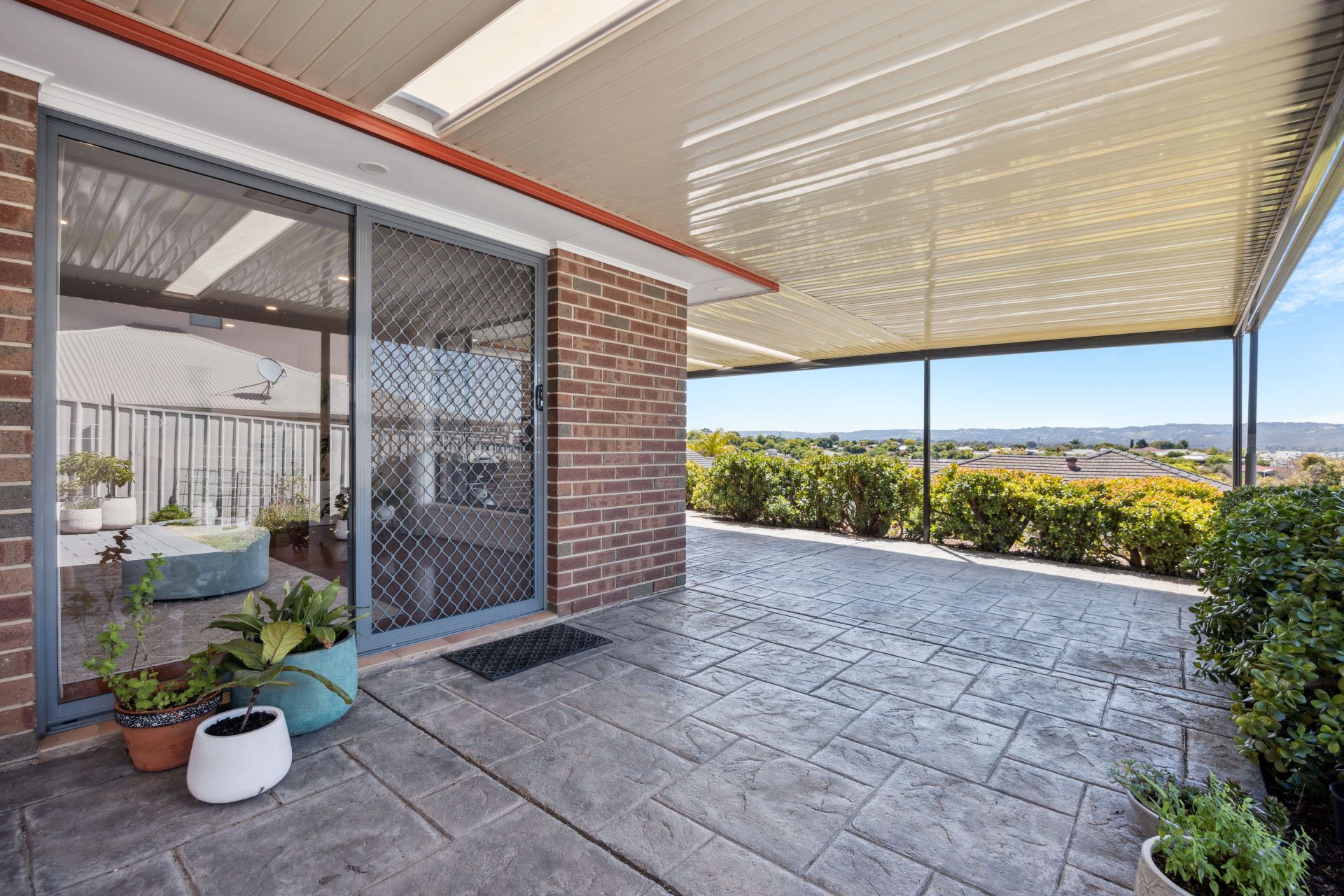 Outdoor enthusiasts will appreciate the extensive entertaining area accessible through glass sliding doors from the open-plan living area. The stamped concrete floor adds elegance, and the flat roof pergola provides ample shade for gatherings and relaxation. with the 180-degree views providing the ultimate backdrop. A split-level design leads to a generous grassy area, perfect for outdoor play, while the multiple established fruit trees and veggie/herb garden make it a self-sufficient oasis.