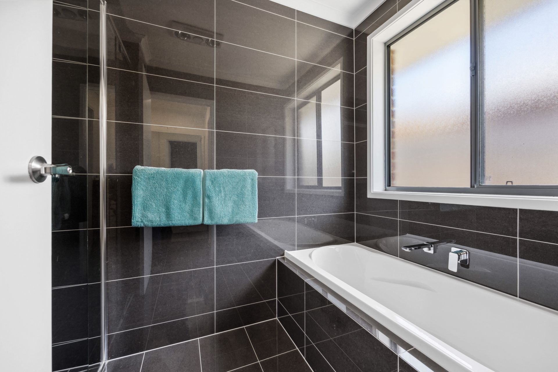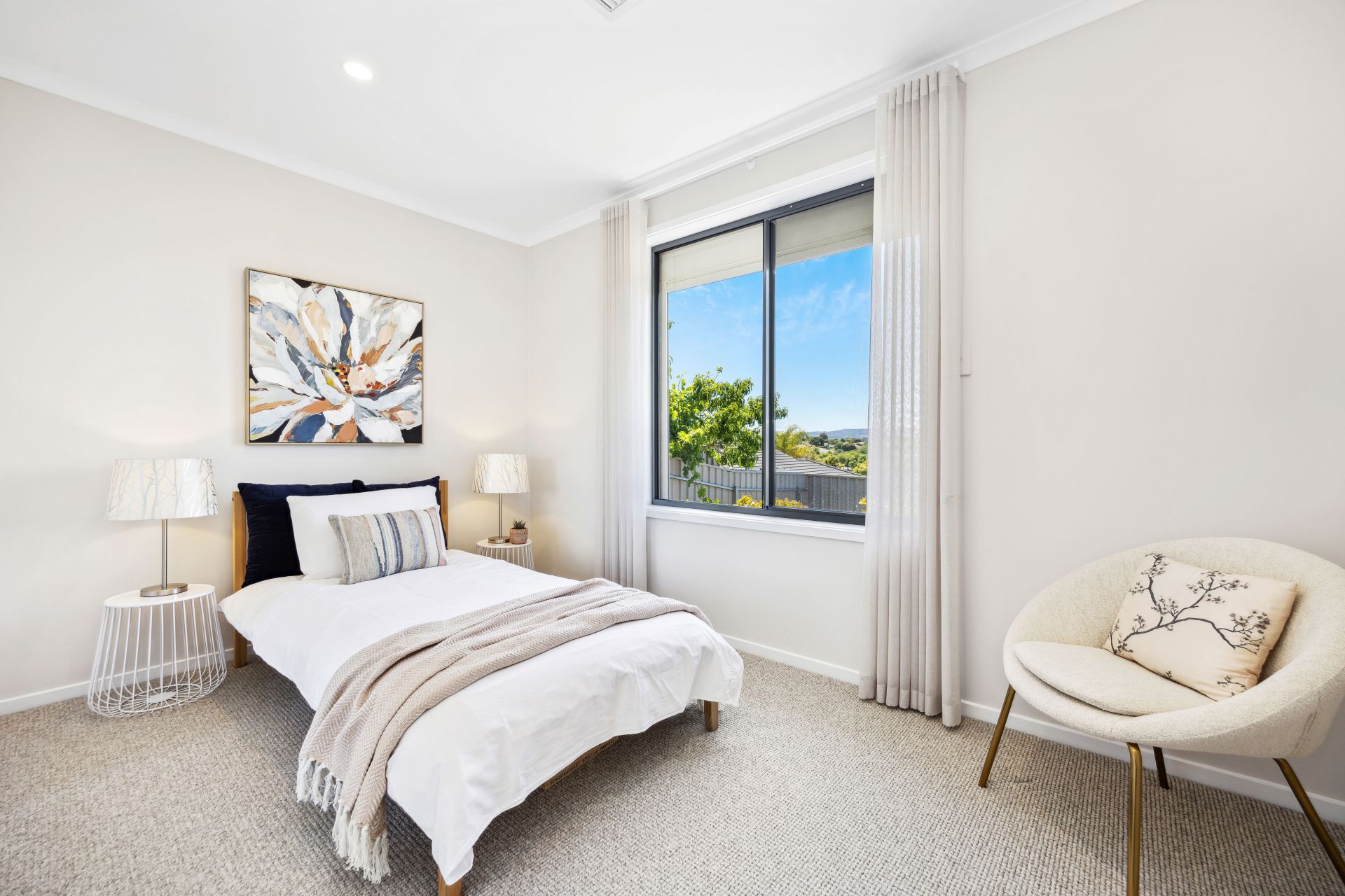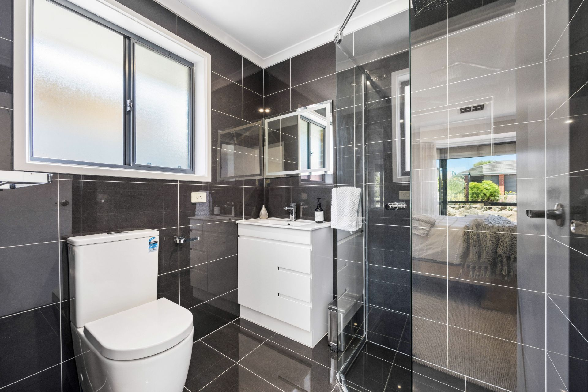 The master bedroom, positioned at the front, is a serene sanctuary. It includes a roomy walk-in robe, and a luxurious ensuite with stunning floor-to-ceiling tiling, a testament to quality and meticulous attention to detail.
