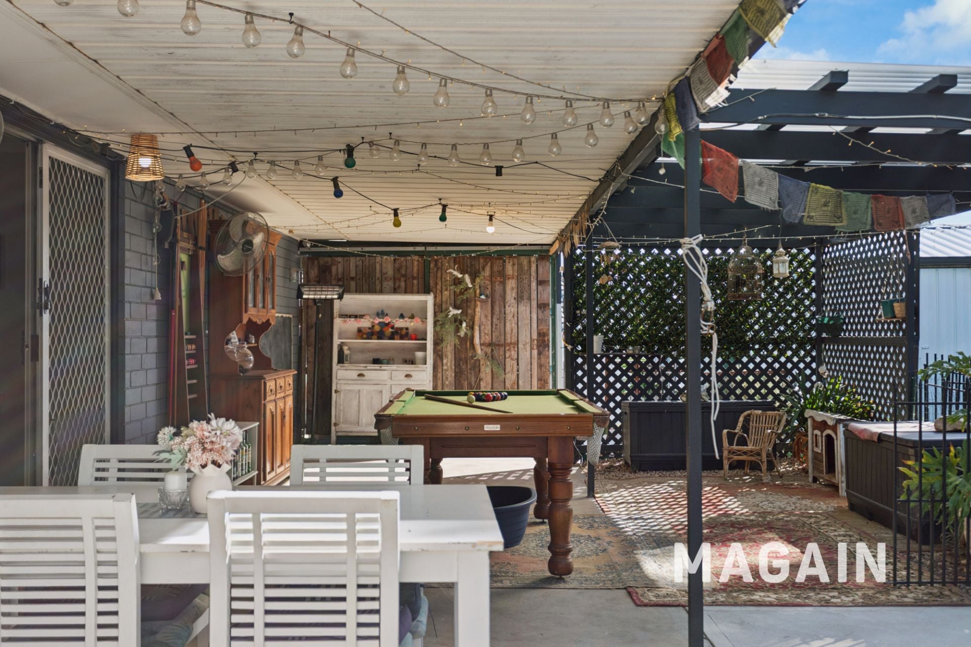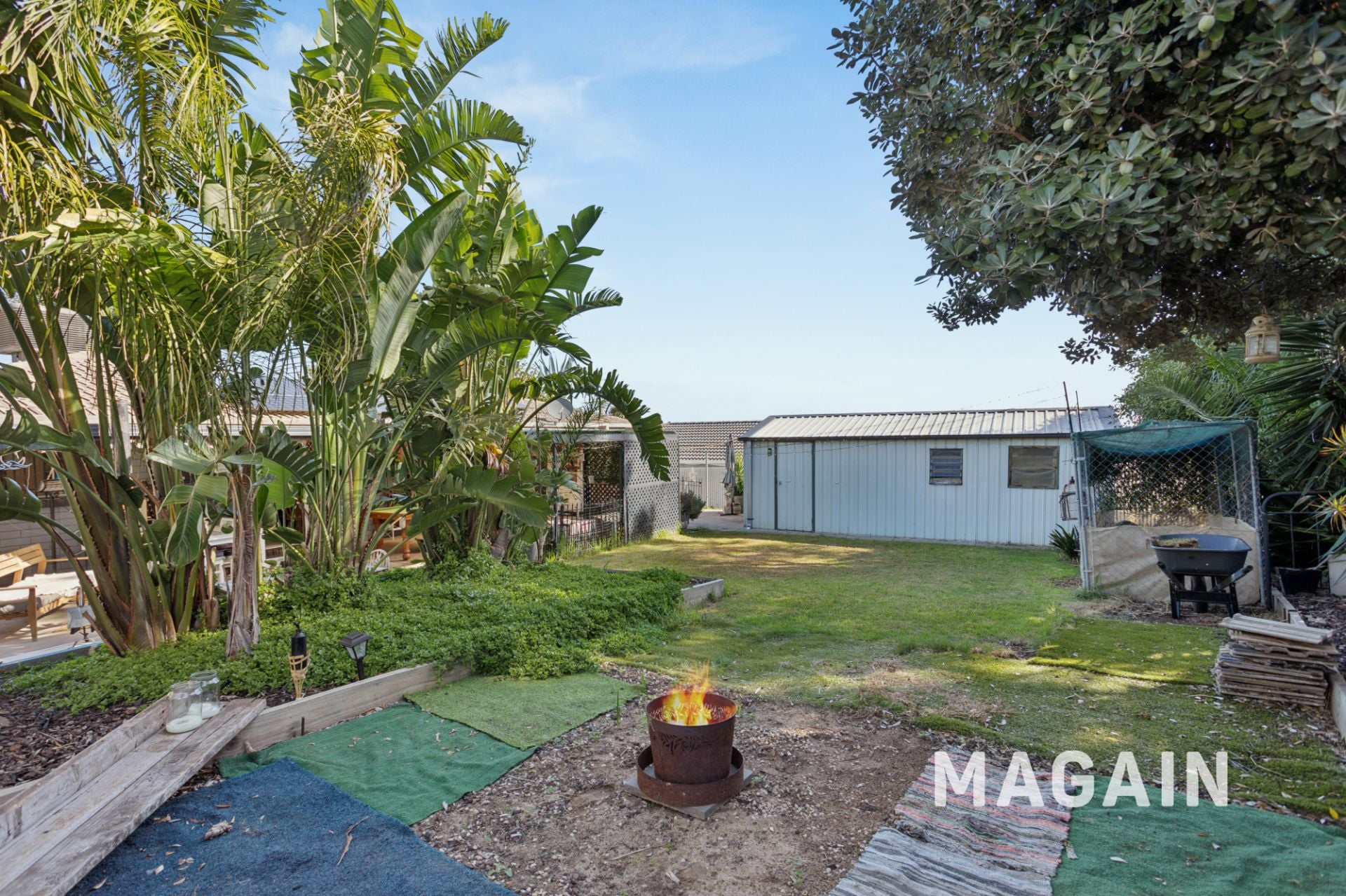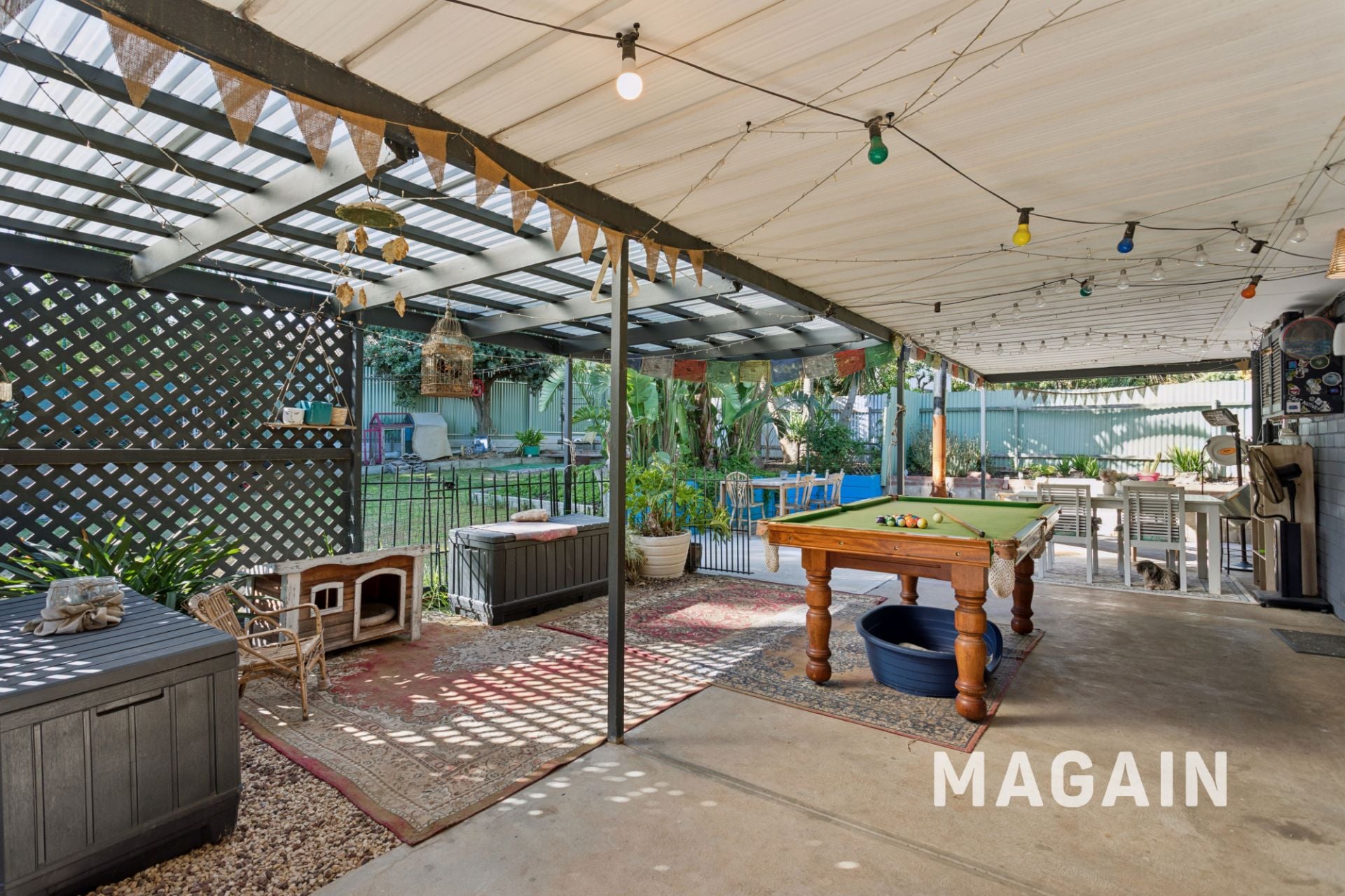 The outdoor space offers a traditional backyard setting with lush lawn, shaded areas, and multiple zones ideal for entertaining family and friends. A drive-through single carport provides easy access to a large rear garage complete with concrete flooring, power, and lighting-perfect for storage, a workshop, or additional parking. There is also plenty of off-street parking available to accommodate multiple vehicles.