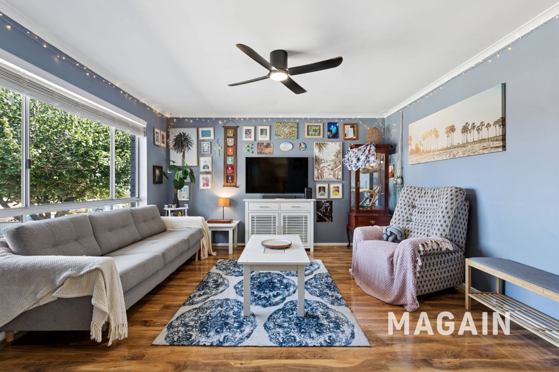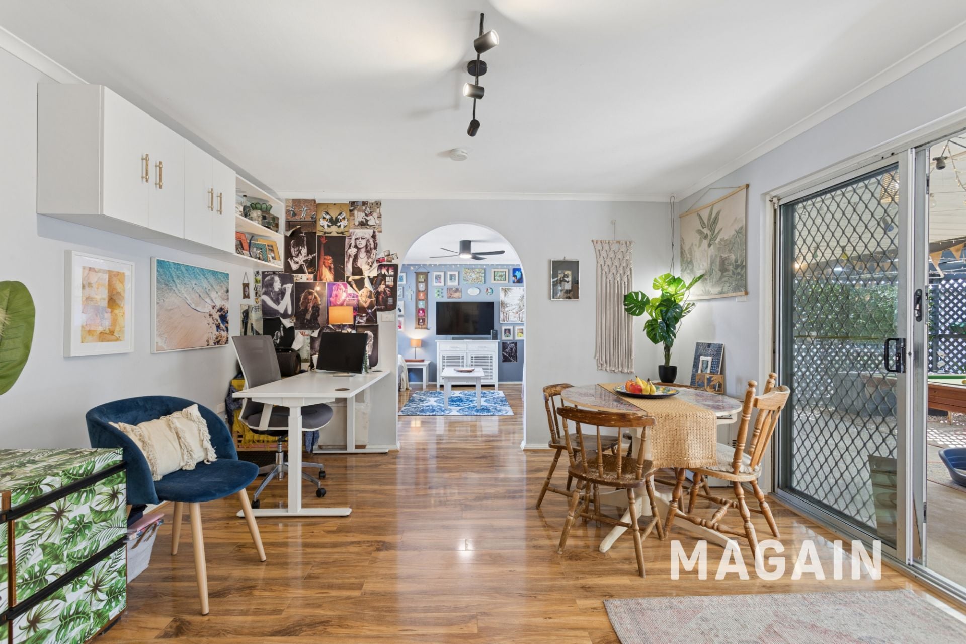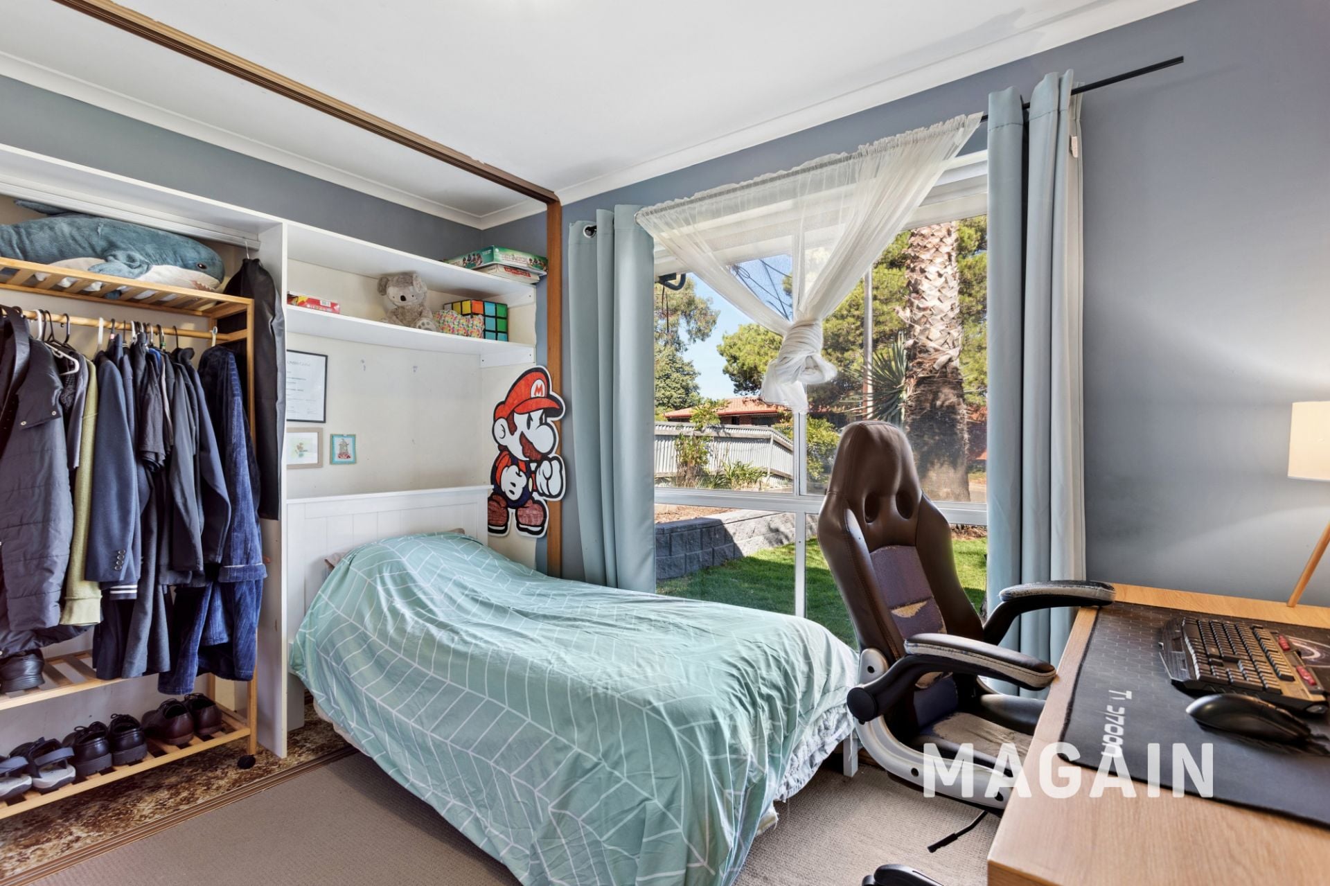 The outdoor space offers a traditional backyard setting with lush lawn, shaded areas, and multiple zones ideal for entertaining family and friends. A drive-through single carport provides easy access to a large rear garage complete with concrete flooring, power, and lighting-perfect for storage, a workshop, or additional parking. There is also plenty of off-street parking available to accommodate multiple vehicles.