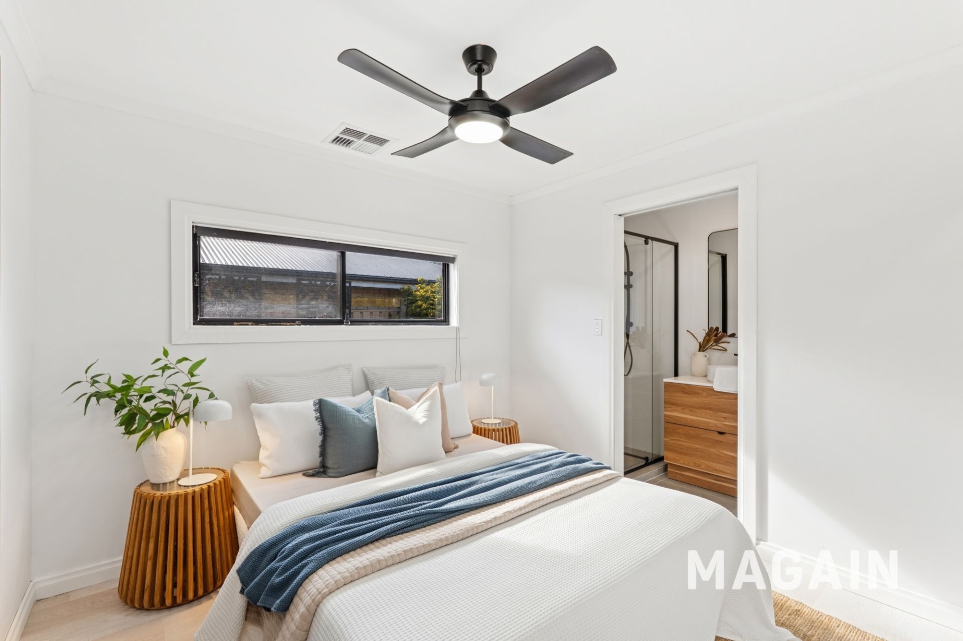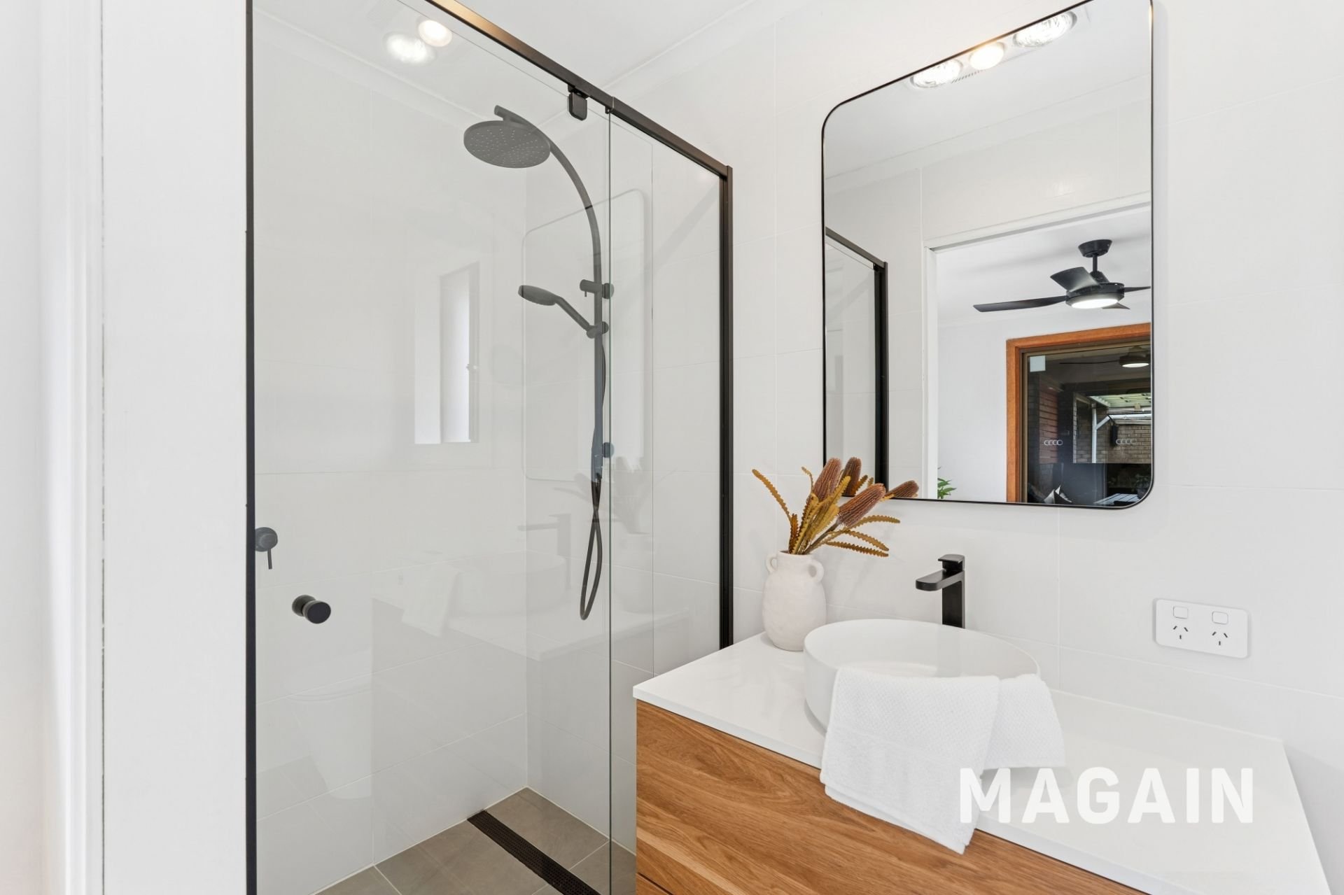 All three bedrooms feature stylish floating floors and ceiling fans. The main bedroom includes a walk-in robe, renovated ensuite, and direct access to the verandah for that added touch of stylish living. Bedrooms two and three are fitted with built-in robes and share a main bathroom with shower, bath, and vanity, plus a separate toilet for convenience.