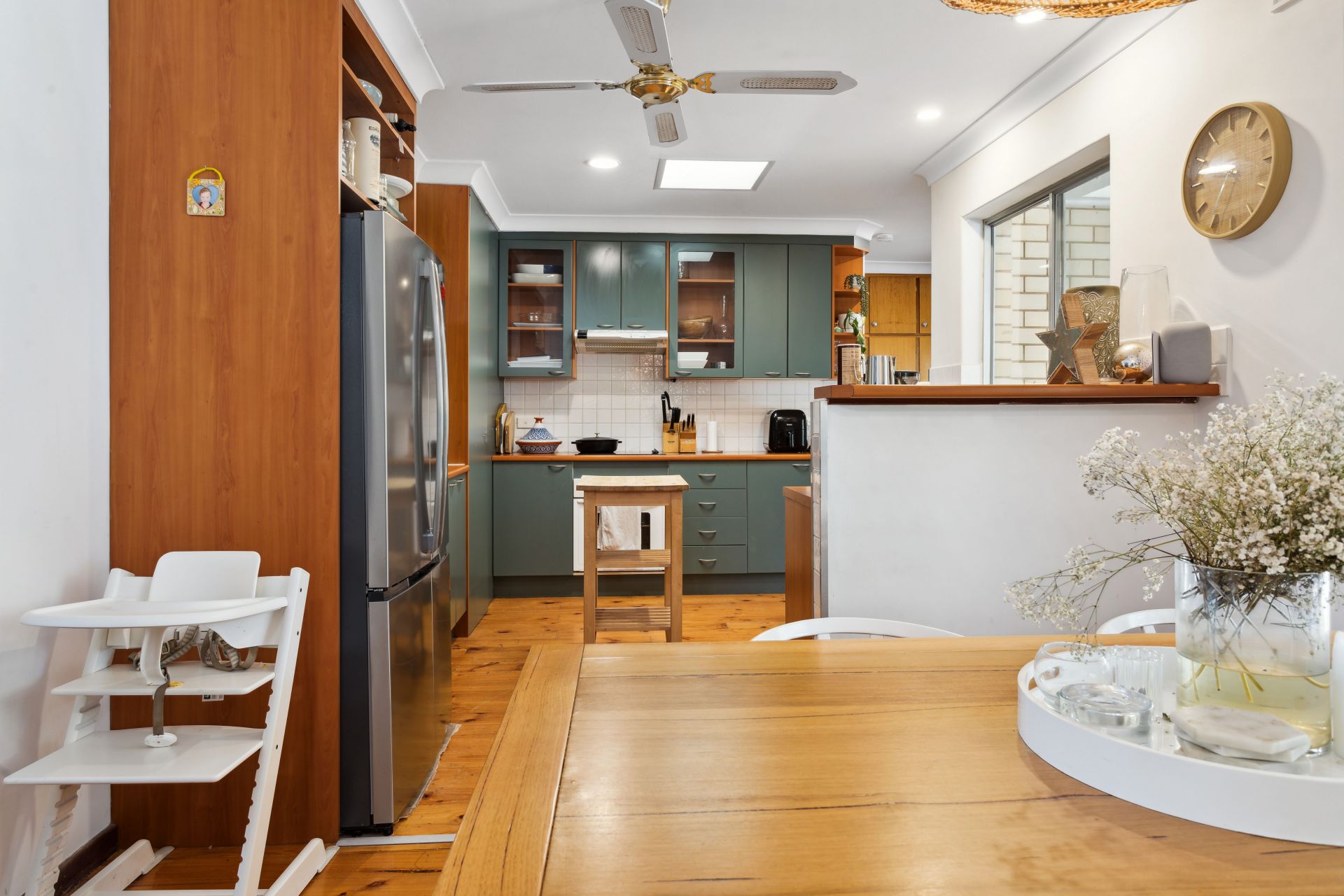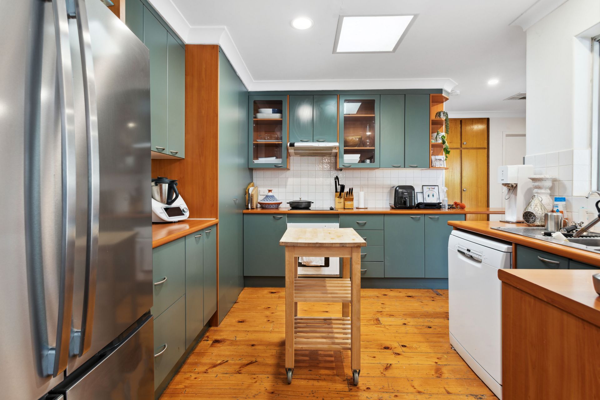 The formal lounge and dining areas welcome you with an inviting ambiance, seamlessly connected to the adjacent kitchen. The kitchen, a testament to modern design, boasts a funky renovation, offering ample storage with cabinets and a generously sized walk-in pantry. Natural light streams in through a skylight, complemented by the convenience of a ceiling fan and a dishwasher, ensuring a perfect culinary space.