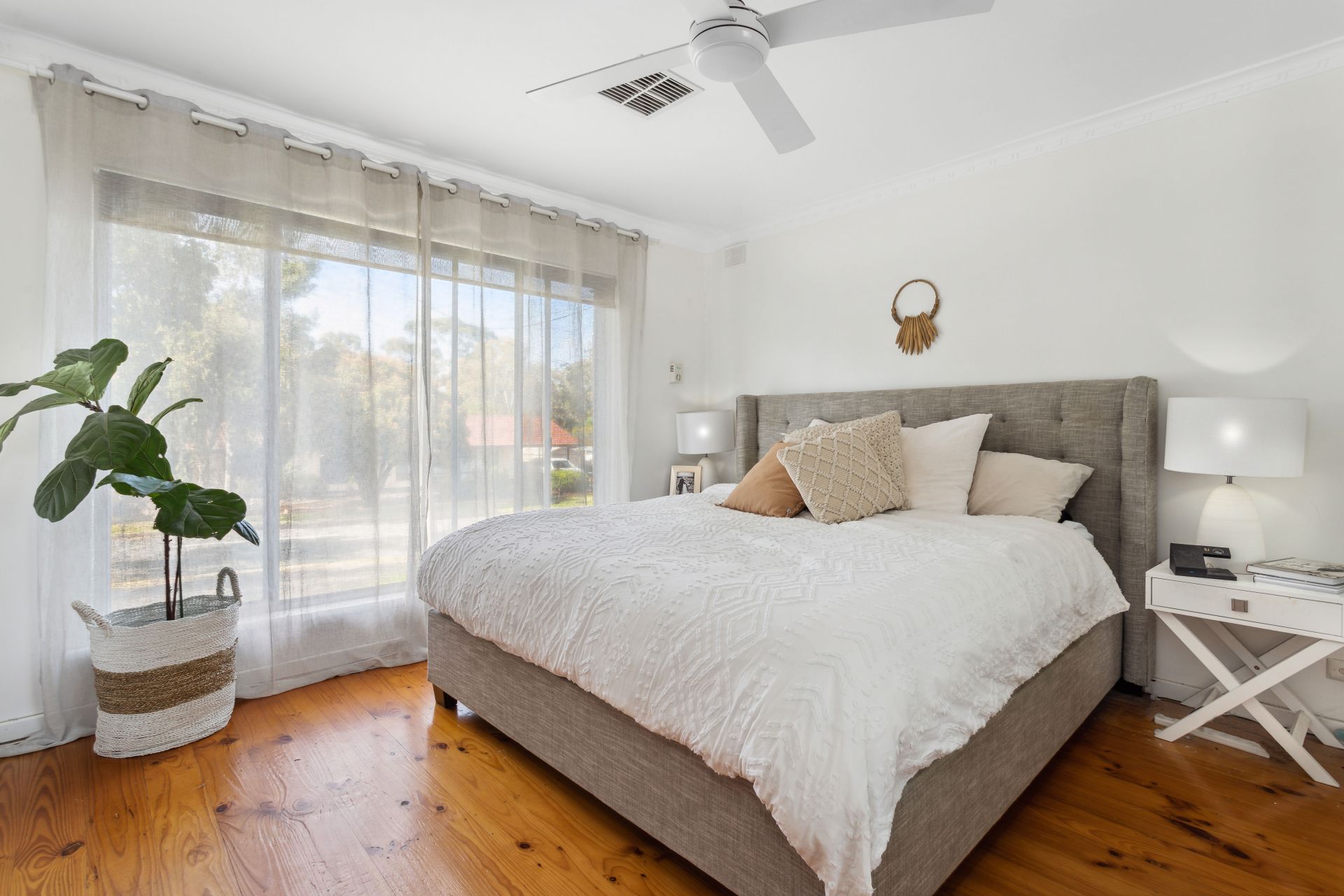 The master bedroom and bedroom two are adorned with built-in robes, providing practical storage solutions. All five bedrooms feature ceiling fans, creating a comfortable atmosphere throughout. The two strategically placed bathrooms offer easy accessibility for residents and guests alike. A sizable linen closet in the hallway further enhances the home's storage capabilities, accommodating sheets, towels, and more.