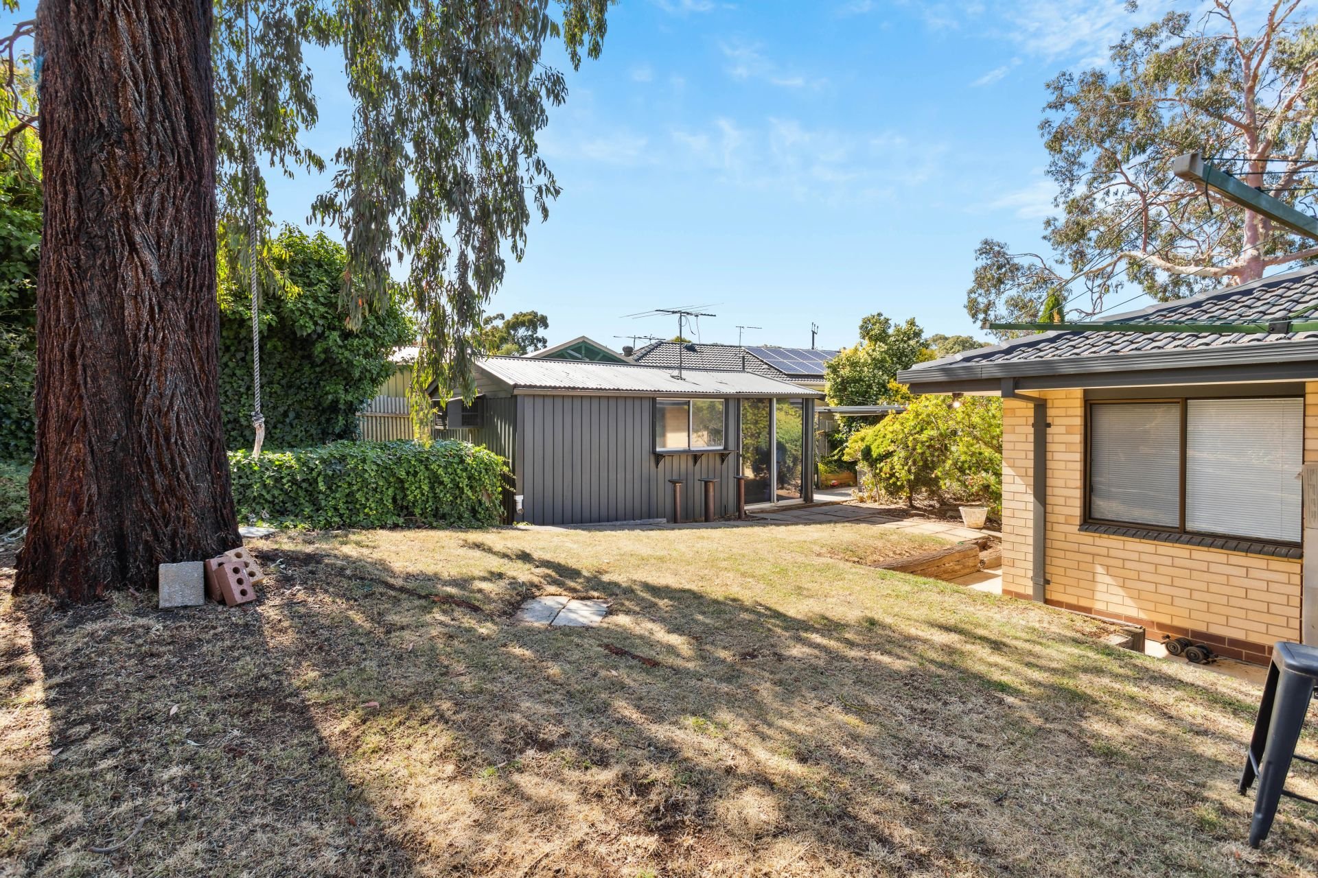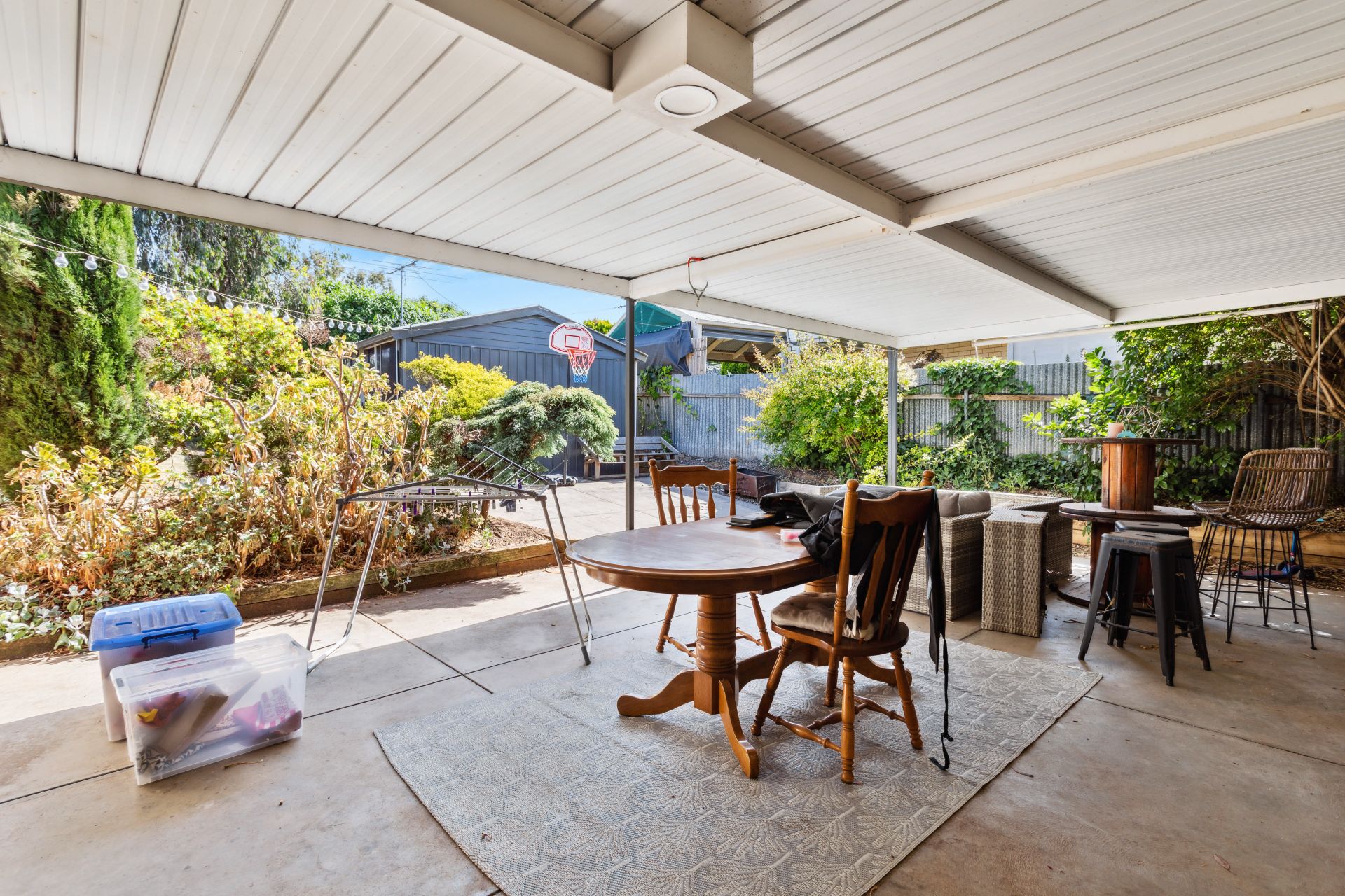 Step outside from the laundry into a spacious entertaining area, sheltered by a flat roof pergola, creating an ideal space for gatherings. The expansive rear yard provides abundant space for children and pets to play freely, complemented by the presence of an external studio.