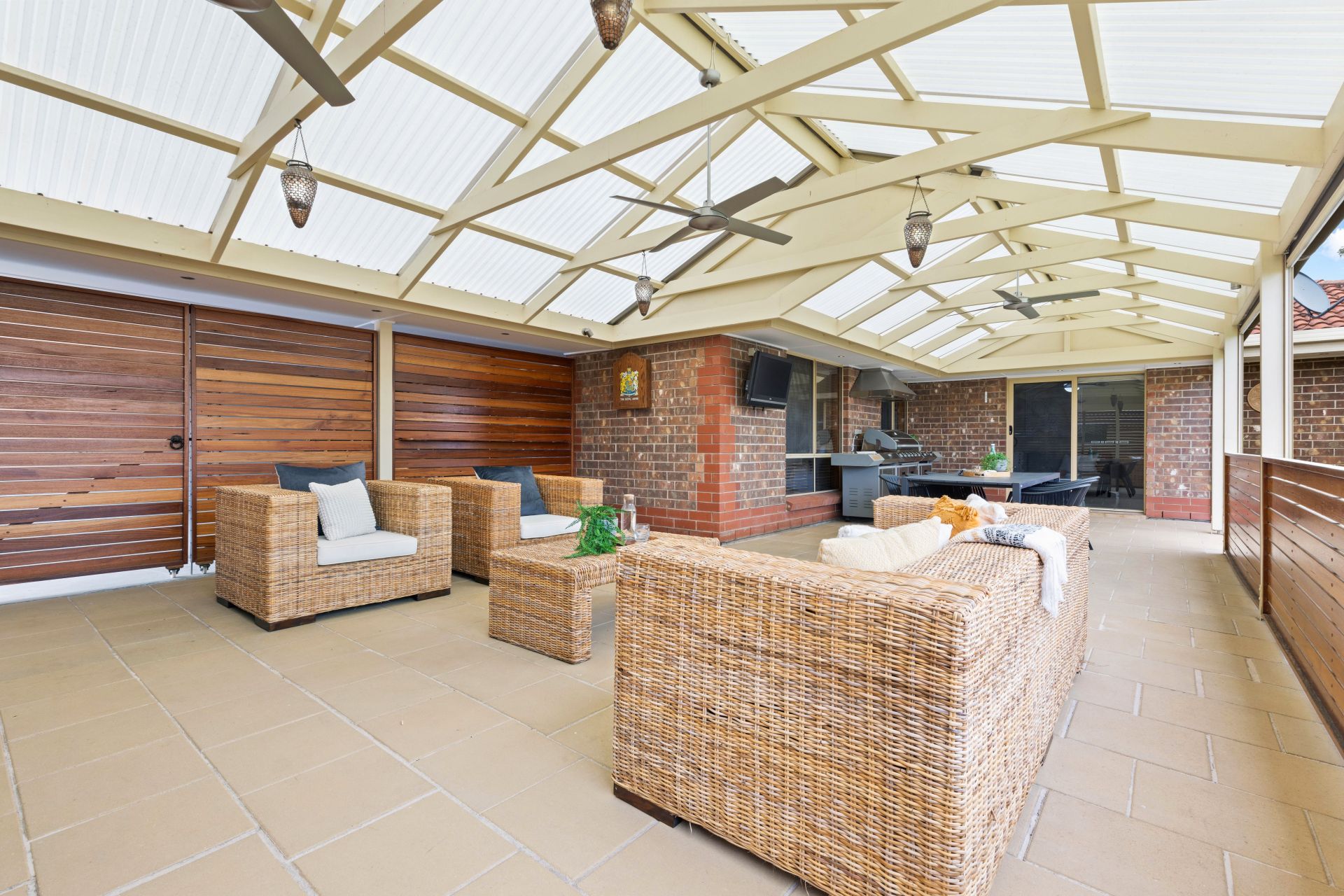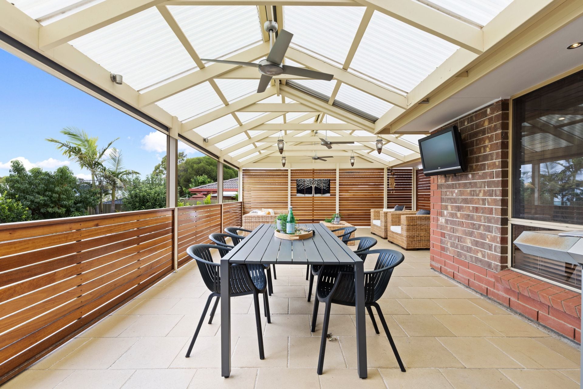> sliding doors from the main living allow views and seamless access to the outdoors where you will find an enormous partially enclosed entertaining area that wraps around the right side of the home, the pitched roof pergola making sure this fantastic area can be used to entertain year-round