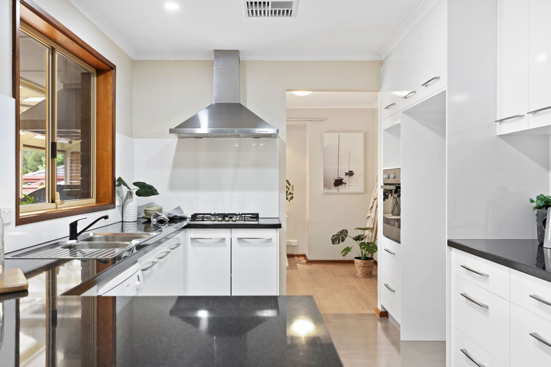 > kitchen features timeless sleek white cabinetry, modern appliances including a gas cook top and dishwasher plus walk in pantry and a well designed breakfast bar that creates the perfect gathering spot when entertaining while also allowing for maximum storage