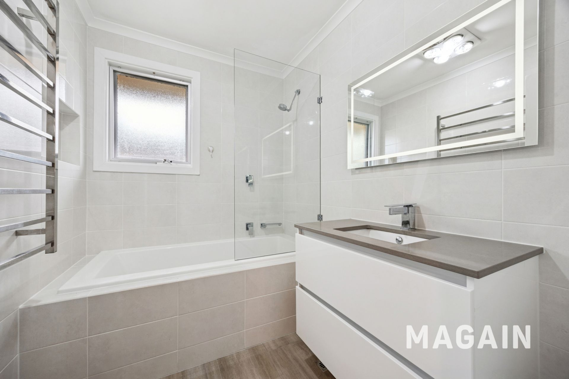 The floorplan is thoughtfully designed for family living, with all bedrooms positioned close to the bathroom and laundry. The modern bathroom features a combination bath-shower, vanity, and a separate toilet, perfect for meeting the needs of a growing household.
