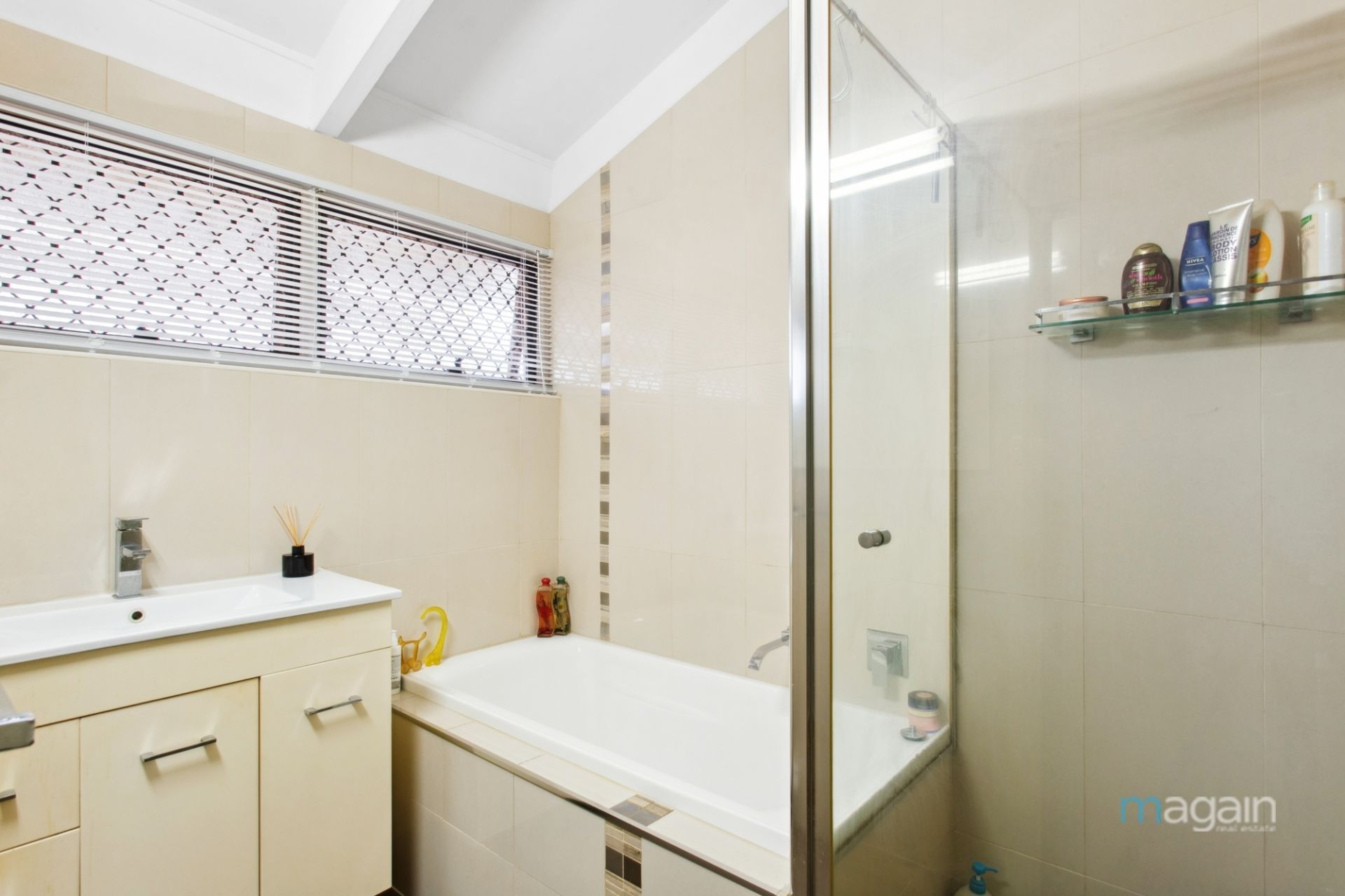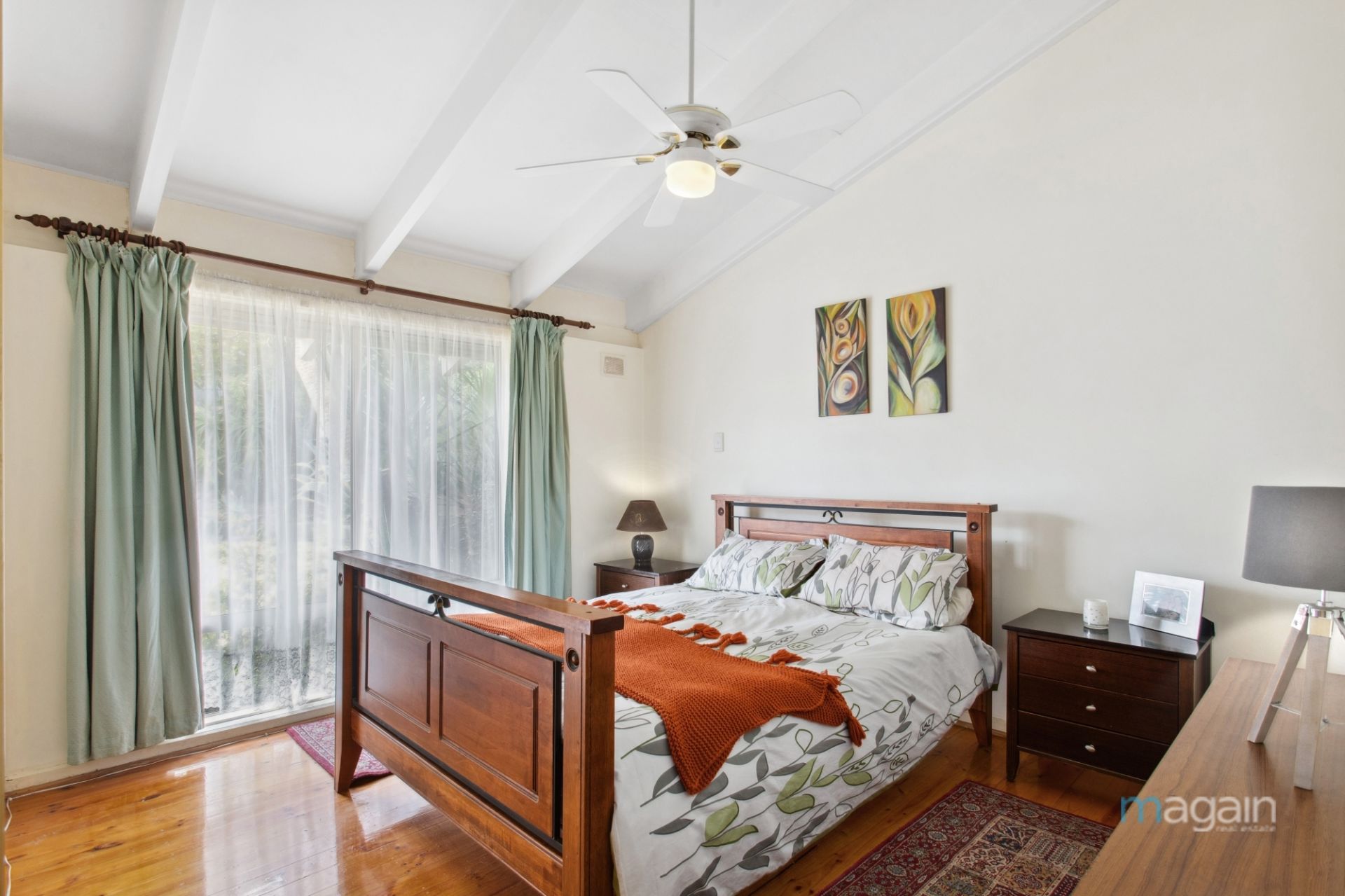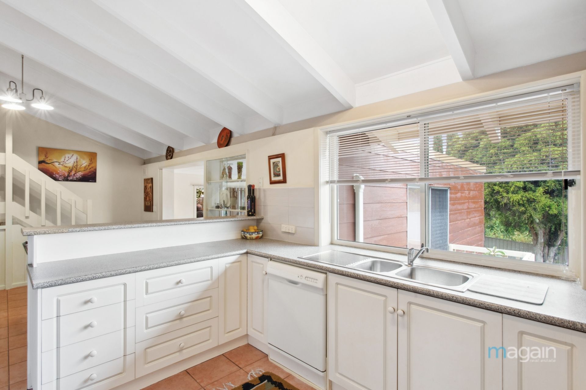 The three bedrooms, located on a split level to the left of the kitchen, all come with ceiling fans and include a master bedroom and bedroom three, both featuring built-in robes. They share easy access to the renovated main bathroom boasting modern feature tiles and stainless steel fixtures. Additional storage space is provided by a linen cupboard in the bathroom and a built-in cupboard in the laundry.
