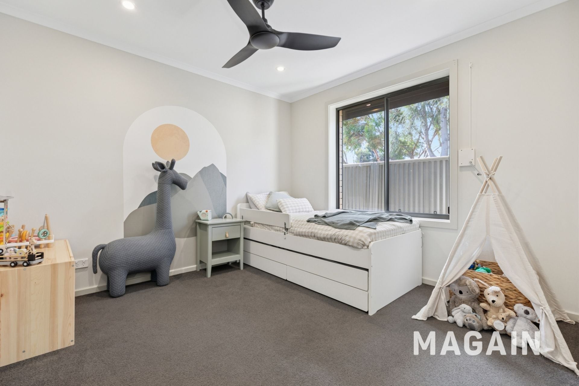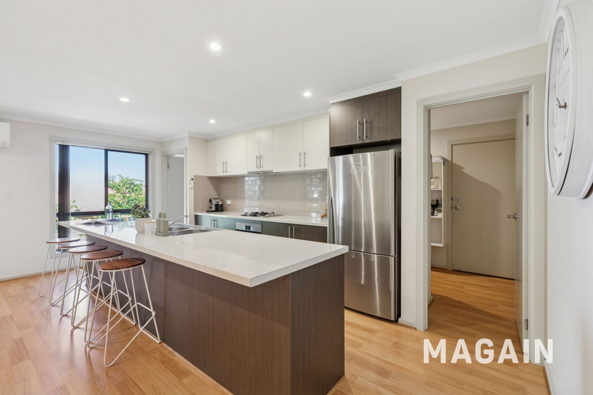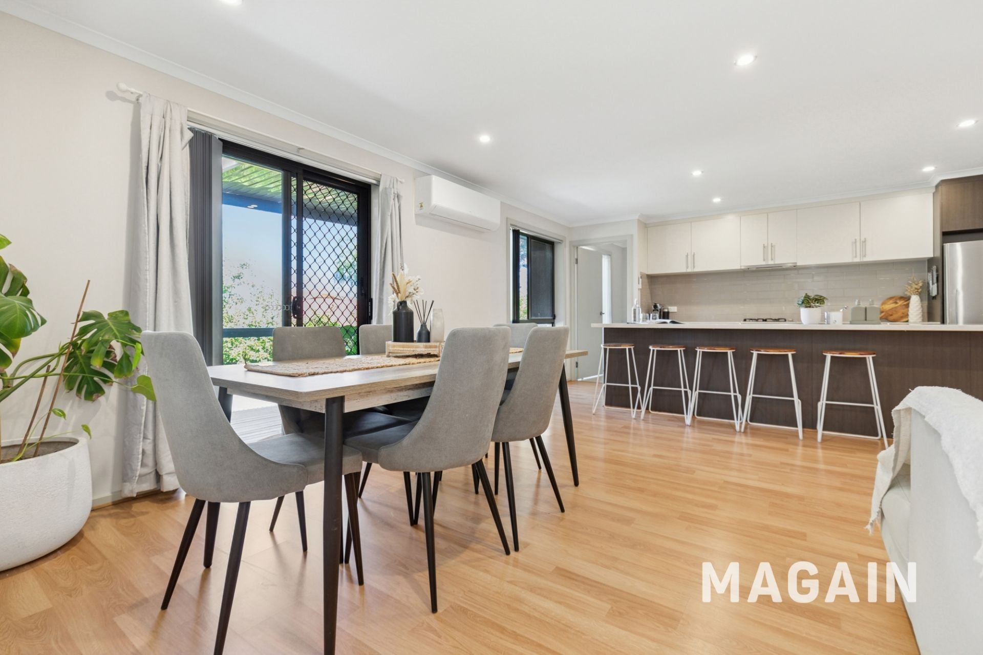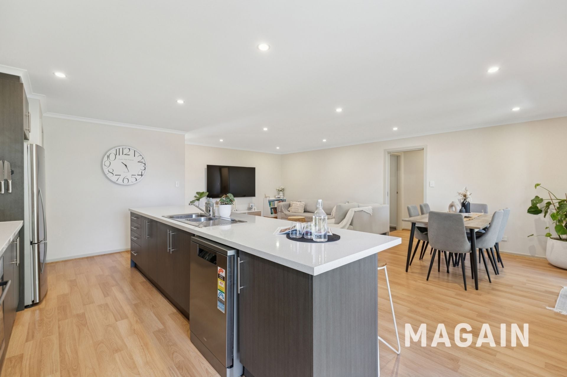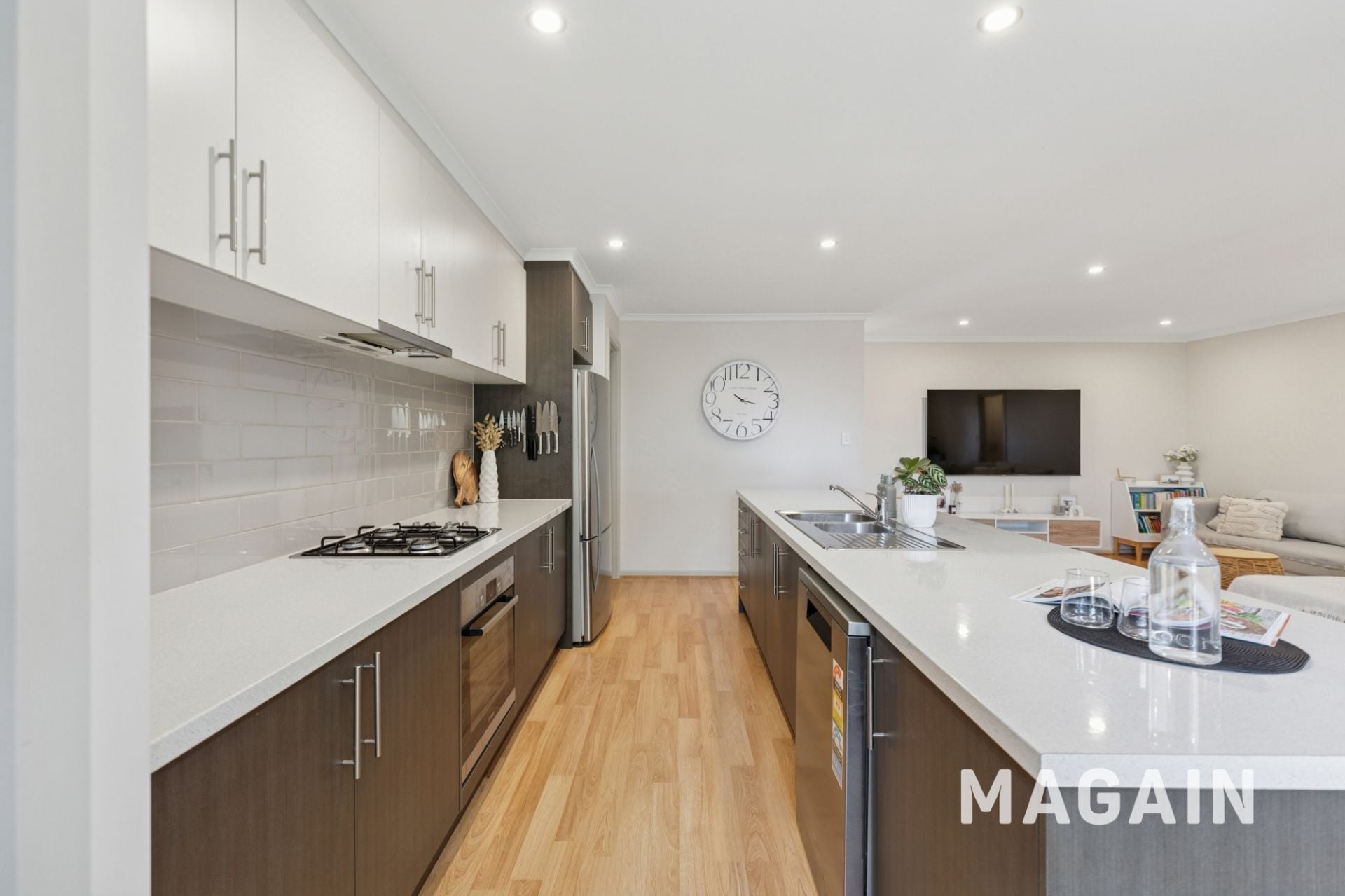 At the heart of the home, a spacious open plan kitchen, living, and dining area creates a welcoming and functional space for everyday living and entertaining. The modern kitchen is sure to impress, featuring an island bench with breakfast bar, generous walk-in pantry, quality appliances, a gas cooktop, Bosch oven, dishwasher, and ample bench space and storage. Floating floors throughout the main living areas, complemented by stylish downlights, enhance the home's contemporary appeal, while reverse cycle heating and cooling ensures year-round comfort.