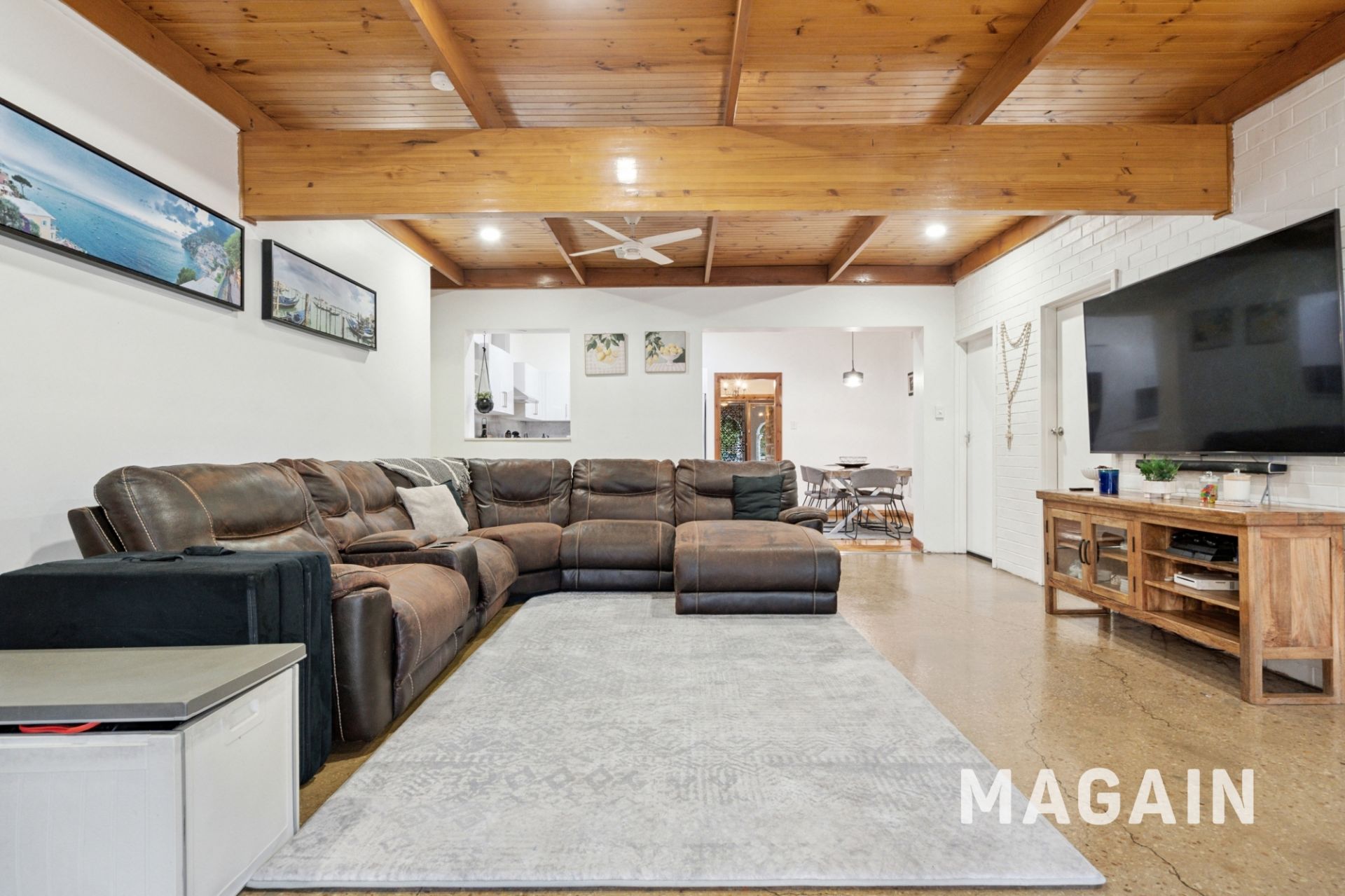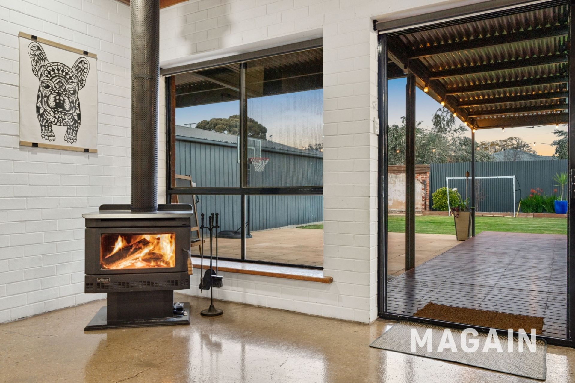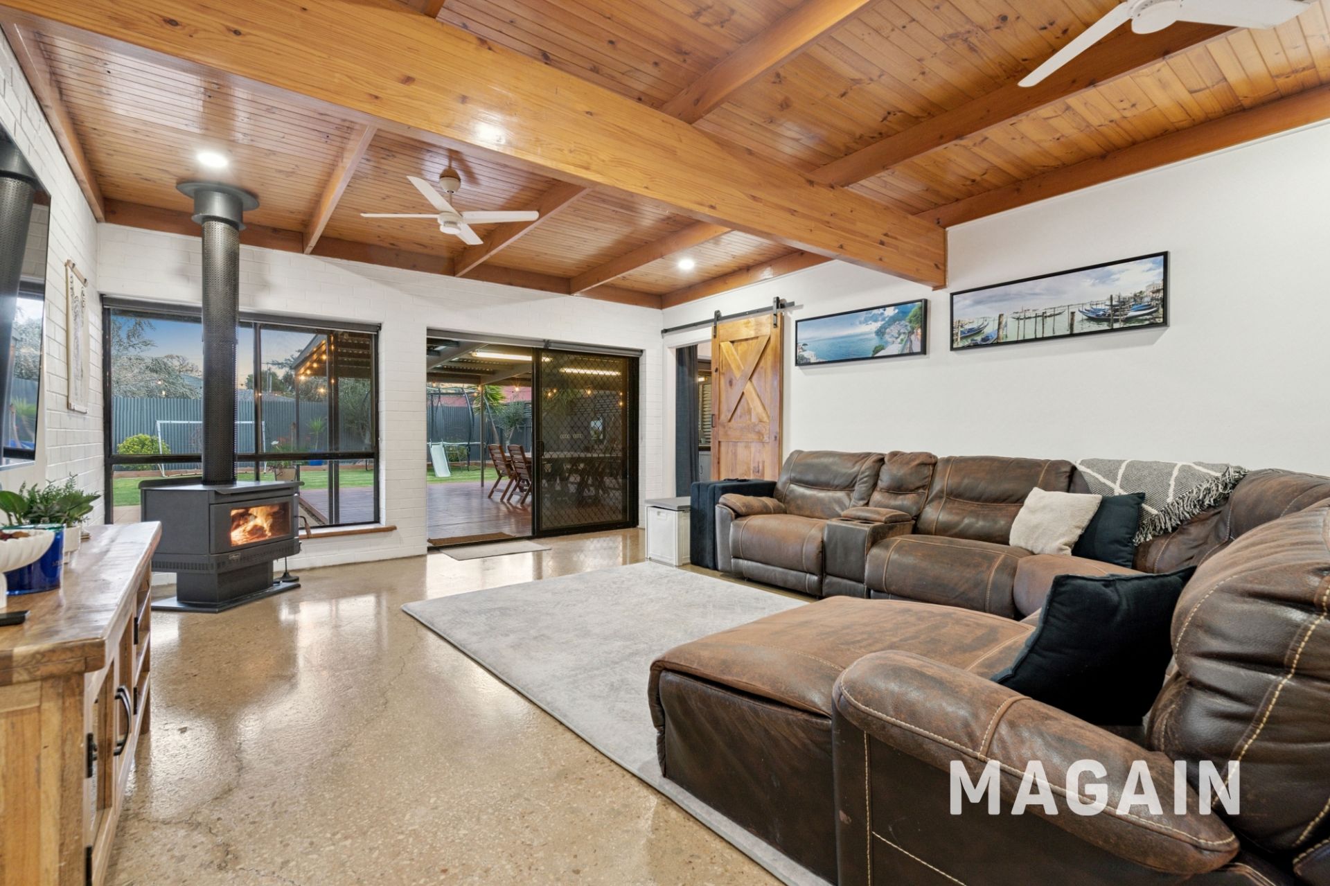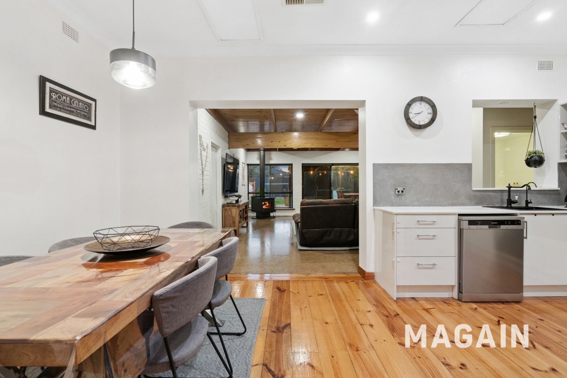 Two living zones give the household room to spread out. The cosy front lounge, with its fireplace and hanging pendant lighting, makes a natural hideaway on cooler evenings. At the rear, a vast family room acts as the showstopper, creating an instant sense of gathering. With two ceiling fans, a combustion heater, and a sliding glass door to the verandah, it's the kind of space that easily transforms from movie night to milestone celebrations. The adjoining kitchen and dining area have been tastefully modernised, creating a central hub that works as well for weeknight meals as it does for weekend entertaining.