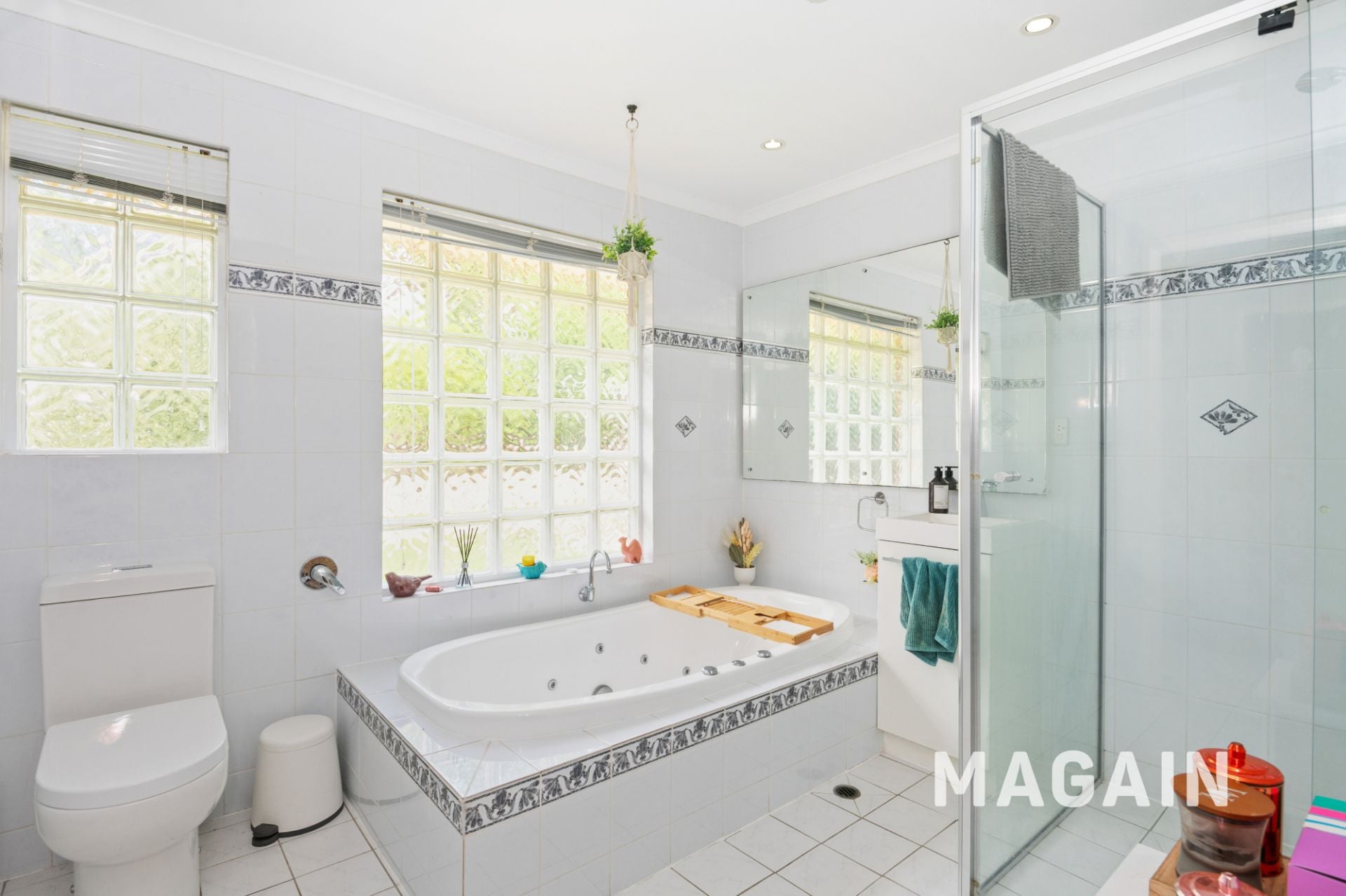 > Neat and airy bathroom with bath tub