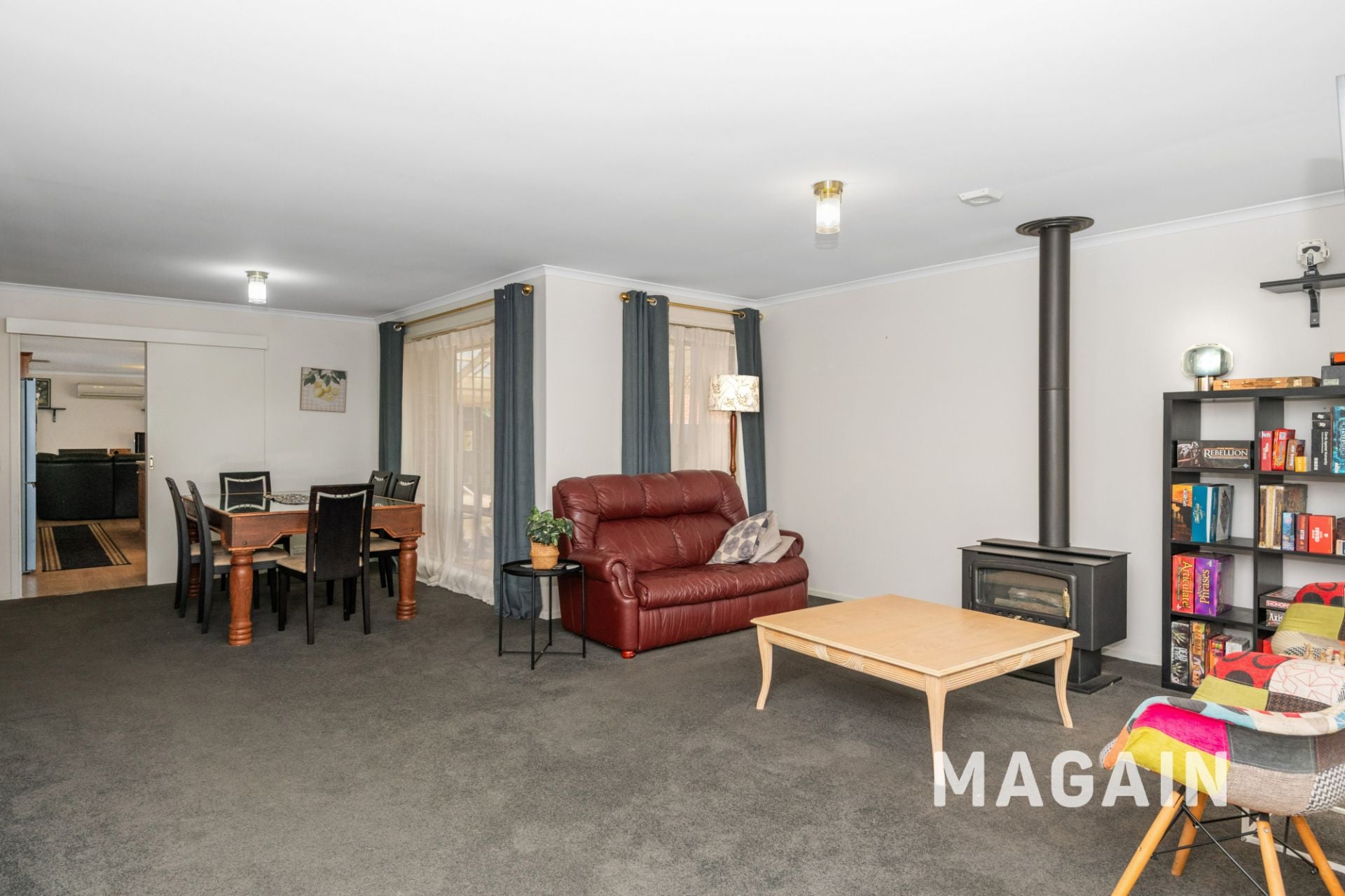 > Open plan dining and lounge area with combustion heater