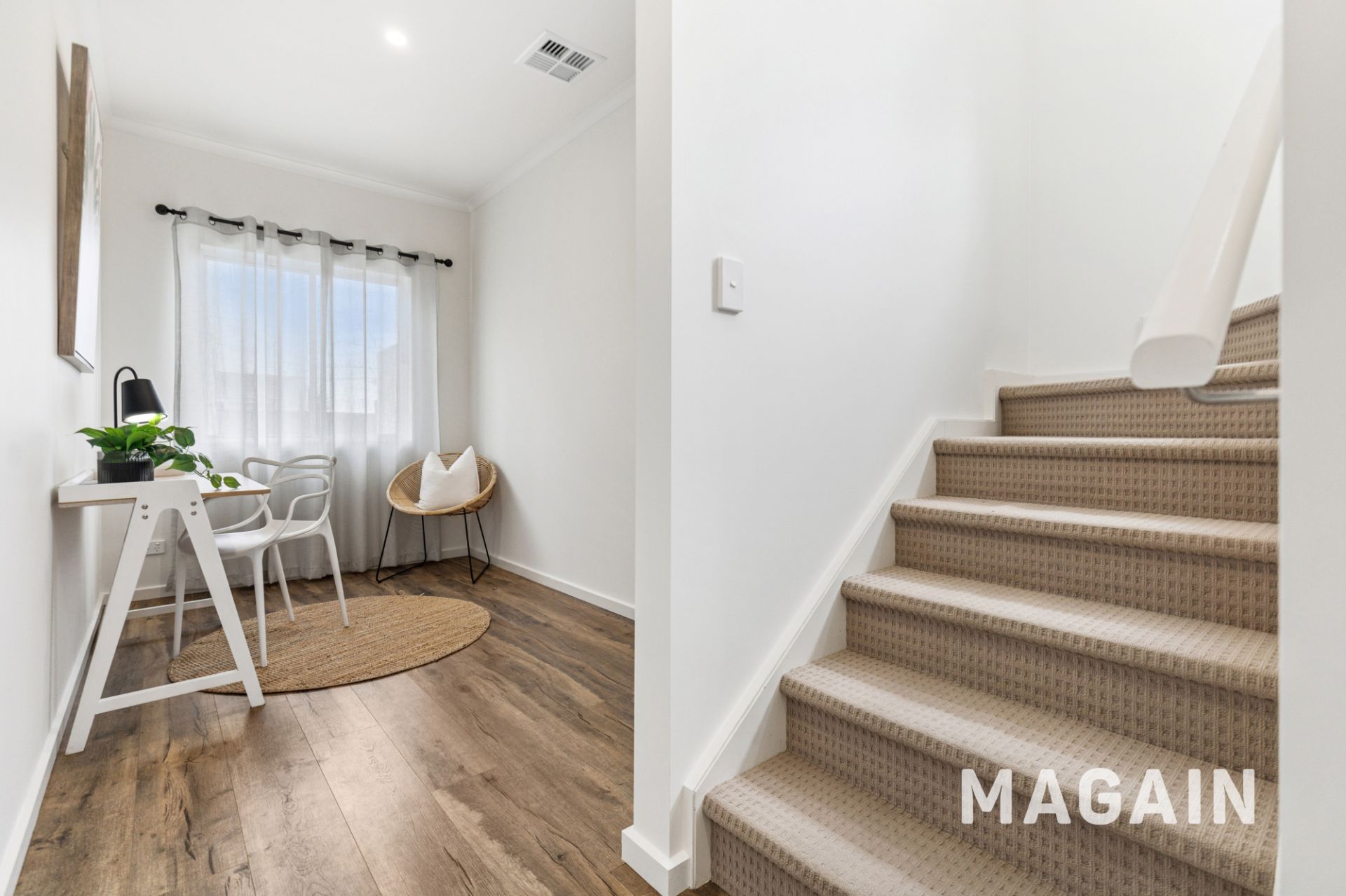 Downstairs, enjoy the open plan living and dining area overlooked by a sleek, modern kitchen, complete with a dishwasher and filtered water. There's also a handy study nook, a bonus powder room, and a cleverly concealed laundry located within the single garage, which features an automatic roller door and convenient internal access to the home.