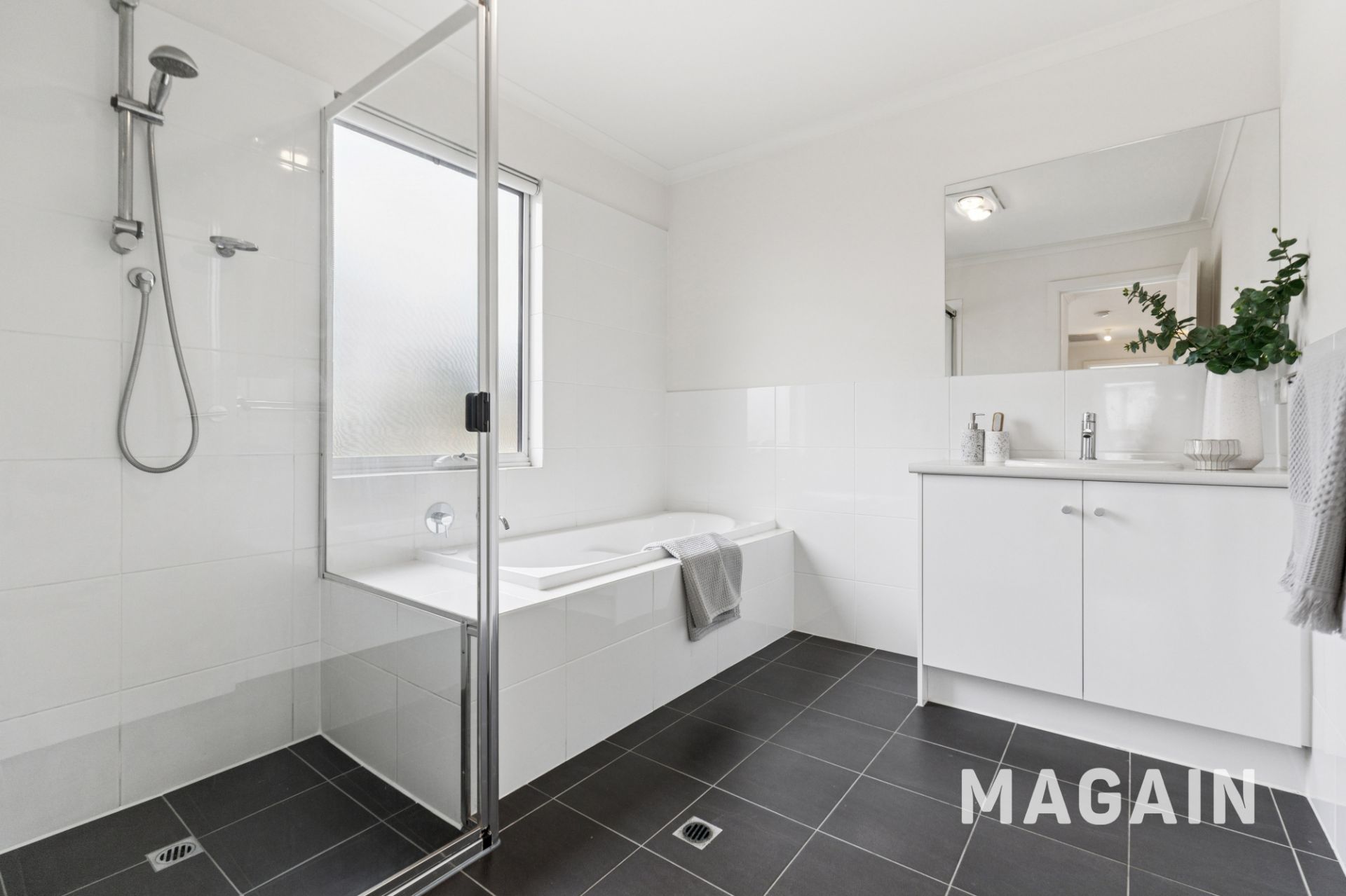 Upstairs, you'll find three generously sized bedrooms, each with built-in robes for plenty of storage. The large family bathroom includes a deep bath for soaking in, and a separate toilet for added practicality. The main bedroom also features a ceiling fan for extra comfort, complementing the ducted reverse cycle heating and cooling throughout.