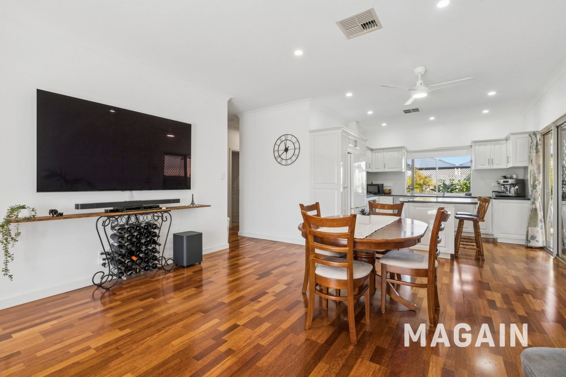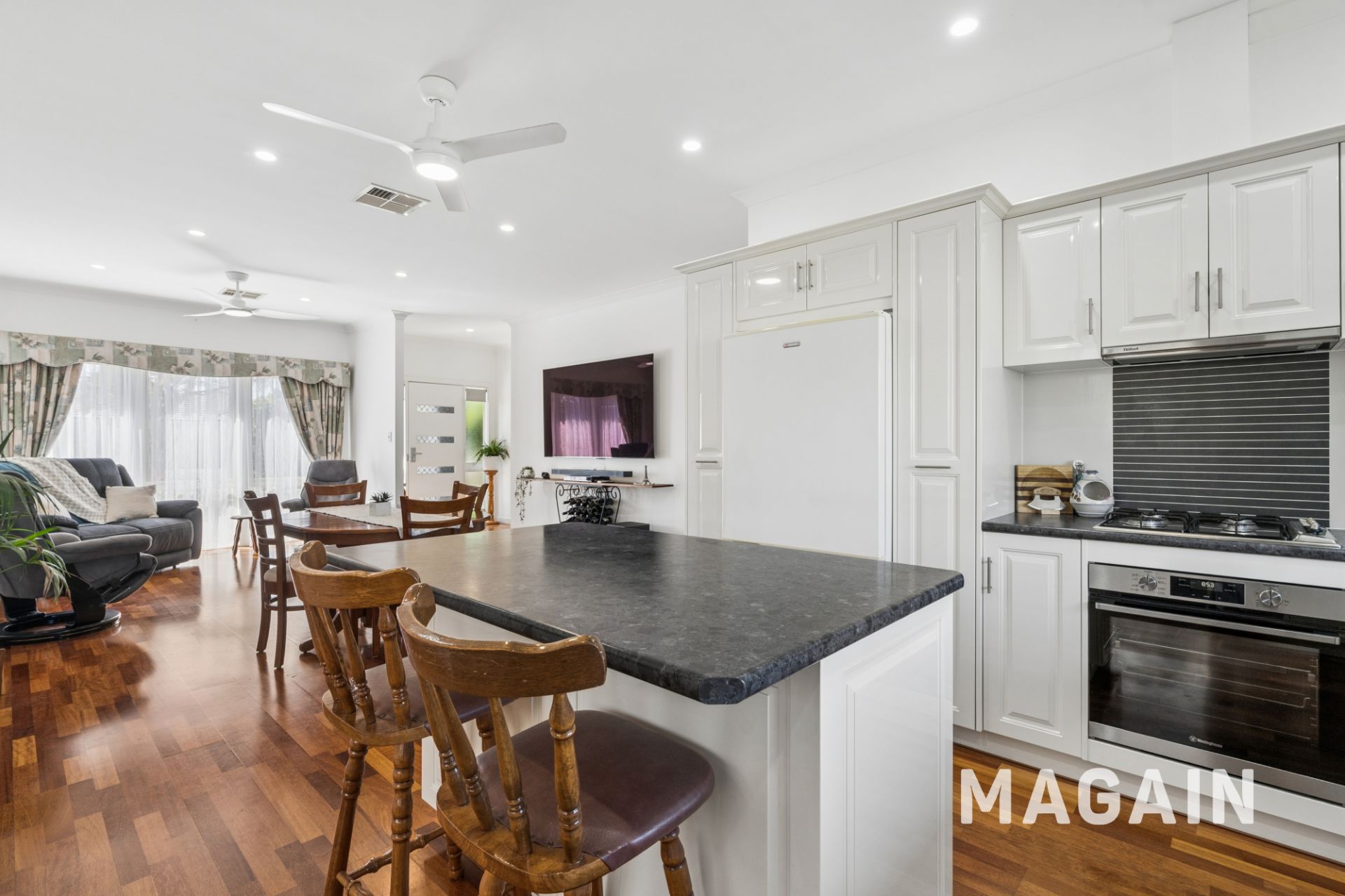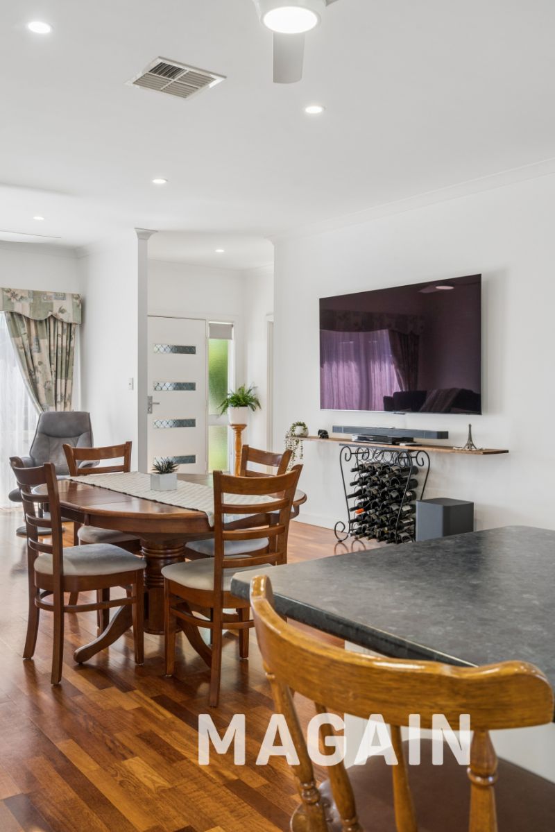 The home offers three generous bedrooms, all complete with built-in robes, while the master suite provides a private retreat featuring a walk-in robe, ensuite, and ceiling fan. A well-appointed main family bathroom services the additional bedrooms, making the layout both practical and family friendly. The heart of the home showcases an open plan living, kitchen, and dining area designed for easy everyday living and effortless entertaining. The contemporary kitchen is equipped with a gas cooktop, high-spec cabinetry, quality appliances, a Bosch dishwasher, and a recently updated multi-function oven with a range of versatile cooking options, ensuring both style and performance for the home chef.