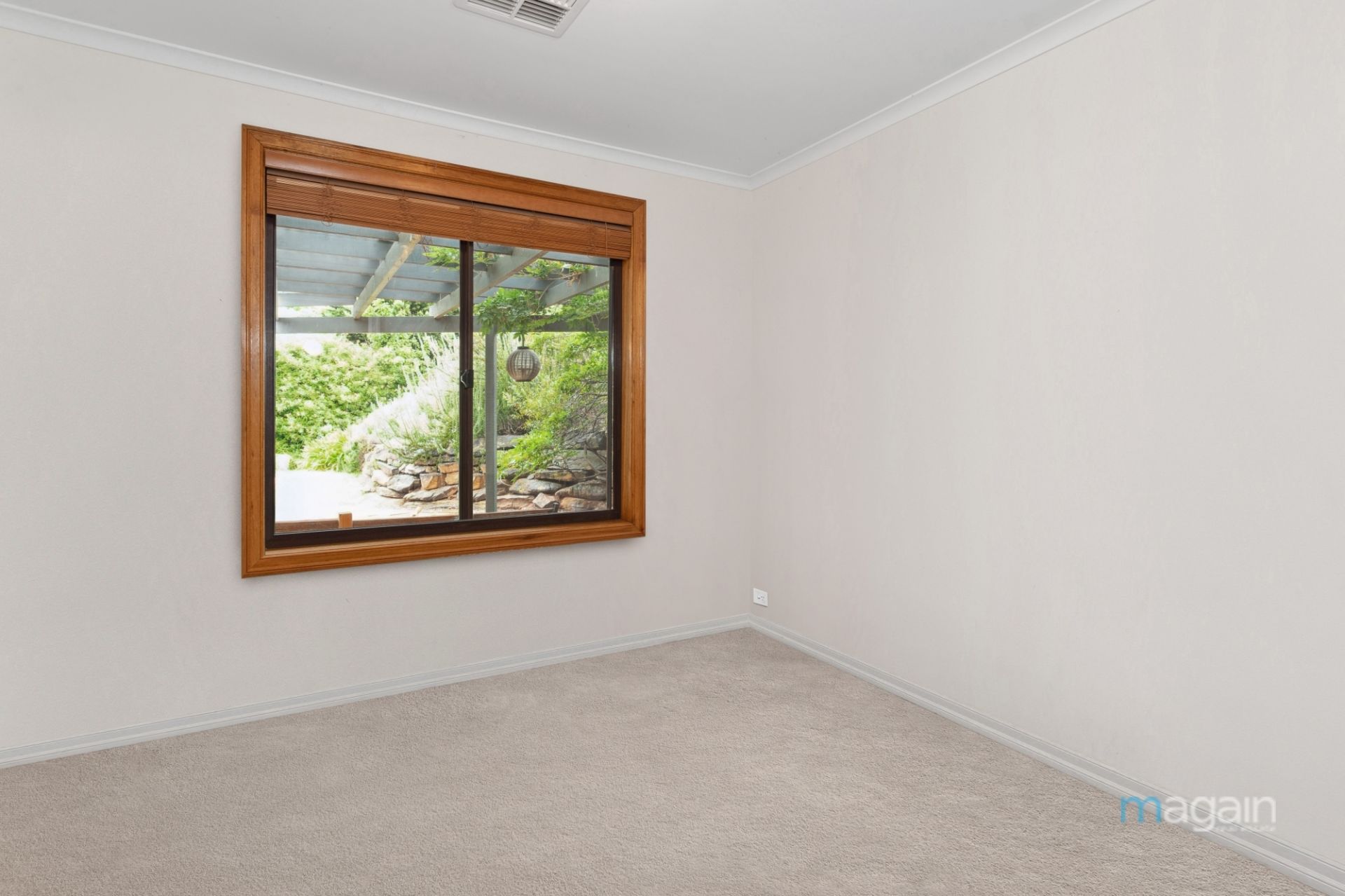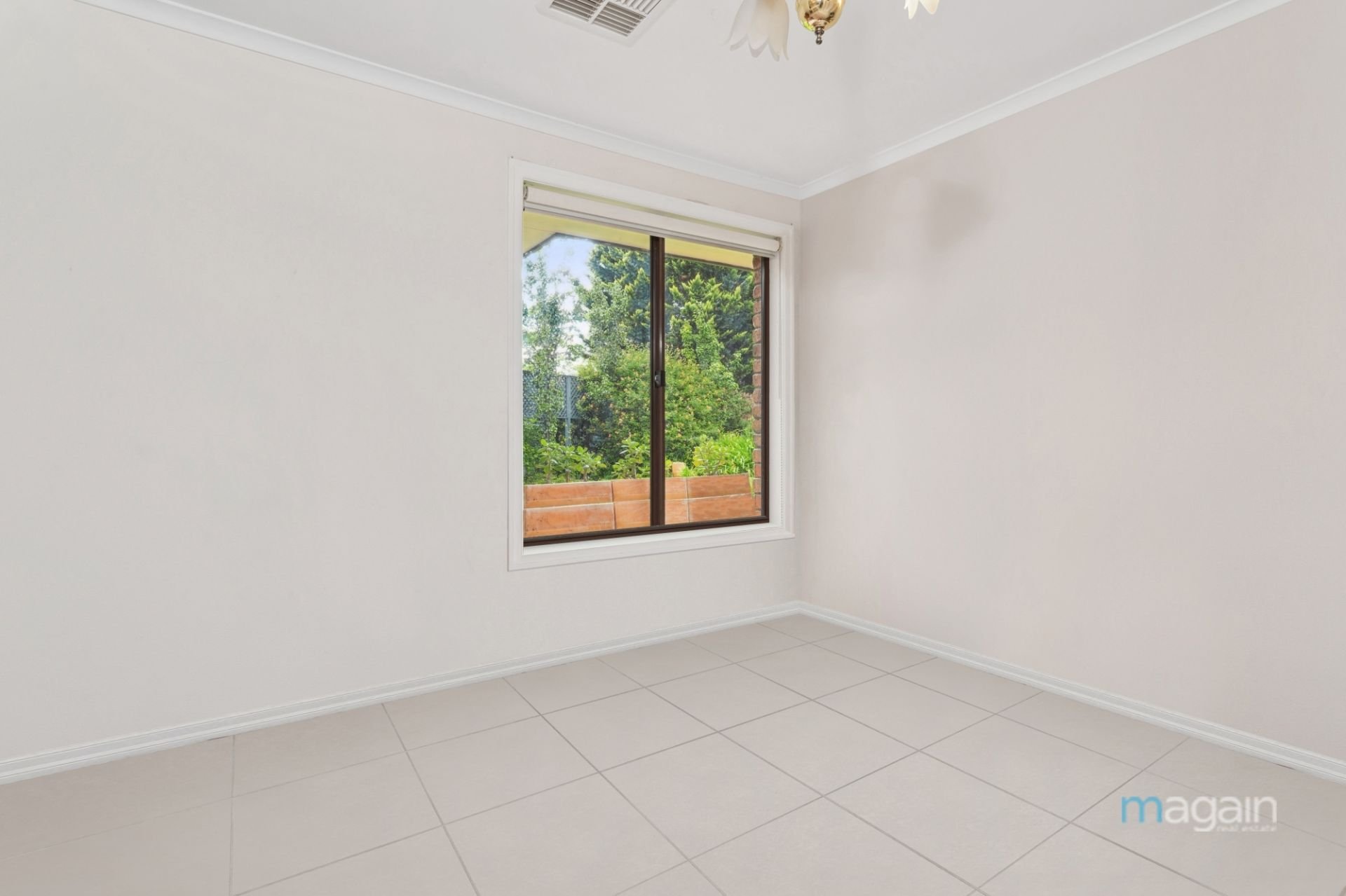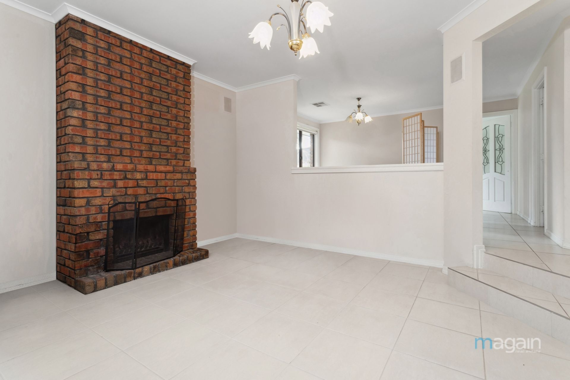 Upon entry, a warm and inviting sunken lounge room with a bay window and an adjacent formal dining area welcomes you. This versatile space is perfect for both entertaining guests and relaxing with loved ones, enhanced by ducted reverse cycle heating and cooling for year-round comfort.