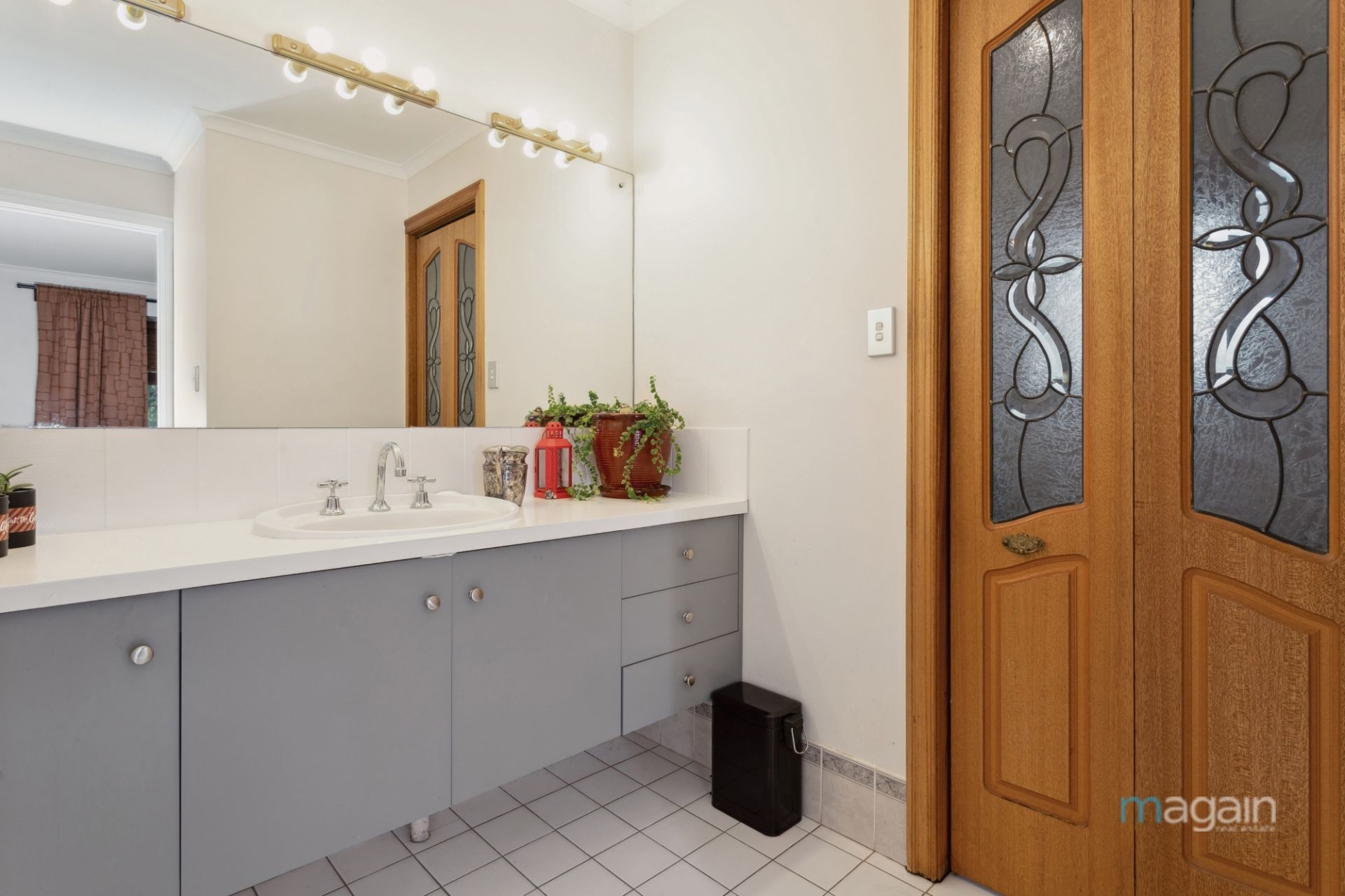 The home features four generously sized bedrooms, including a spacious master suite at the front of the house. The master is graced with a charming bay window, ceiling fan, large built-in wardrobe, and a private ensuite. The remaining three bedrooms are equally accommodating, offering easy access to the family-friendly main bathroom, which includes modern amenities, and a separate toilet and vanity area for added convenience on those busy mornings.