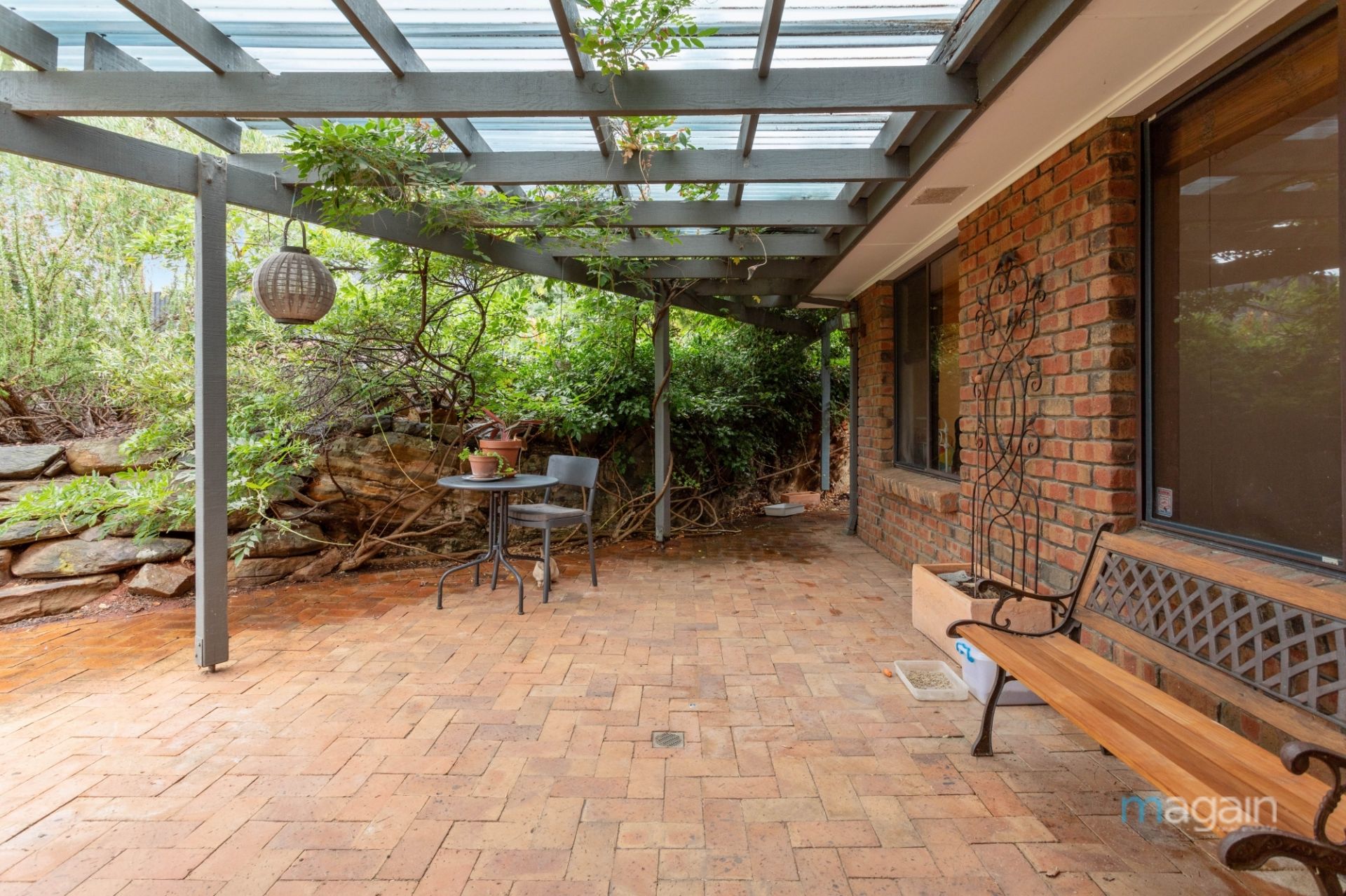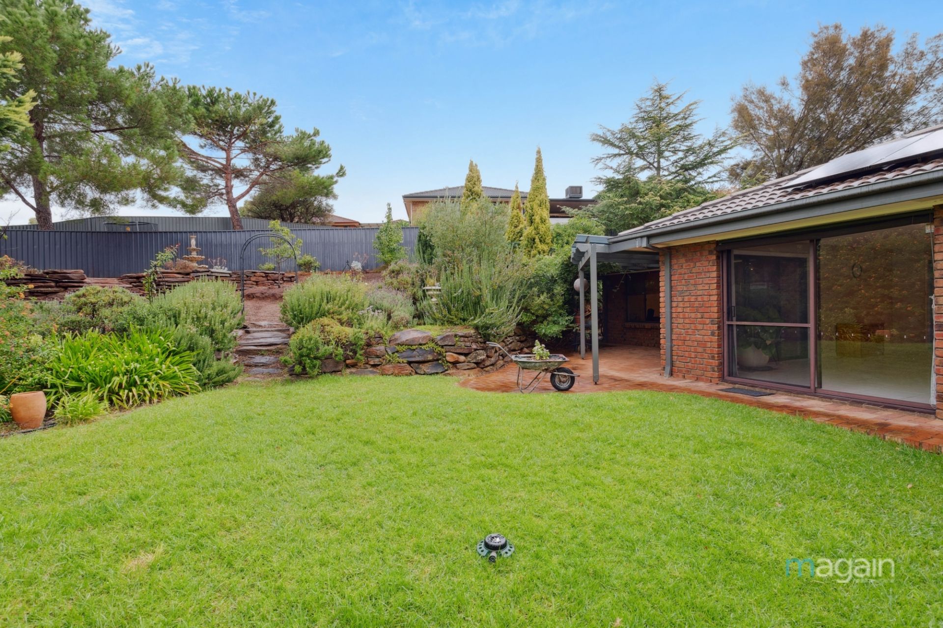 Glass sliding doors from the kitchen open to an expansive undercover verandah, perfect for outdoor entertaining and living. This space seamlessly extends the indoor living area to the outdoors, providing ample room for relaxation, dining, and socializing. The split-level backyard is a highlight, with a level lawn area surrounded by established trees and neat garden beds, complemented by a second smaller entertaining area off the family living room. A handy garden shed with a concrete floor provides additional storage.