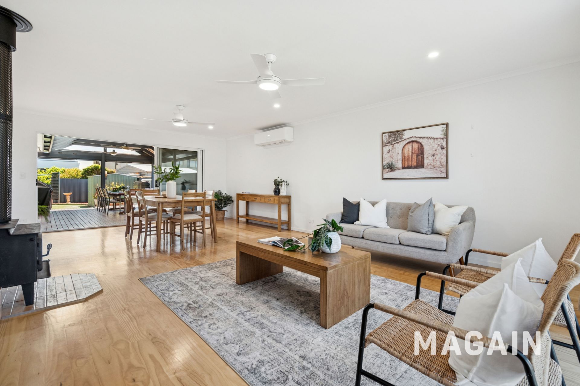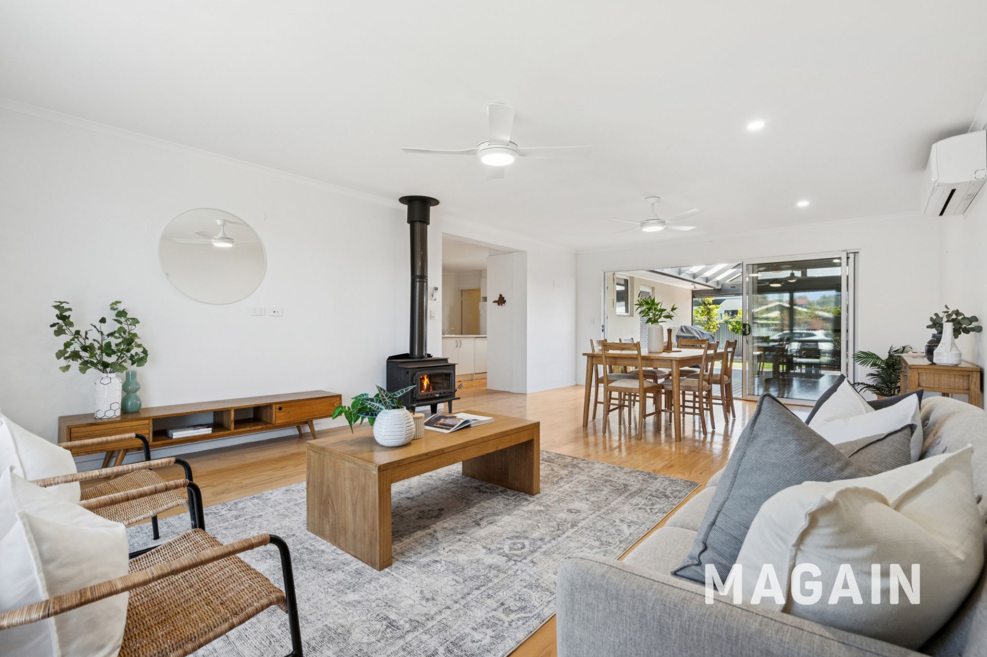 A beautiful relaxed living room of a generous space with a dining area adjacent all well serviced by a split system and a combustion heater gives great room and versatility, leading out through large glass sliding doors to a great entertaining area.