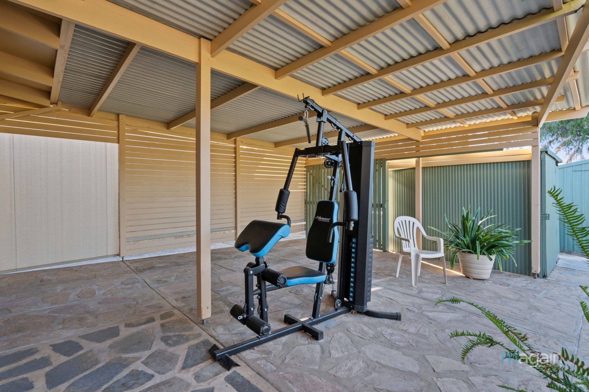 Outside, two pergolas offer ample space for entertaining, while the backyard shed adds handy storage for tools or weekend hobbies.