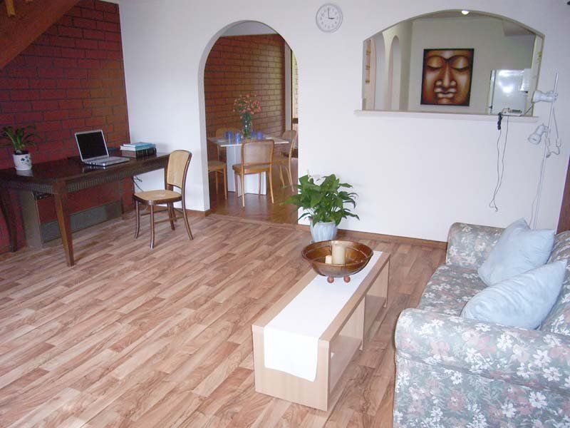 Downstairs comprises spacious formal lounge with laminated flooring, separate dining area adjacent compact, neat kitchen. The laundry and 2nd w.c is also on this level.