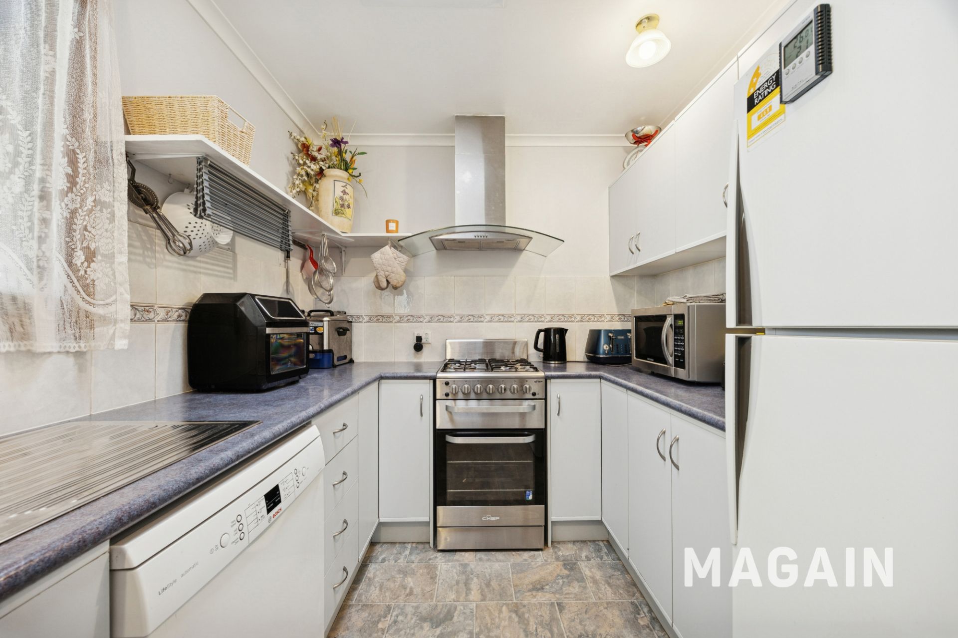 - Practical kitchen with gas cooking and dishwasher.