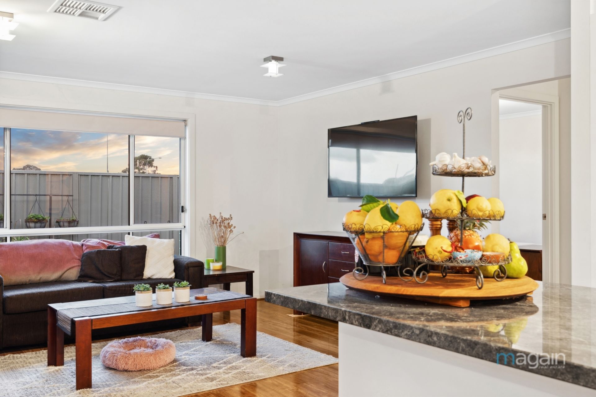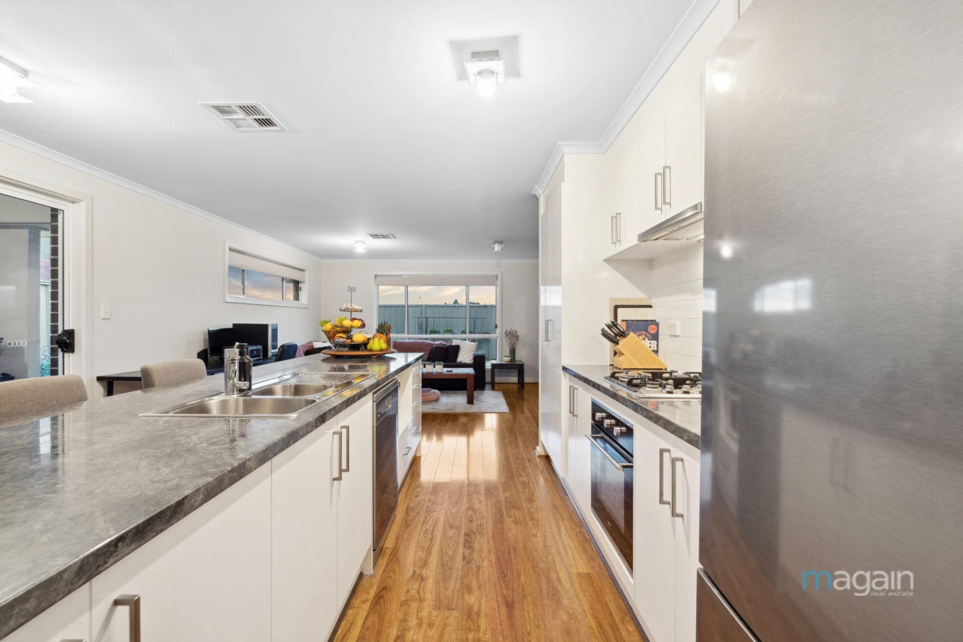 Further down the entry hall is private and secure internal access from the double garage and then you flow into what is an impressive open plan section of the home that includes a separate dining/meals area, a well appointed galley style kitchen and a living/lounge room at the rear with a sneaky view of the hills and iconic local vineyards in the distance.