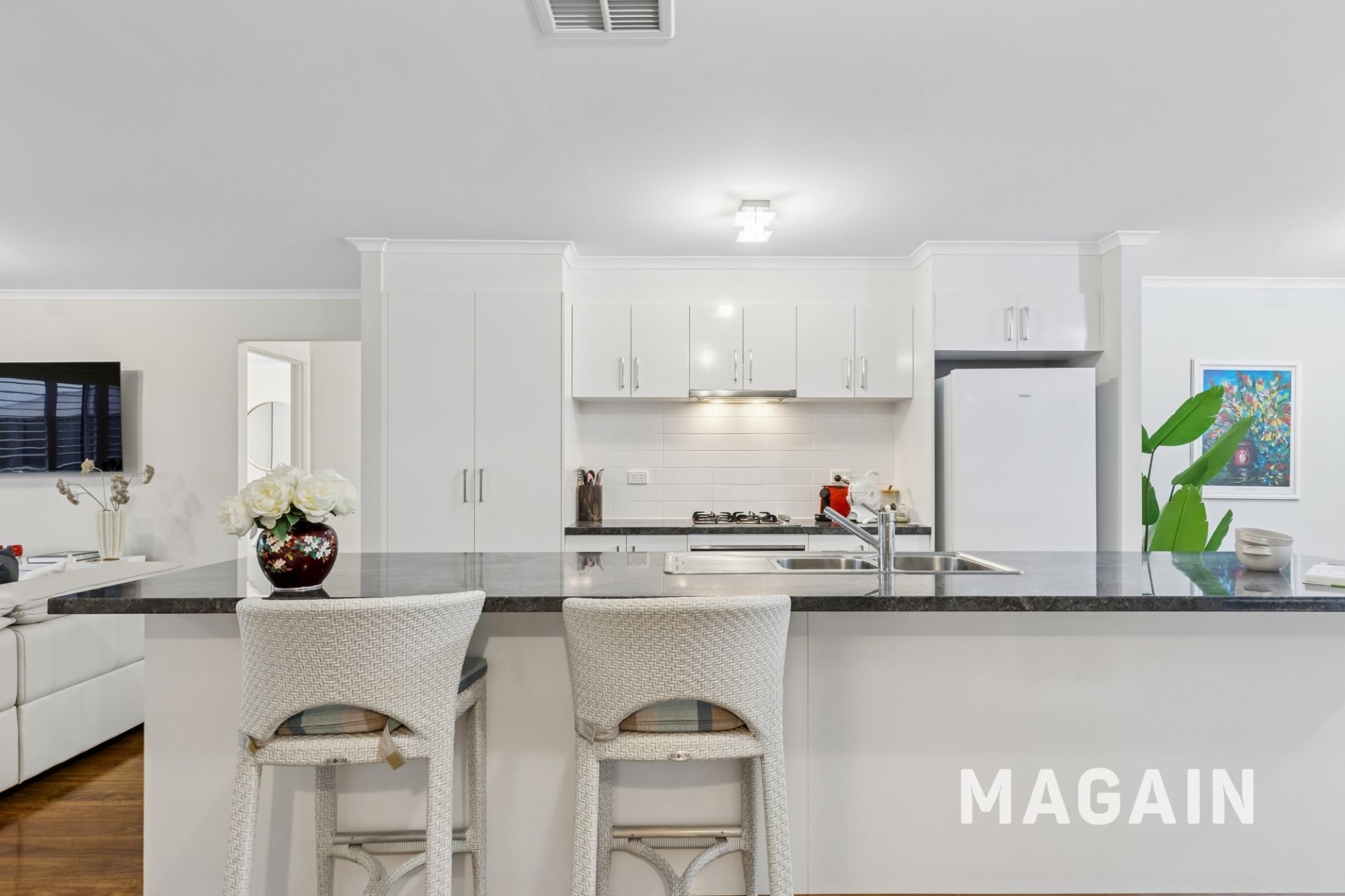 The main bedroom is positioned at the front of the home and features a walk-in robe and a well-sized ensuite with a large vanity. Further along, the hall provides secure internal access from the garage before opening to the heart of the home - an impressive open-plan living, dining and kitchen area. This space is flooded with natural light and enjoys a sneaky view of the hills and iconic local vineyards, creating the perfect backdrop for everyday living or entertaining guests.