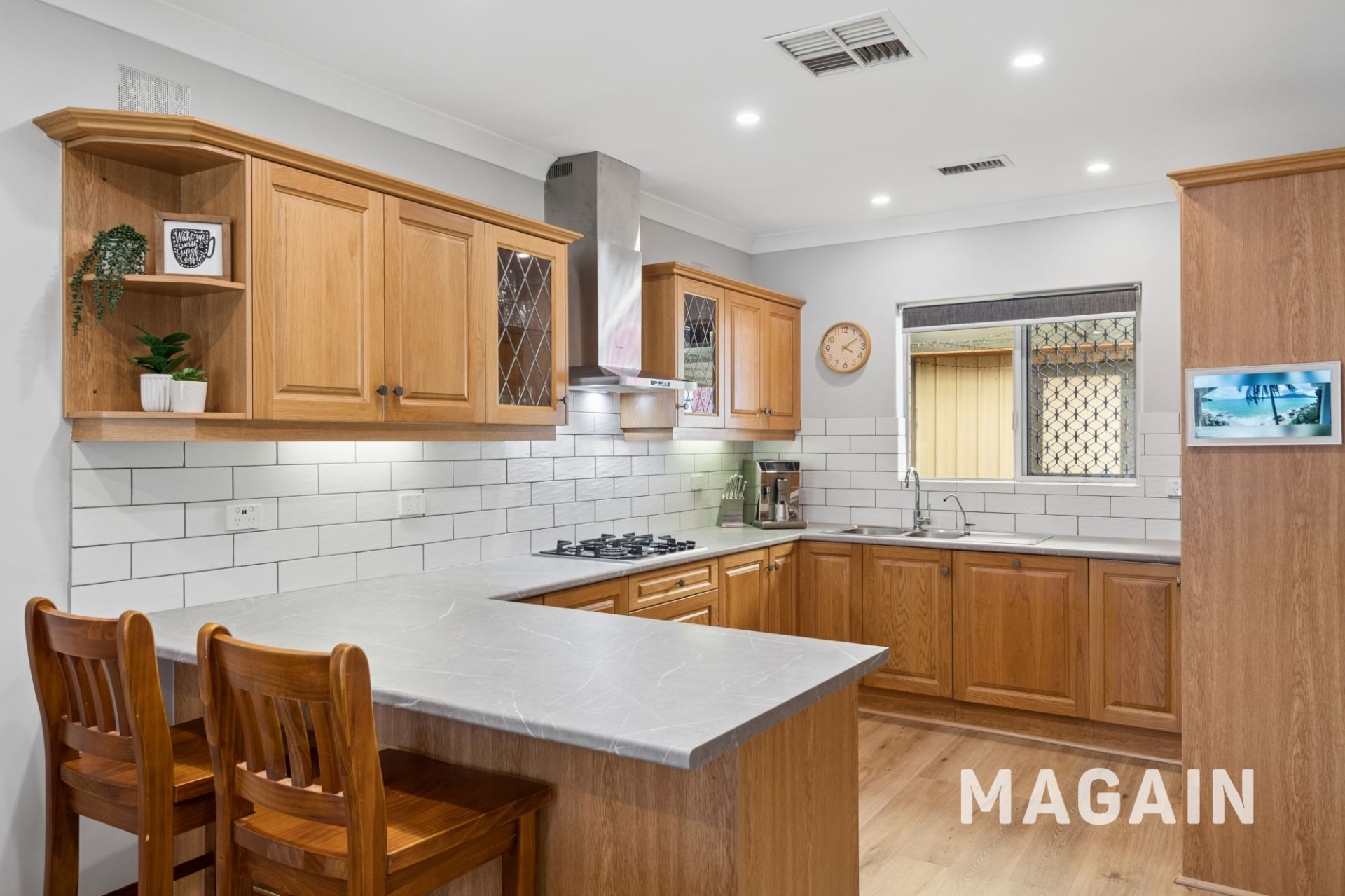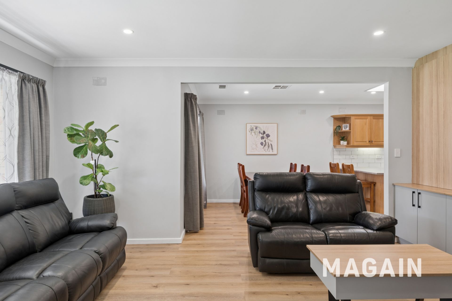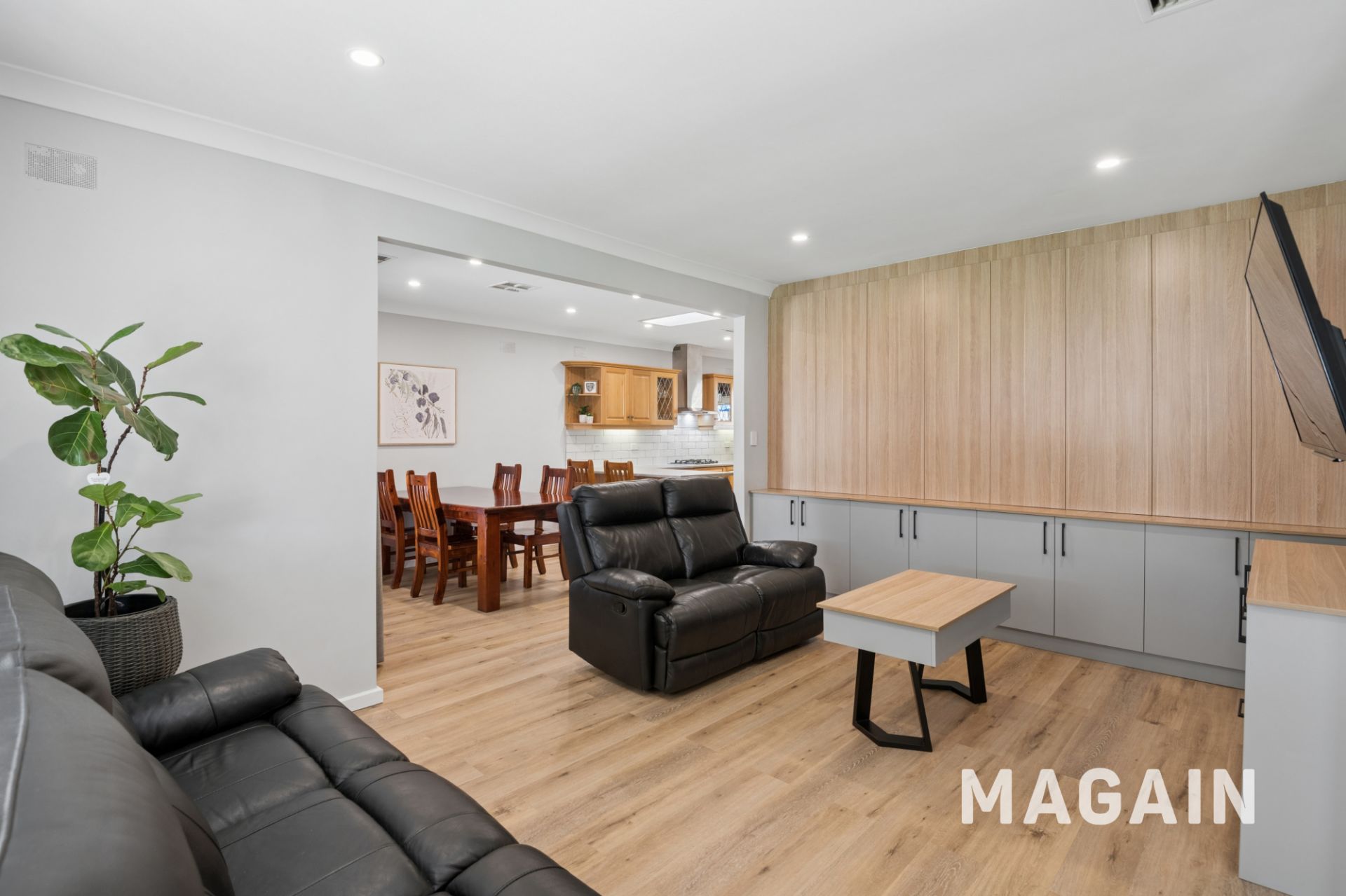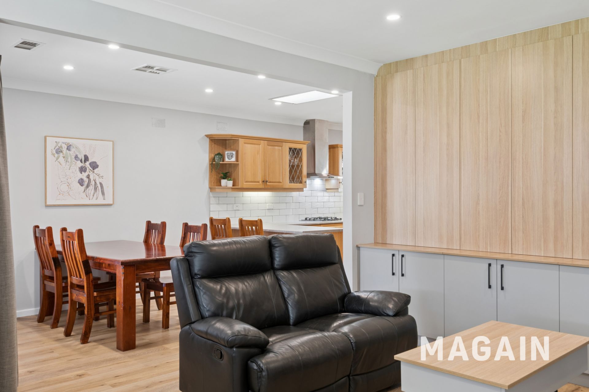 Downlights and hybrid flooring compliment the bright neutral colour scheme, and there's extensive built-in-cabinetry throughout the home making it ever-so practical for families.