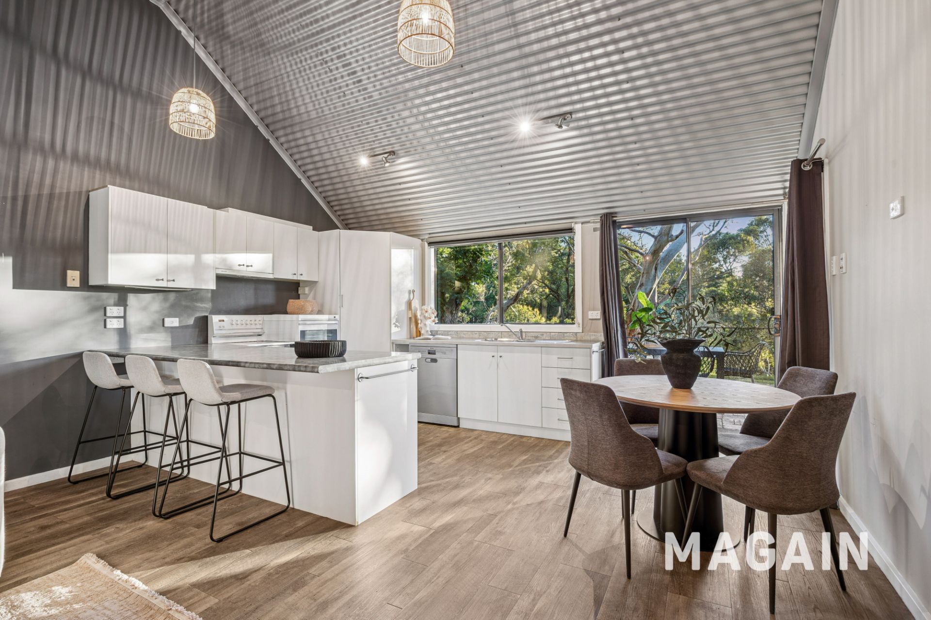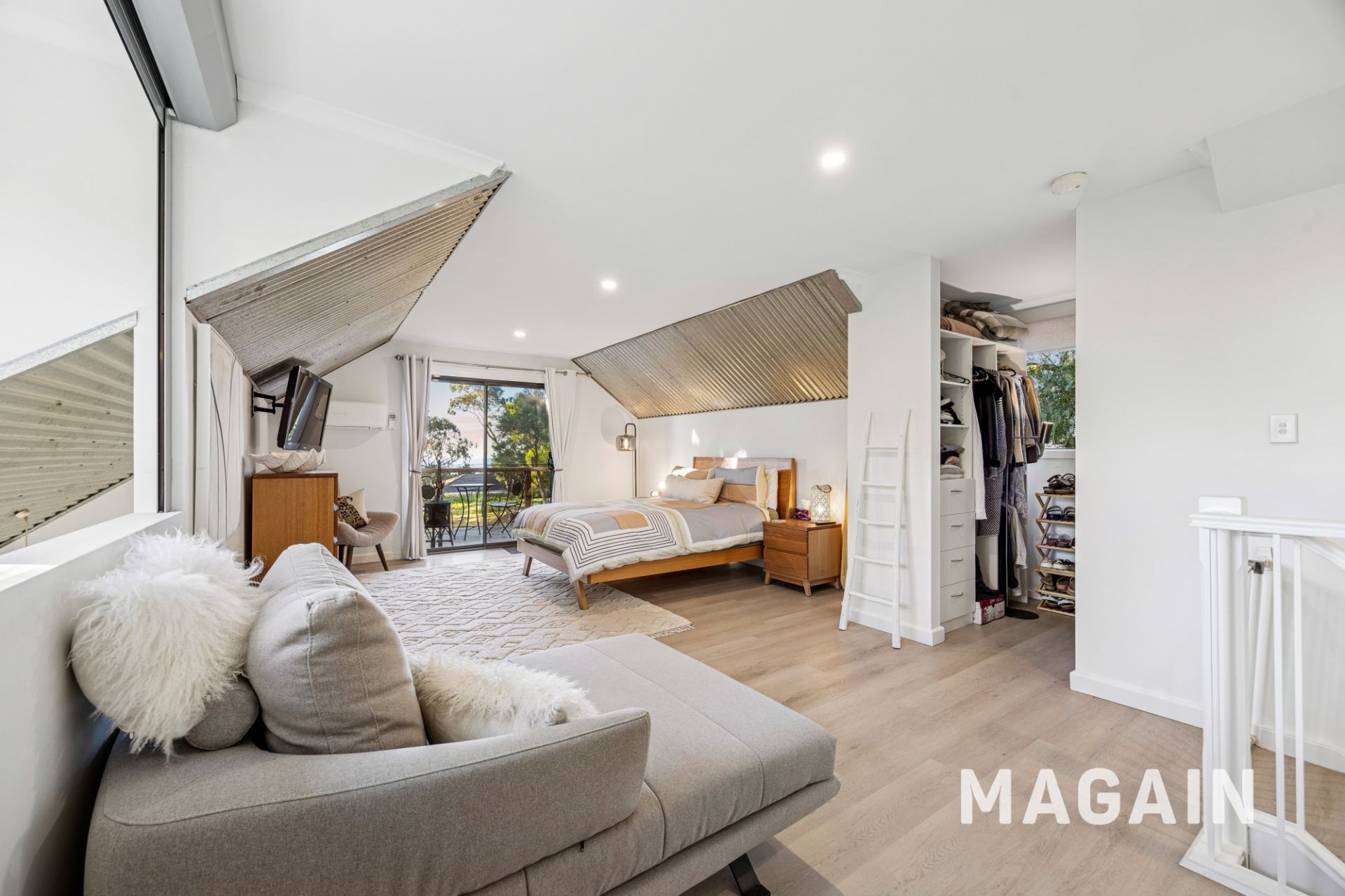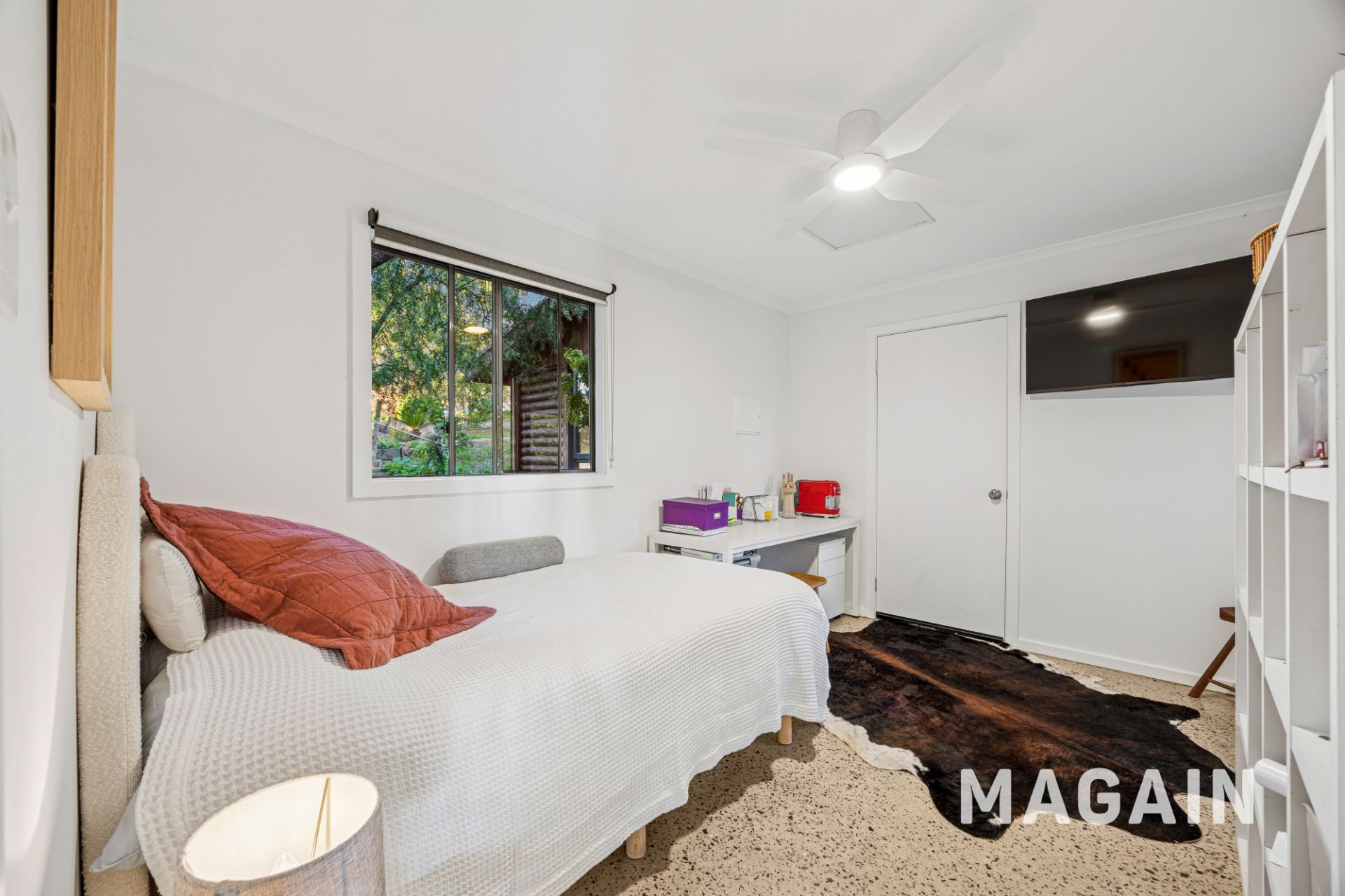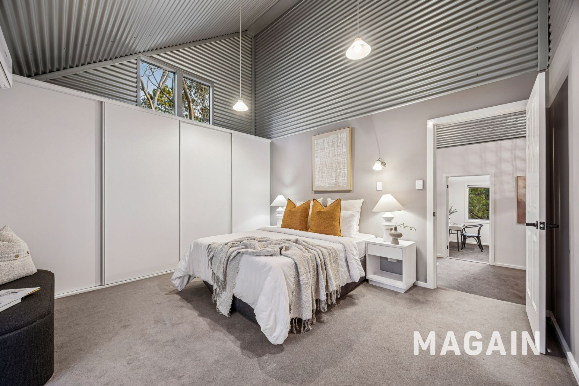 The smaller section of the home exudes comfort and modern flair. The open-plan kitchen, dining, and living area has been thoughtfully updated, complete with a dishwasher, electric cooktop, stone benchtops, and generous storage. A slow combustion heater and bi-fold doors seamlessly connect the interior to a decked entertaining area with tranquil outlooks. The fully renovated bathroom and laundry include a double vanity and quality finishes, while the second bedroom features a built-in robe and is conveniently accessed via a versatile study space. Upstairs, the loft-style main bedroom impresses with a walk-in robe and its own private balcony, perfectly positioned to take in the stunning views.