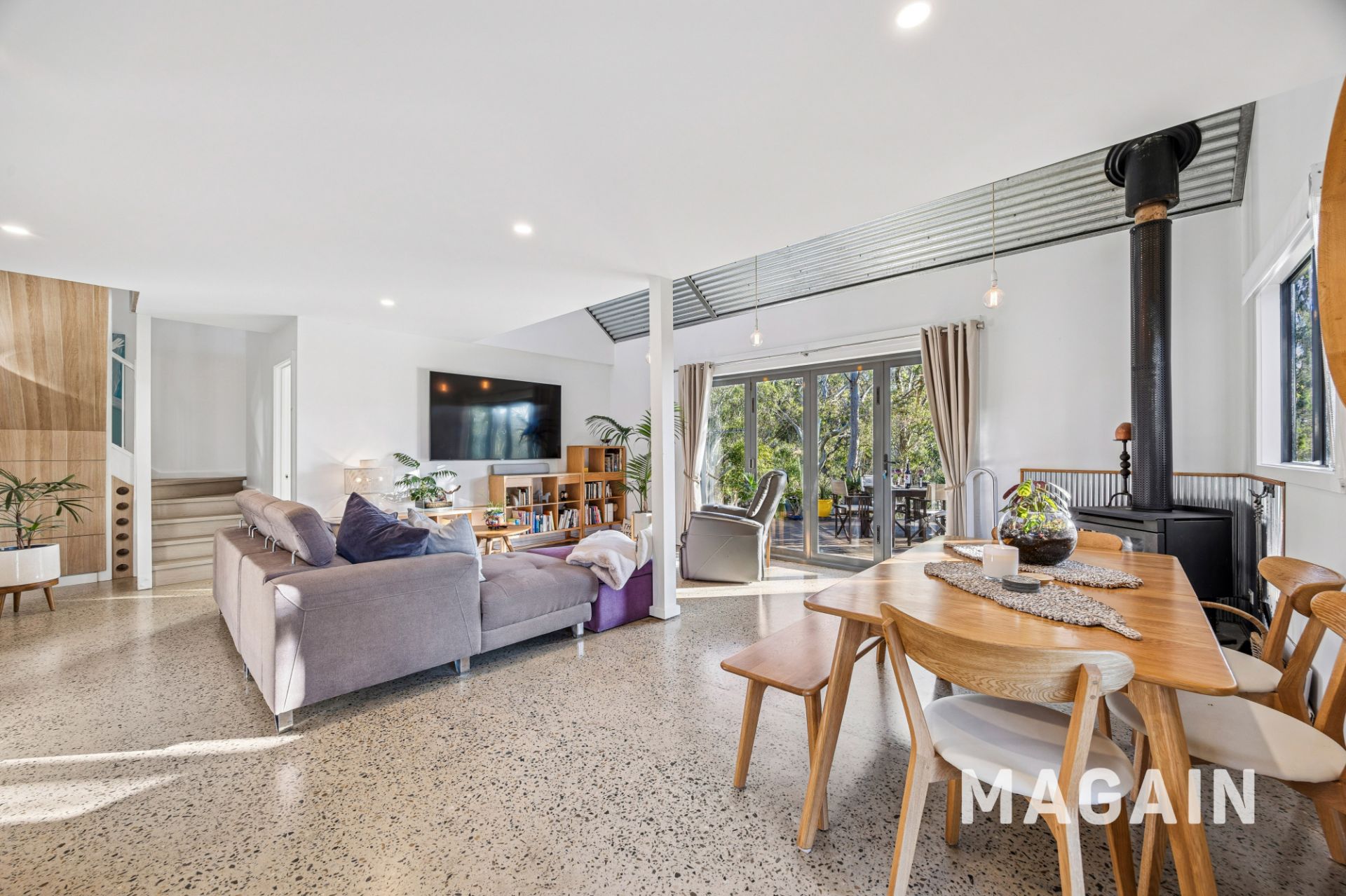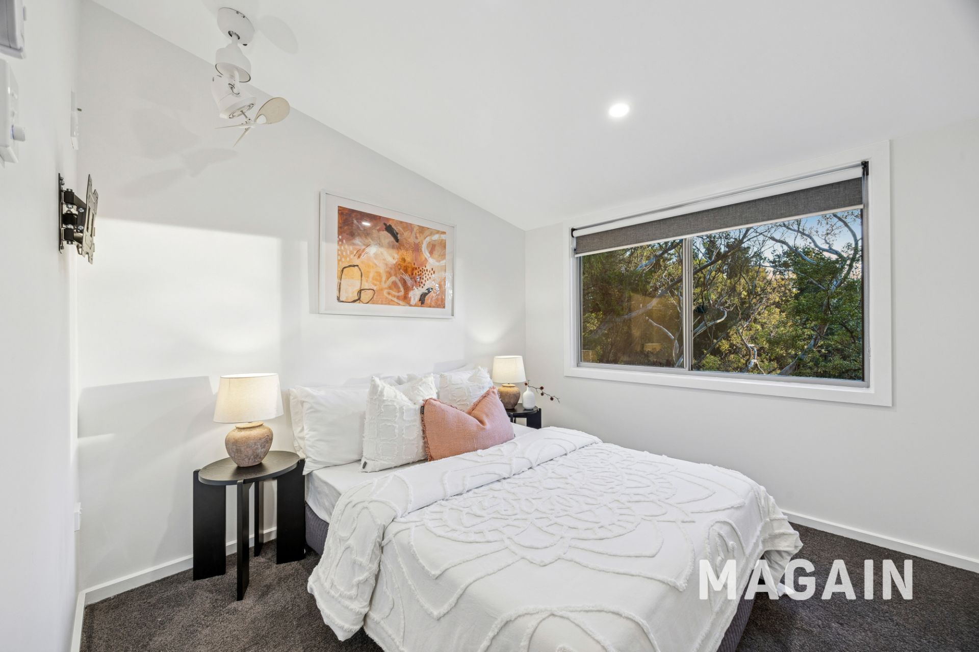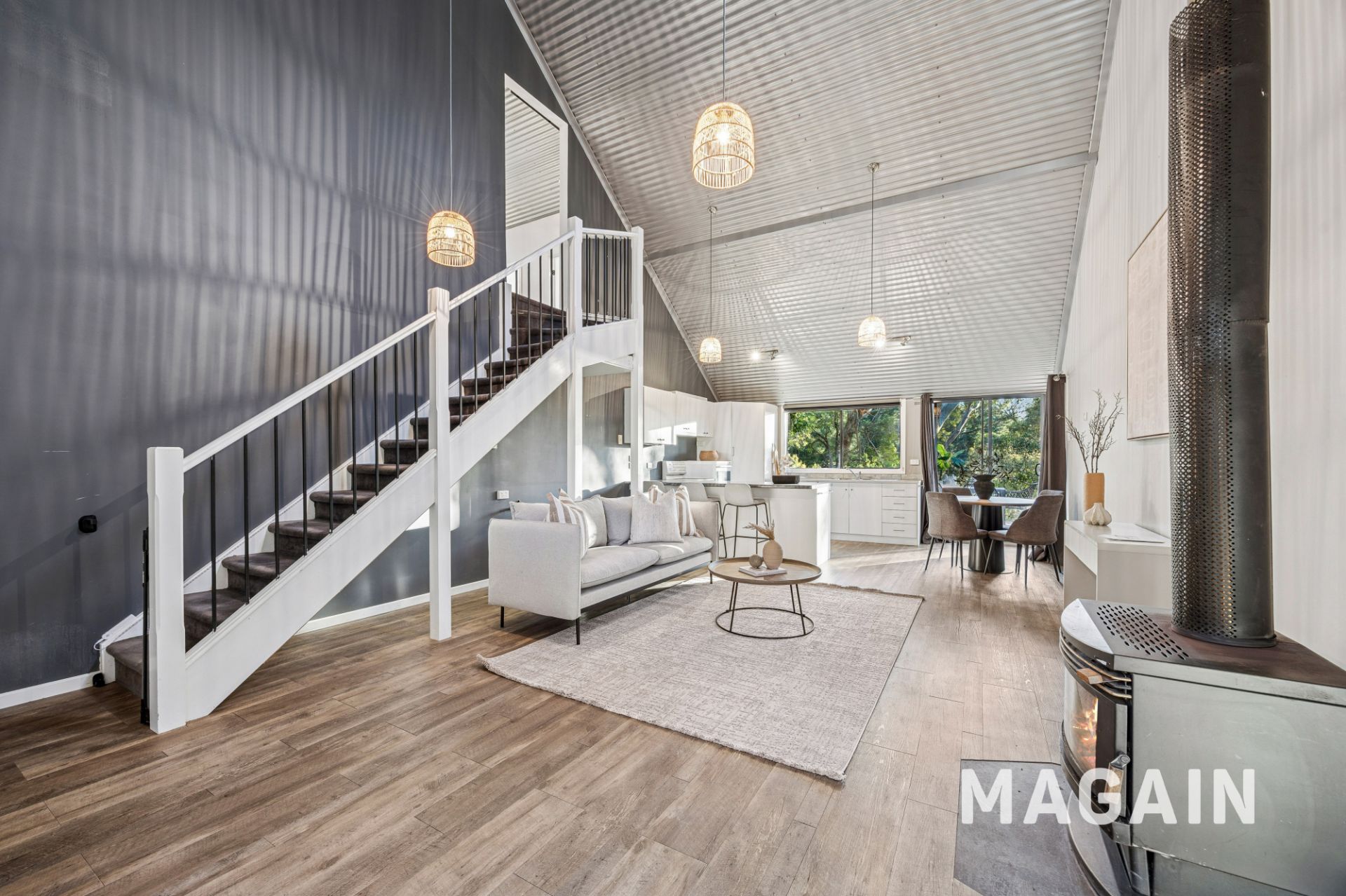 The smaller section of the home exudes comfort and modern flair. The open-plan kitchen, dining, and living area has been thoughtfully updated, complete with a dishwasher, electric cooktop, stone benchtops, and generous storage. A slow combustion heater and bi-fold doors seamlessly connect the interior to a decked entertaining area with tranquil outlooks. The fully renovated bathroom and laundry include a double vanity and quality finishes, while the second bedroom features a built-in robe and is conveniently accessed via a versatile study space. Upstairs, the loft-style main bedroom impresses with a walk-in robe and its own private balcony, perfectly positioned to take in the stunning views.