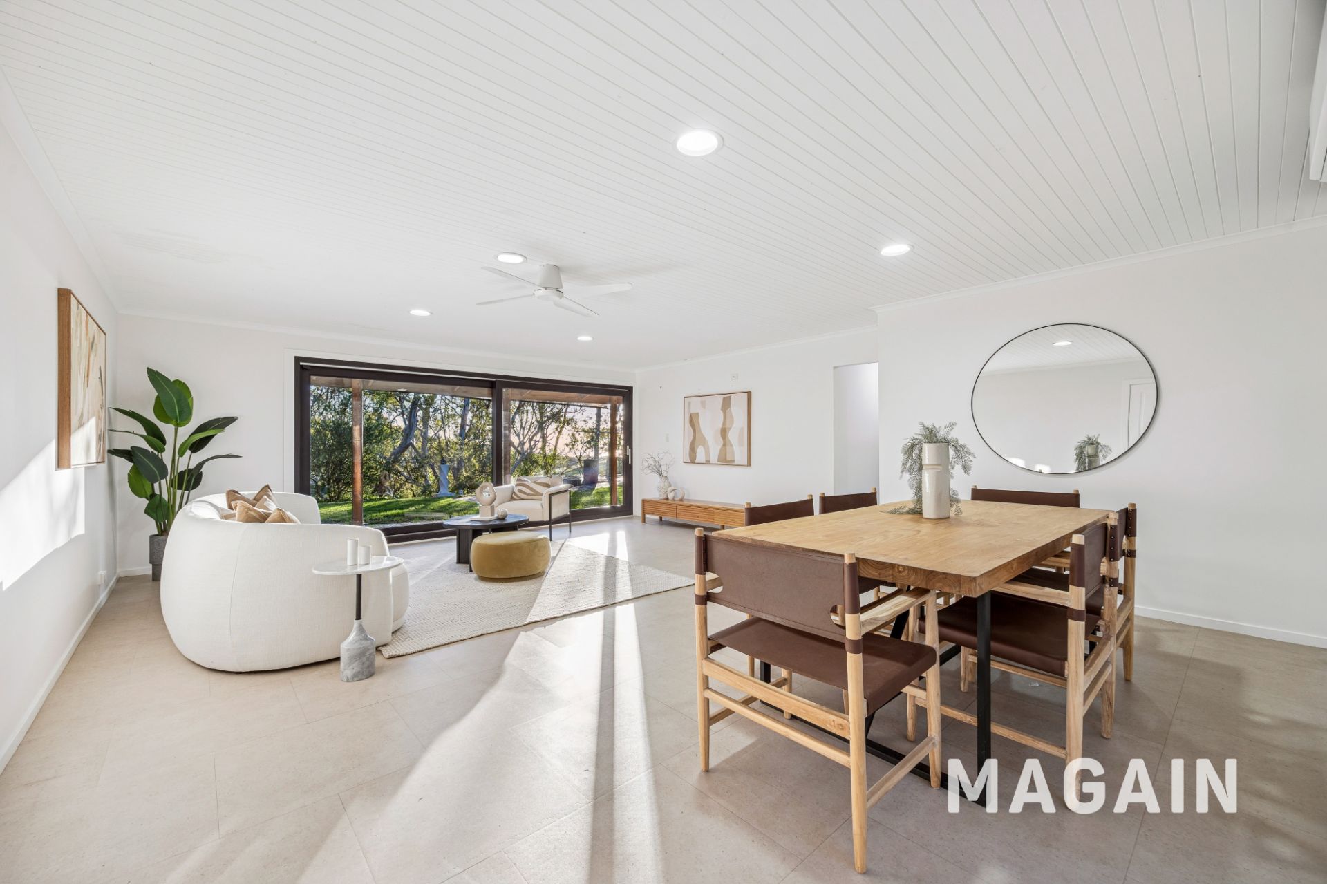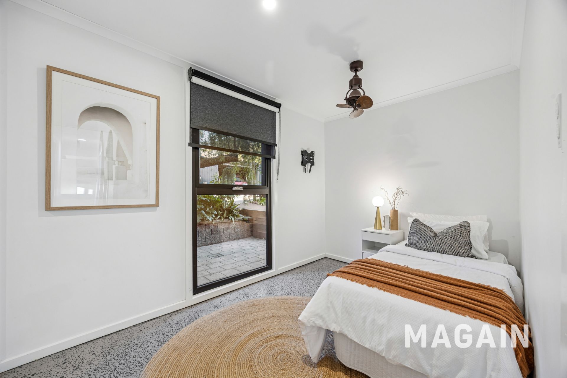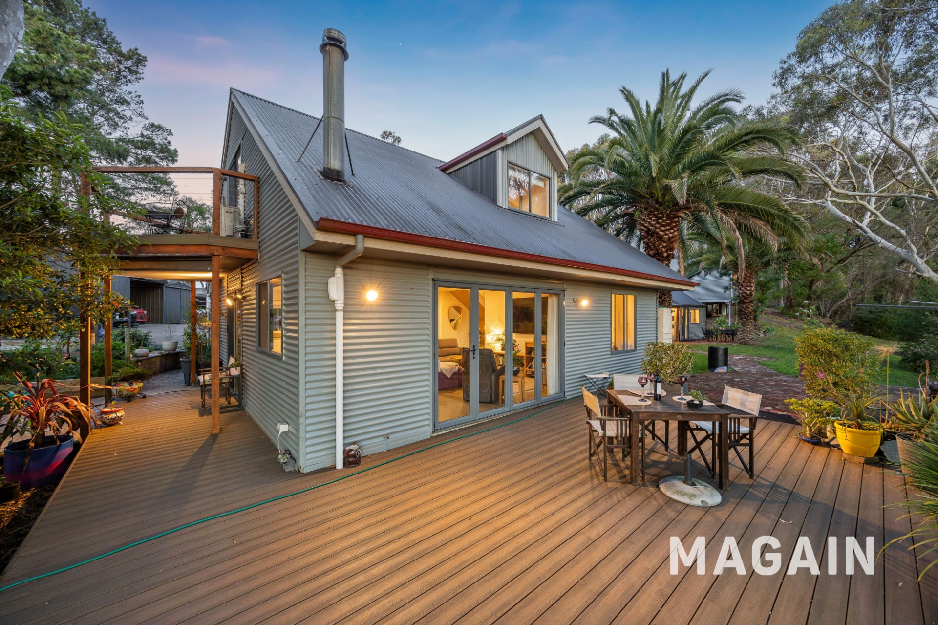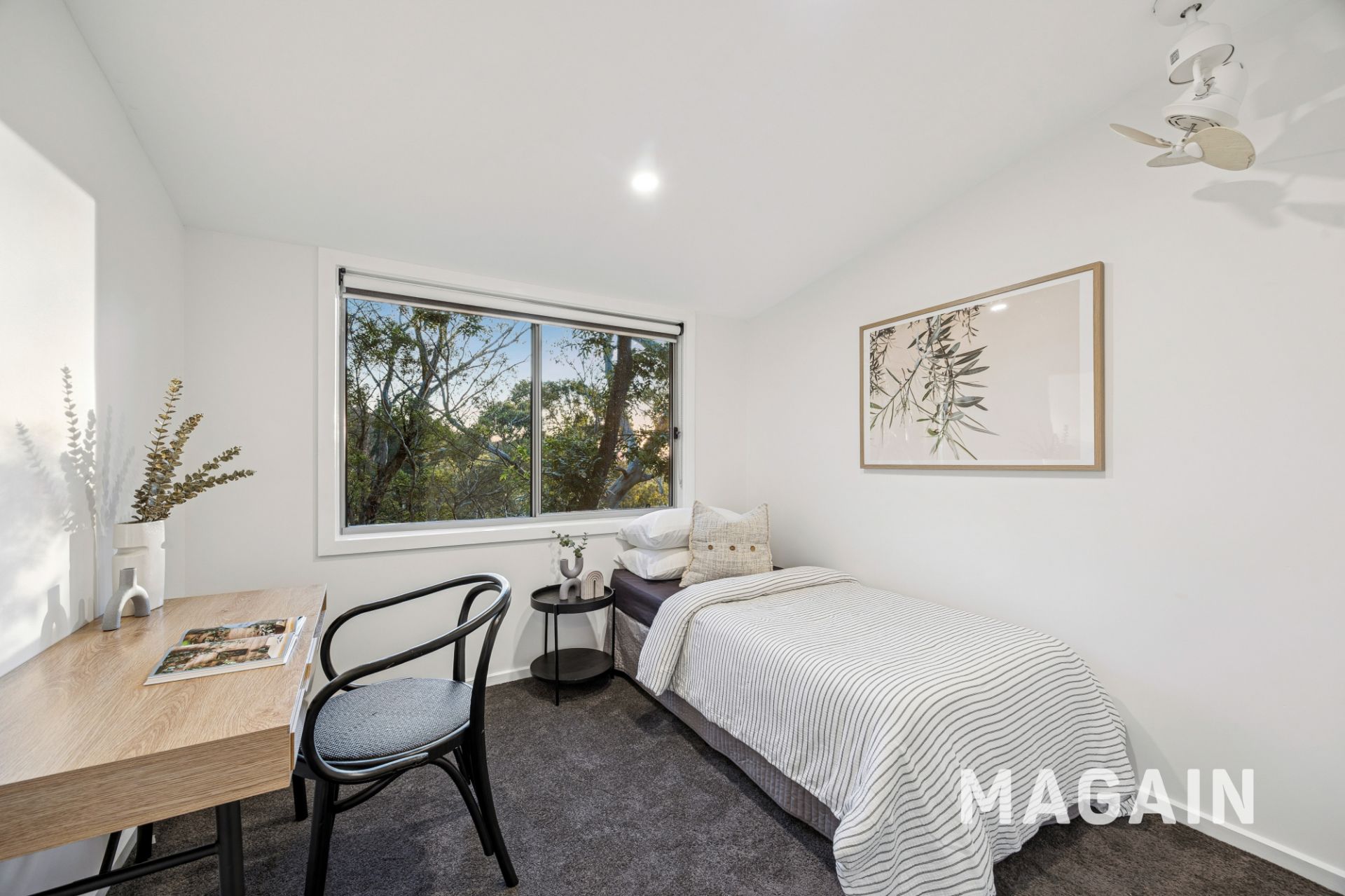 The smaller section of the home exudes comfort and modern flair. The open-plan kitchen, dining, and living area has been thoughtfully updated, complete with a dishwasher, electric cooktop, stone benchtops, and generous storage. A slow combustion heater and bi-fold doors seamlessly connect the interior to a decked entertaining area with tranquil outlooks. The fully renovated bathroom and laundry include a double vanity and quality finishes, while the second bedroom features a built-in robe and is conveniently accessed via a versatile study space. Upstairs, the loft-style main bedroom impresses with a walk-in robe and its own private balcony, perfectly positioned to take in the stunning views.