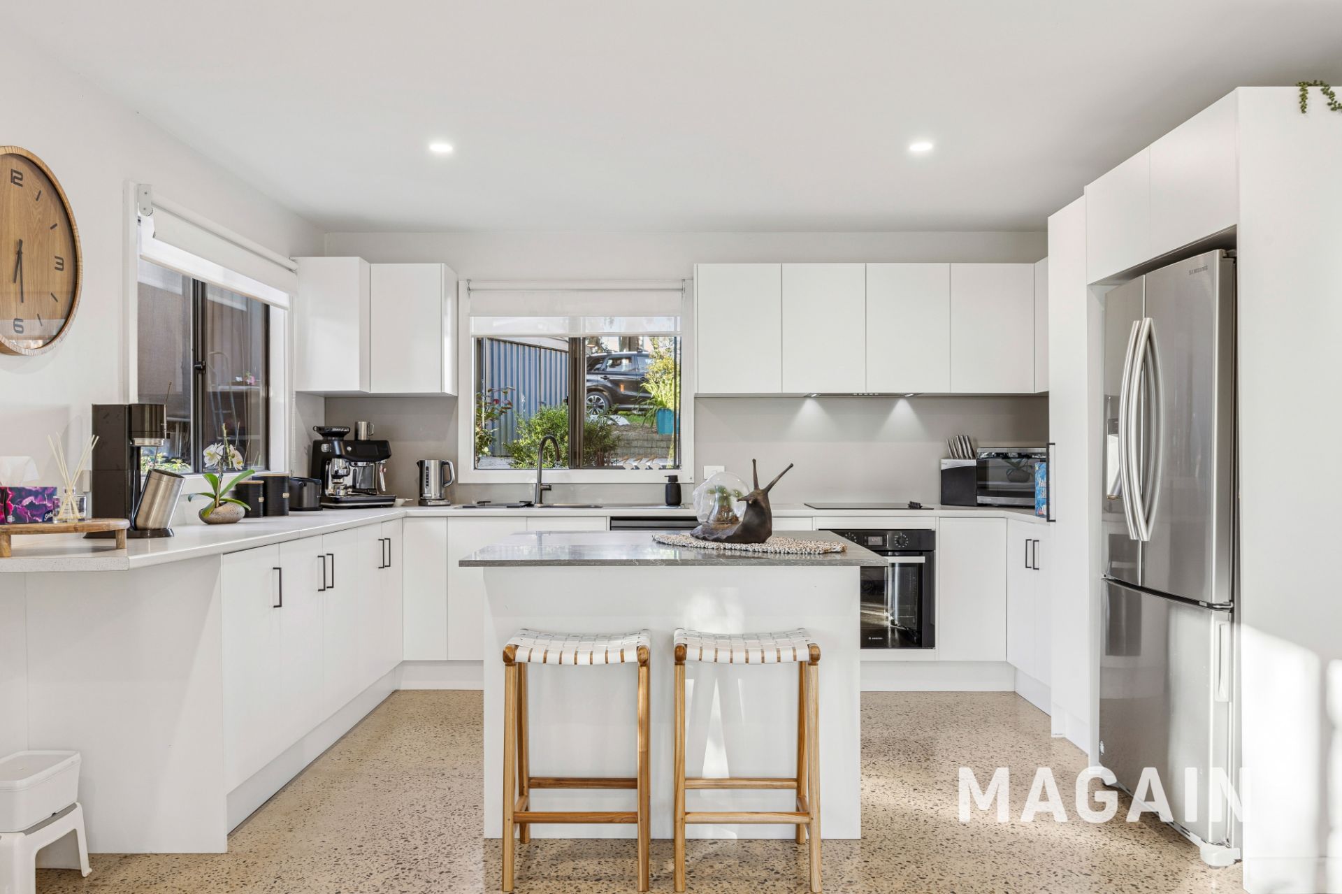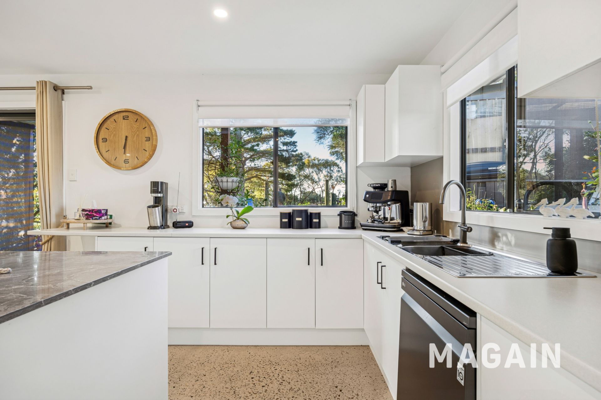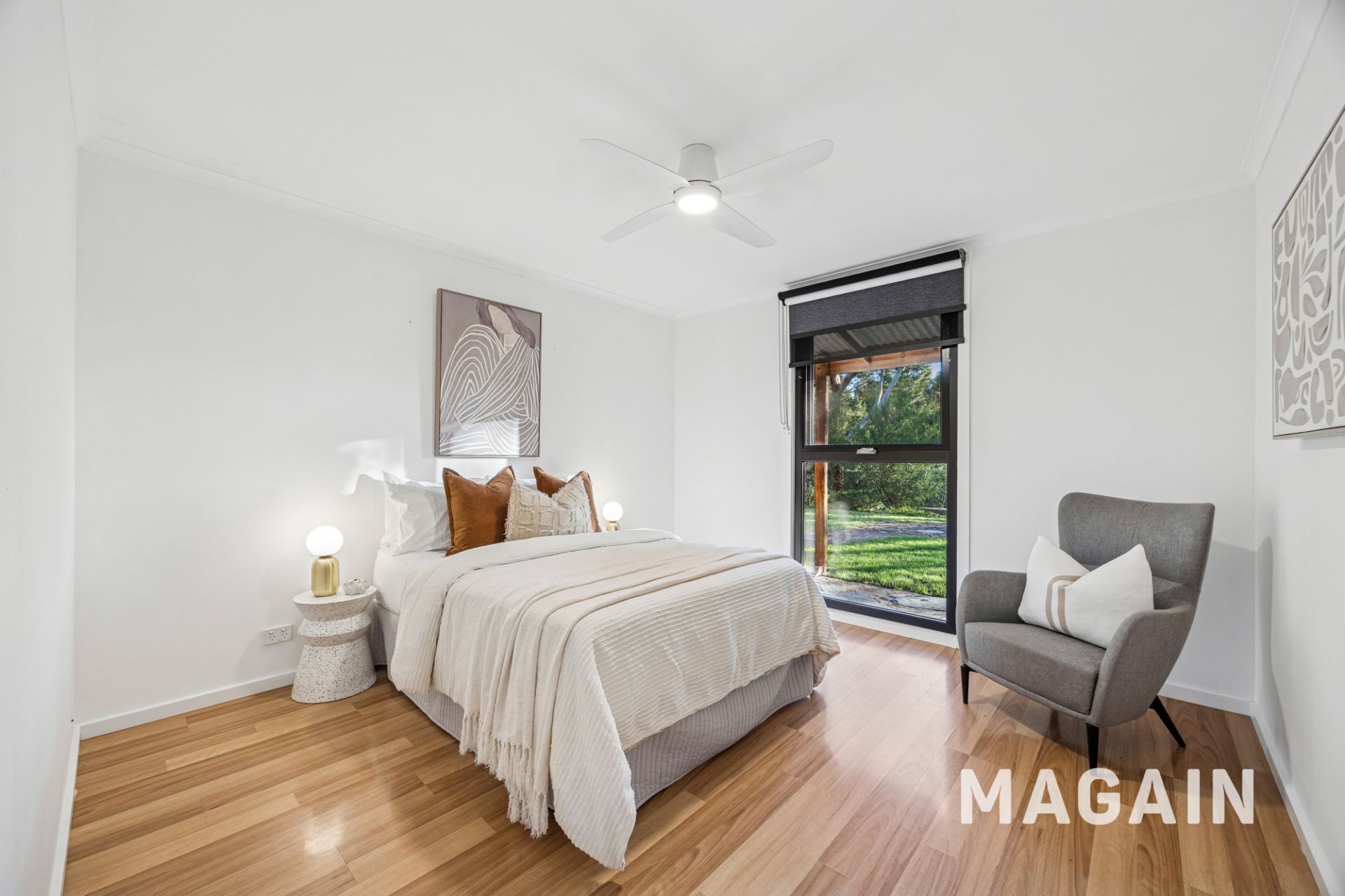 The larger section welcomes you into a light-filled kitchen and dining area with high ceilings and the warmth of a slow combustion heater. The kitchen features a double sink, corner pantry, and dishwasher, offering both practicality and charm. A second family room enjoys a split system, ceiling fan, and expansive double-glazed picture windows that frame the surrounding landscape. An updated laundry, separate toilet, and stylish bathroom with floor-to-ceiling tiling accompany a fourth bedroom on the lower level, providing flexibility for guests or family. Upstairs, a spacious living area with high ceilings, barn door detail, and a split system adds to the comfort. The main bedroom enjoys its own ensuite, built-in robe, and sliding doors opening to a private balcony, while bedrooms two and three both feature ceiling fans and built-in robes.