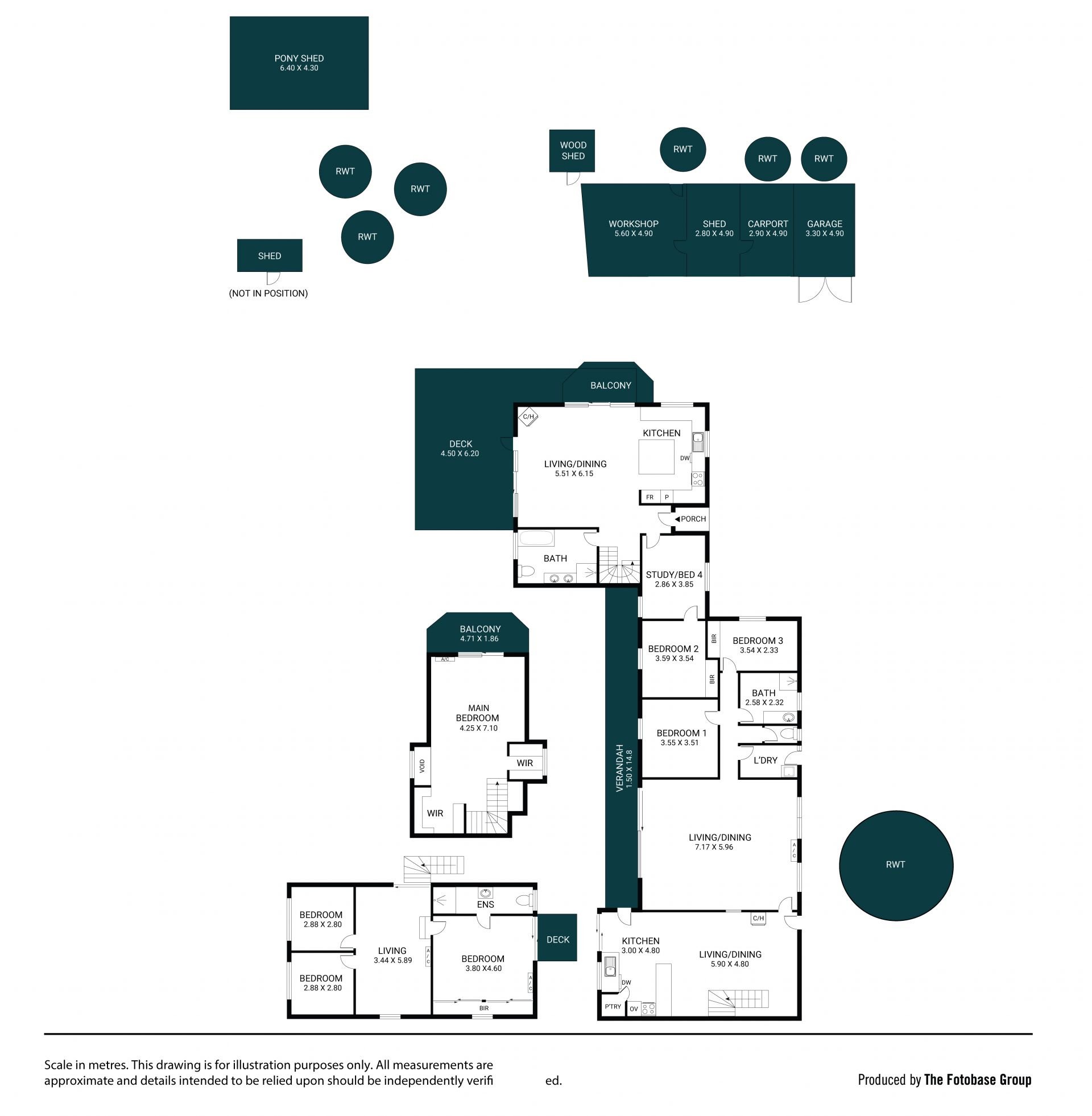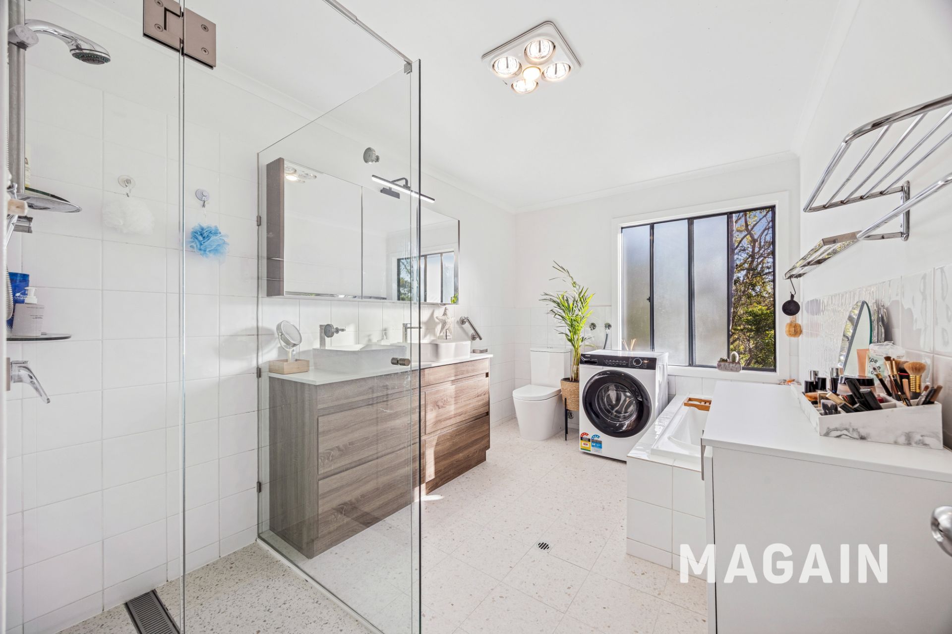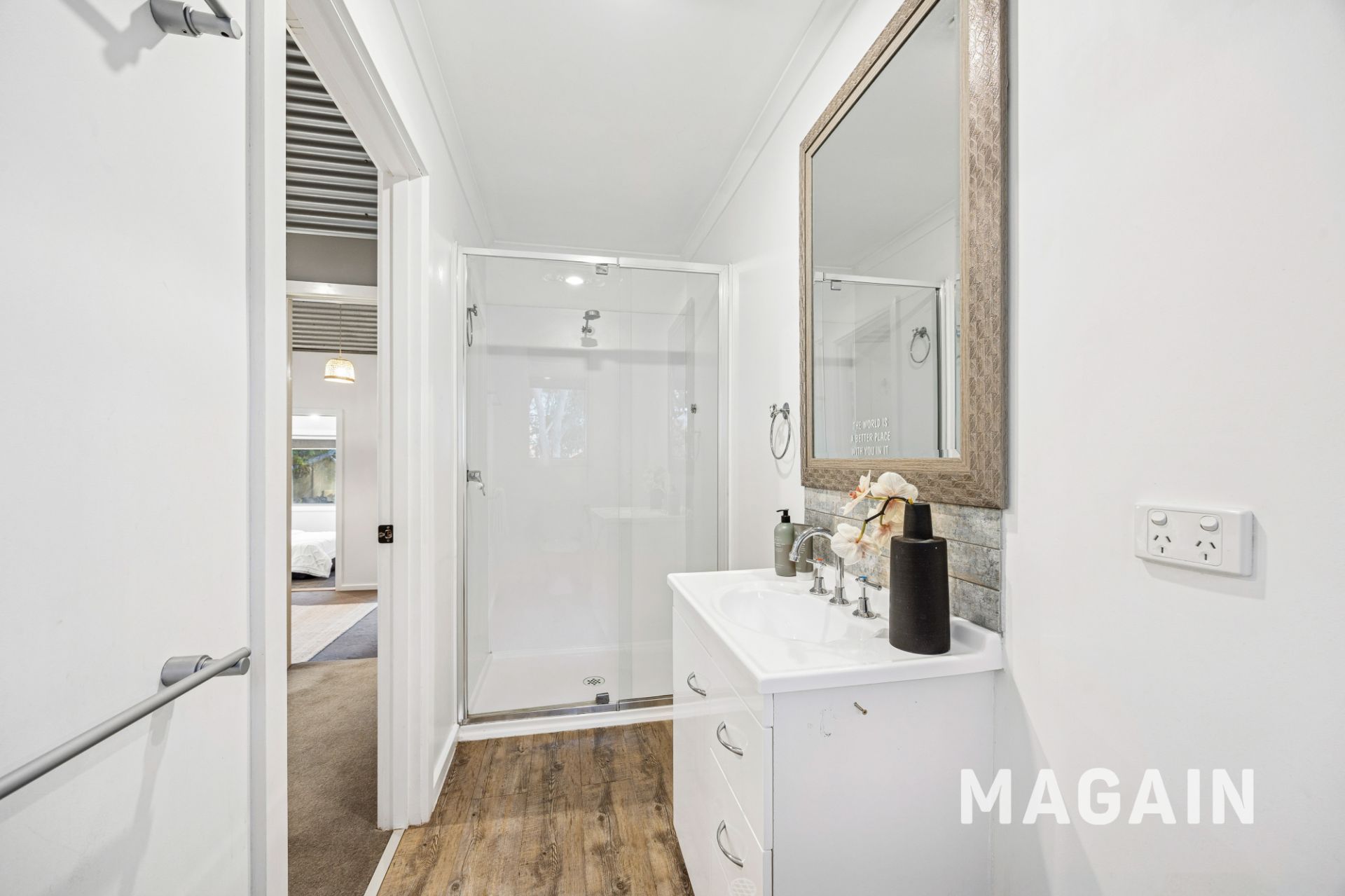 The larger section welcomes you into a light-filled kitchen and dining area with high ceilings and the warmth of a slow combustion heater. The kitchen features a double sink, corner pantry, and dishwasher, offering both practicality and charm. A second family room enjoys a split system, ceiling fan, and expansive double-glazed picture windows that frame the surrounding landscape. An updated laundry, separate toilet, and stylish bathroom with floor-to-ceiling tiling accompany a fourth bedroom on the lower level, providing flexibility for guests or family. Upstairs, a spacious living area with high ceilings, barn door detail, and a split system adds to the comfort. The main bedroom enjoys its own ensuite, built-in robe, and sliding doors opening to a private balcony, while bedrooms two and three both feature ceiling fans and built-in robes.